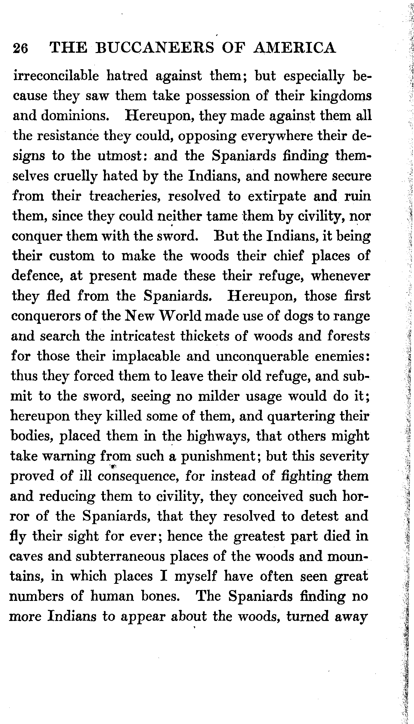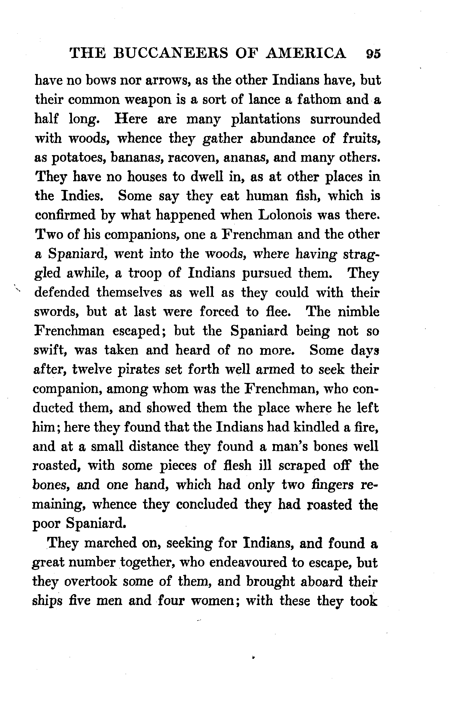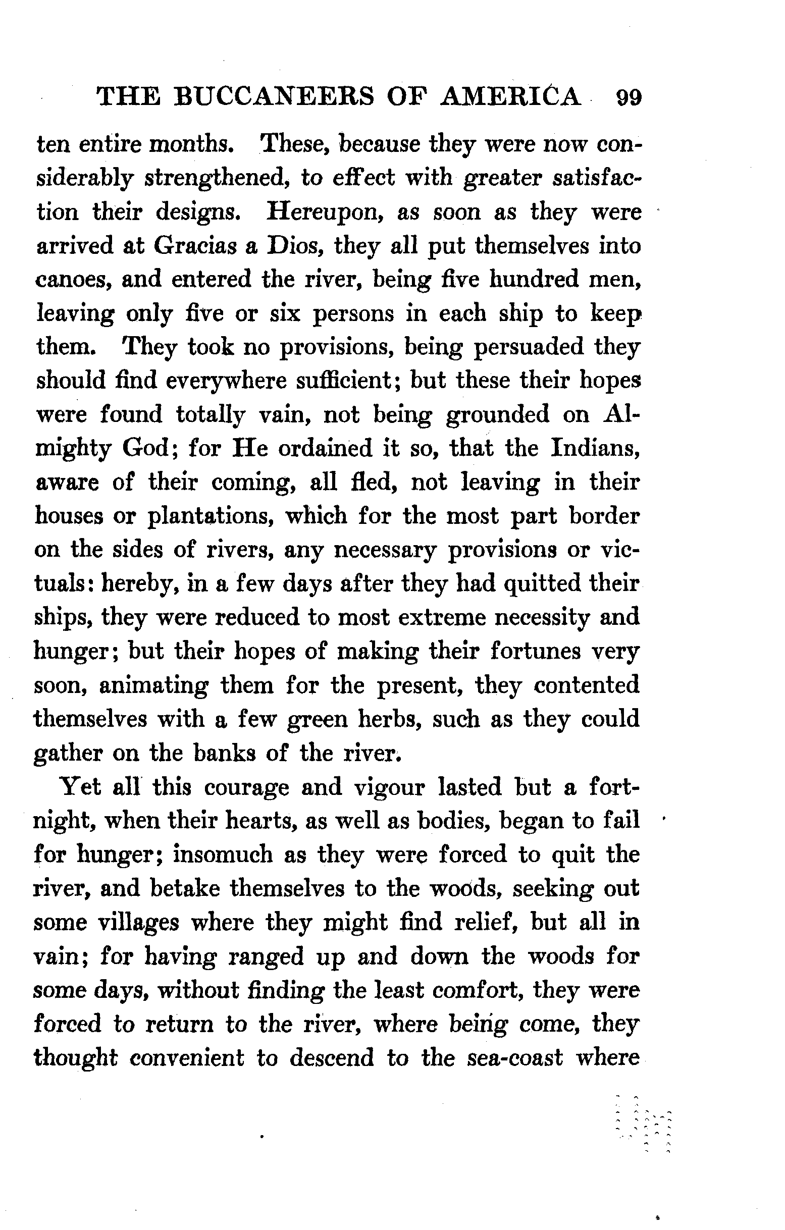 The sixth day they continued their march, part by land and part by water. Howbeit, they were constrained to rest very frequently, both for the ruggedness of the way, and their extreme weakness, which they endeavoured to relieve by eating leaves of trees and green herbs, or grass; such was their miserable condition. This day at noon they arrived at a plantation, where was a barn full of maize. Immediately they beat down the doors and ate it dry, as much as they could devour; then they distributed a great quantity, giving every man a good allowance. Thus provided, and prosecuting their journey for about an hour, they came to another ambuscade. This they no sooner discovered, but they threw away their maize, with the sudden hopes of finding all things in abundance. But they were much deceived, meeting neither Indians nor victuals, nor anything else: but they saw, on the other side of the river, about a hundred Indians, who, all fleeing, escaped. Some few pirates leaped into the river to cross it, and[200] try to take any of the Indians, but in vain: for, being much more nimble than the pirates, they not only baffled them, but killed two or three with their arrows; hooting at them, and crying, "Ha, perros! a la savana, a la savana."—"Ha, ye dogs! go to the plain, go to the plain."