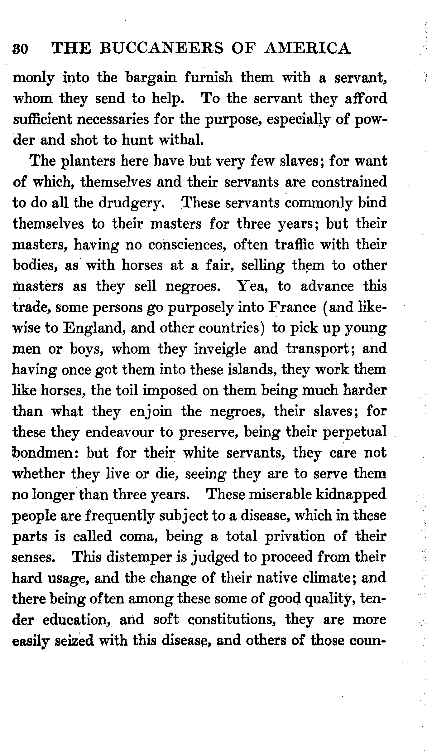 On this occasion I was also sold, being a servant under the said company in whose service I left France: but my fortune was very bad, for I fell into the hands of the most cruel and perfidious man that ever was born, who was then governor, or rather lieutenant-general, of that island. This man treated me with all the hard usage imaginable, yea, with that of hunger, with which I thought I should have perished inevitably. Withal, he was willing to let me buy my freedom and liberty, but not under the rate of three hundred pieces of eight, I not being master of one at a time in the world. At last, through the manifold miseries I endured, as also affliction of mind, I was thrown into a dangerous sickness. This misfortune, added to the rest, was the cause of my happiness: for my wicked master, seeing my condition, began to fear lest he should lose his monies with my life. Hereupon he sold me a second time to a surgeon, for seventy pieces of eight. Being with this second master, I began soon to recover my health through the good usage I received, he being much more humane and civil than my first patron. He gave me both clothes and very good food; and after I had served him but one year,[18] he offered me my liberty, with only this condition, that I should pay him one hundred pieces of eight when I was in a capacity so to do; which kind proposal of his I could not but accept with infinite joy and gratitude.