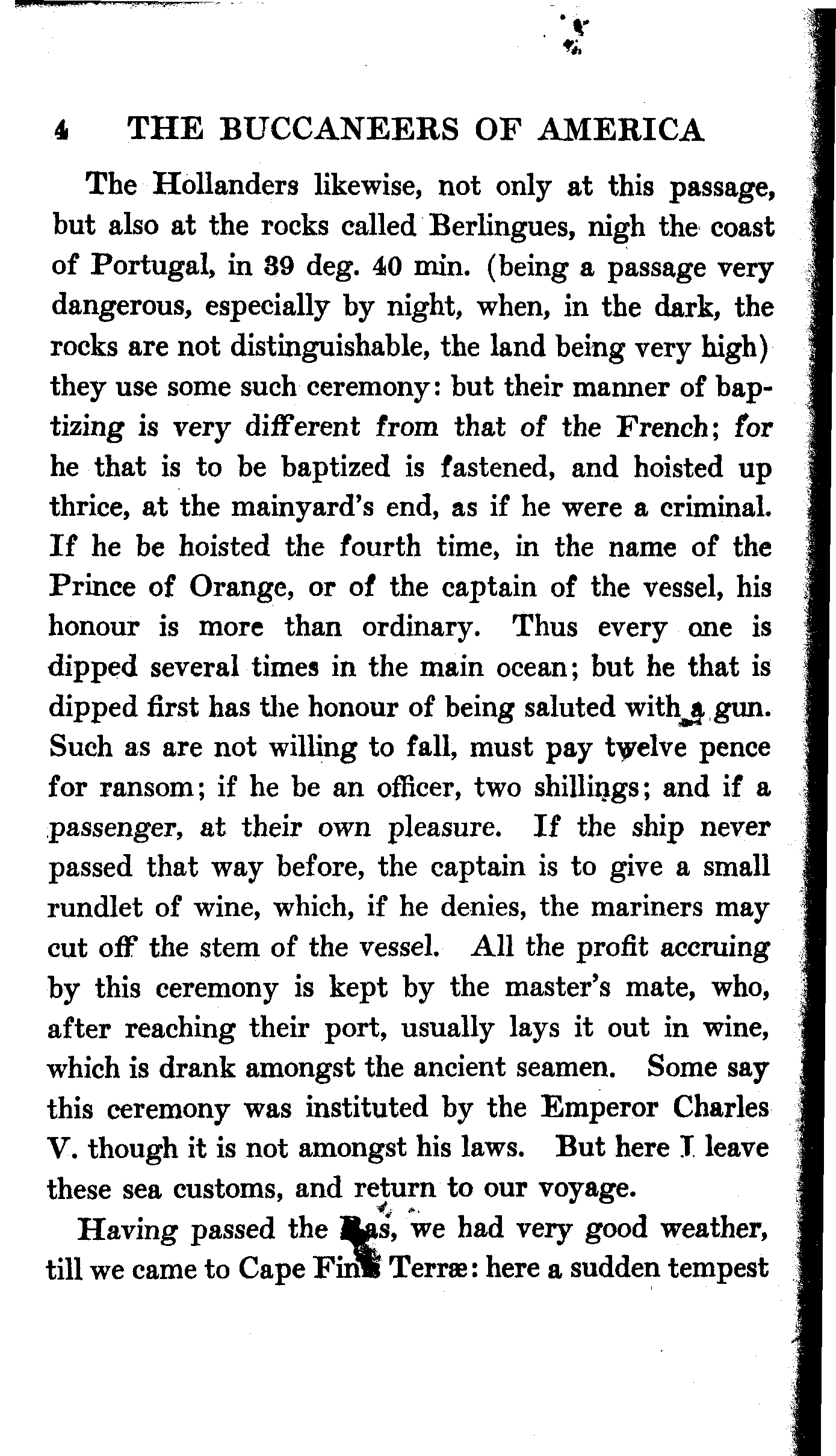 The Hollanders likewise, not only at this passage, but also at the rocks called Berlingues, nigh the coast of Portugal, in 39 deg. 40 min. (being a passage very dangerous, especially by night, when, in the dark, the rocks are not distinguishable, the land being very high) they use some such ceremony: but their manner of baptizing is very different from that of the French; for he that is to be baptized is fastened, and hoisted up thrice, at the mainyard's end, as if he were a criminal. If he be hoisted the fourth time, in the name of the Prince of Orange, or of the captain of the vessel, his honour is more than ordinary. Thus every one is dipped several times in the main ocean; but he that is dipped first has the honour of being saluted with a gun. Such as are not willing to fall, must pay twelve pence for ransom; if he be an officer, two shillings; and if a passenger, at their own pleasure. If the ship never passed that way before, the captain is to give a small rundlet of wine, which, if he denies, the mariners may cut off the stem of the vessel. All the profit accruing by this ceremony is kept by the master's mate, who, after reaching their port, usually lays it out in wine, which is drank amongst the ancient seamen. Some say this ceremony was instituted by the Emperor Charles V. though it is not amongst his laws. But here I leave these sea customs, and return to our voyage.