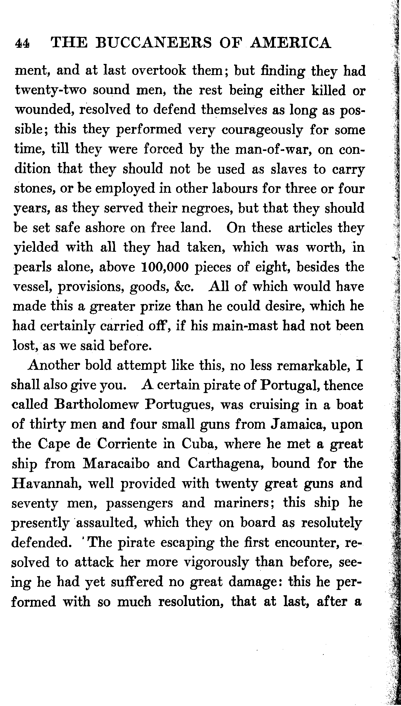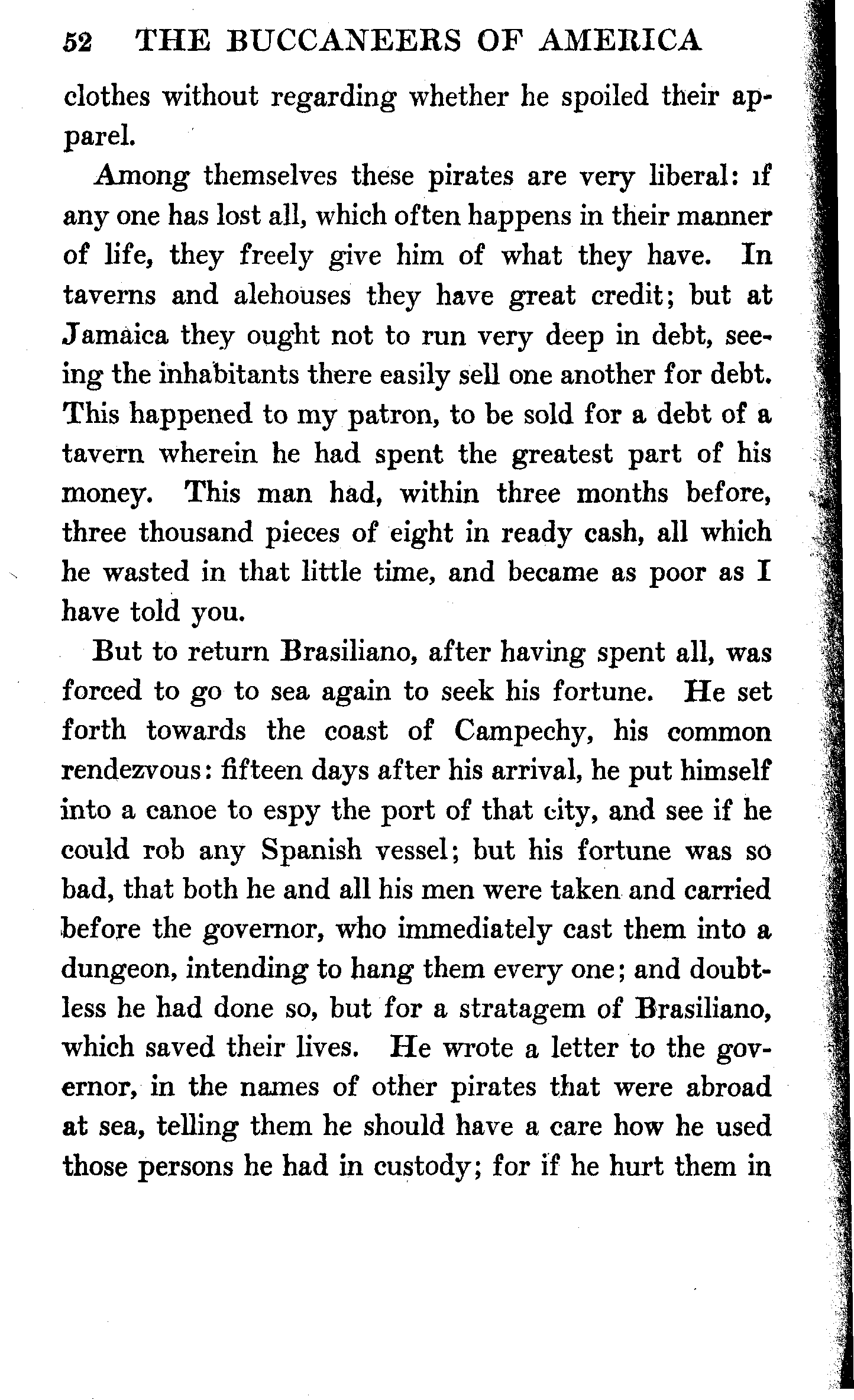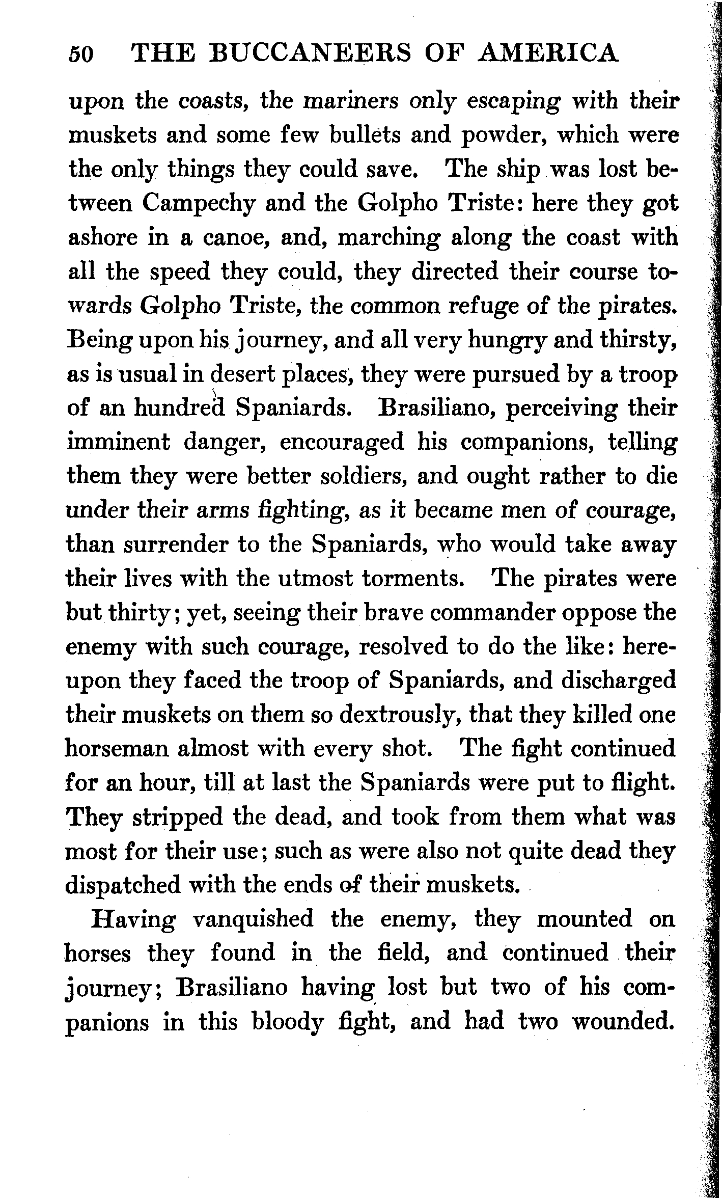 Once more a free man he determined to join the pirates and was received into their society and remained with them until 1672. Esquemeling served the Buccaneers in the capacity of barber-surgeon, and was present at all their exploits. Little did he suspect that his first hand observations would some day be cherished as the only authentic and true history of the Buccaneers and Marooners of the Spanish Main.