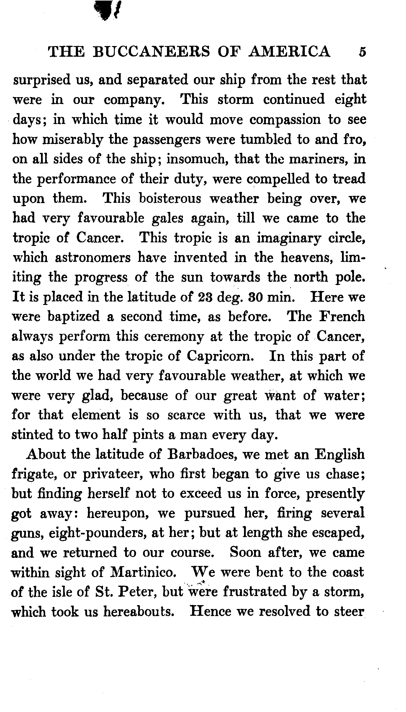 Being now at liberty, though like Adam when he was first created—that is, naked and destitute of all human necessaries—not knowing how to get my living, I determined to enter into the order of the pirates or robbers at sea. Into this society I was received with common consent, both of the superior and vulgar sort, where I continued till 1672. Having assisted them in all their designs and attempts, and served them in many notable exploits (of which hereafter I shall give the reader a true account), I returned to my own native country. But before I begin my relation, I shall say something of the island Hispaniola, which lies towards the western part of America; as also give my reader a brief description thereof, according to my slender ability and experience.[19]
