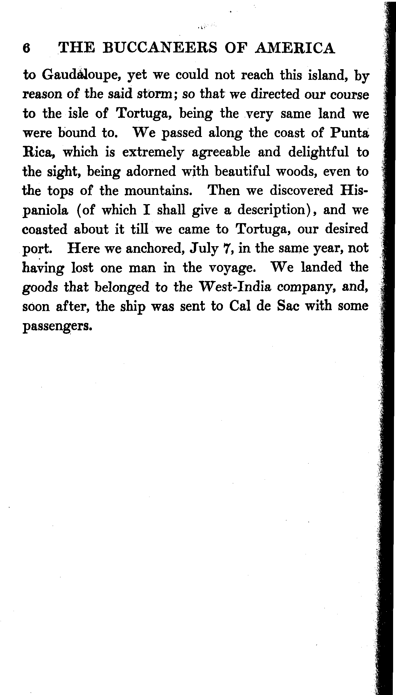 About the latitude of Barbadoes, we met an English frigate, or privateer, who first began to give us chase; but finding herself not to exceed us in force, presently got away: hereupon, we pursued her, firing several guns, eight-pounders, at her; but at length she escaped, and we returned to our course. Soon after, we came within sight of Martinico. We were bent to the coast of the isle of St. Peter, but were frustrated by a storm, which took us hereabouts. Hence we resolved to steer[6] to Gaudaloupe, yet we could not reach this island, by reason of the said storm; so that we directed our course to the isle of Tortuga, being the very same land we were bound to. We passed along the coast of Punta Rica, which is extremely agreeable and delightful to the sight, being adorned with beautiful woods, even to the tops of the mountains. Then we discovered Hispaniola (of which I shall give a description), and we coasted about it till we came to Tortuga, our desired port. Here we anchored, July 7, in the same year, not having lost one man in the voyage. We landed the goods that belonged to the West-India company, and, soon after, the ship was sent to Cal de Sac with some passengers.[7]