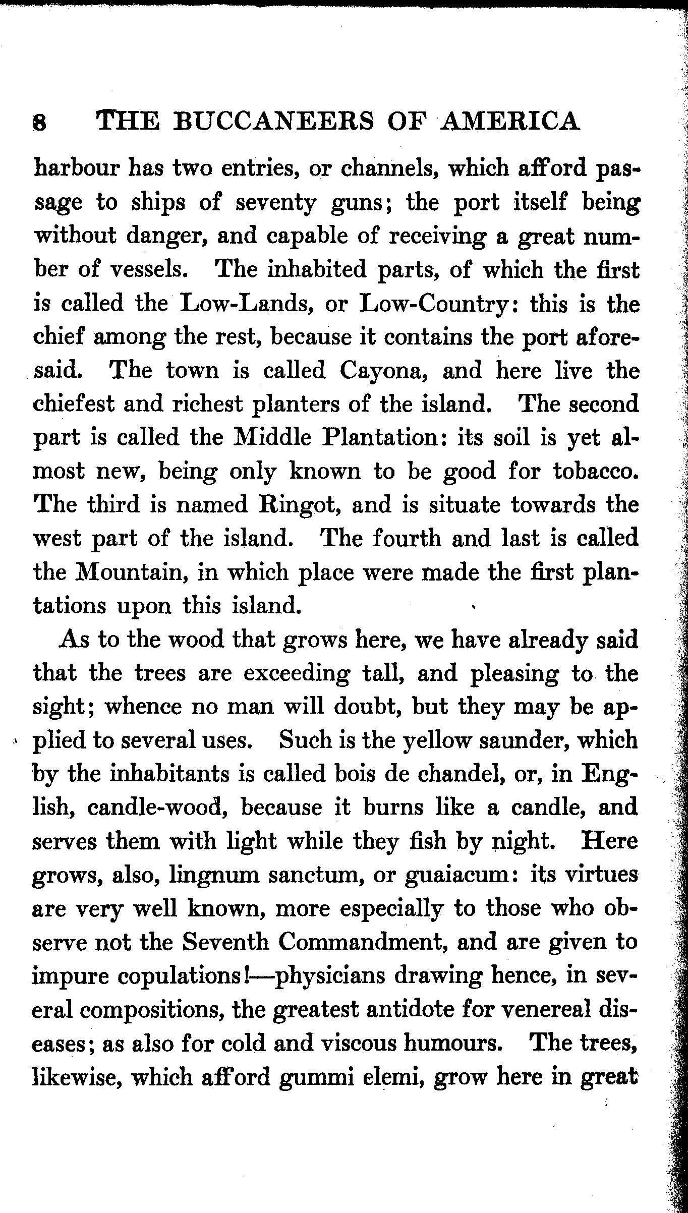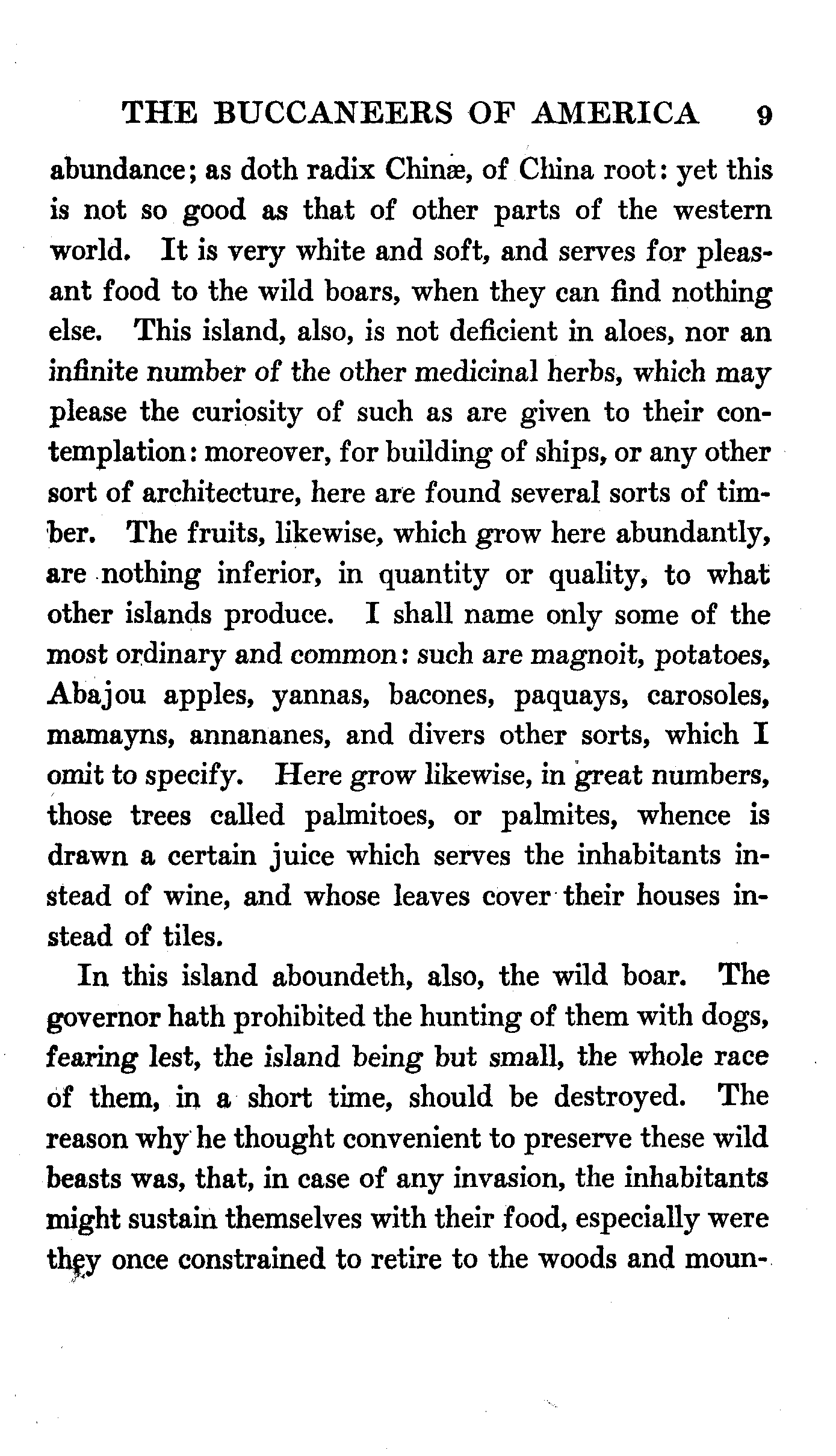 As to the wood that grows here, we have already said that the trees are exceeding tall, and pleasing to the sight; whence no man will doubt, but they may be applied to several uses. Such is the yellow saunder, which by the inhabitants is called bois de chandel, or, in English, candle-wood, because it burns like a candle, and serves them with light while they fish by night. Here grows, also, lingnum sanctum, or guaiacum: its virtues are very well known, more especially to those who observe not the Seventh Commandment, and are given to impure copulations!—physicians drawing hence, in several compositions, the greatest antidote for venereal diseases; as also for cold and viscous humours. The trees, likewise, which afford gummi elemi, grow here in great[9] abundance; as doth radix Chinæ, or China root: yet this is not so good as that of other parts of the western world. It is very white and soft, and serves for pleasant food to the wild boars, when they can find nothing else. This island, also, is not deficient in aloes, nor an infinite number of the other medicinal herbs, which may please the curiosity of such as are given to their contemplation: moreover, for building of ships, or any other sort of architecture, here are found several sorts of timber. The fruits, likewise, which grow here abundantly, are nothing inferior, in quantity or quality, to what other islands produce. I shall name only some of the most ordinary and common: such are magnoit, potatoes, Abajou apples, yannas, bacones, paquays, carosoles, mamayns, annananes, and divers other sorts, which I omit to specify. Here grow likewise, in great numbers, those trees called palmitoes, or palmites, whence is drawn a certain juice which serves the inhabitants instead of wine, and whose leaves cover their houses instead of tiles.