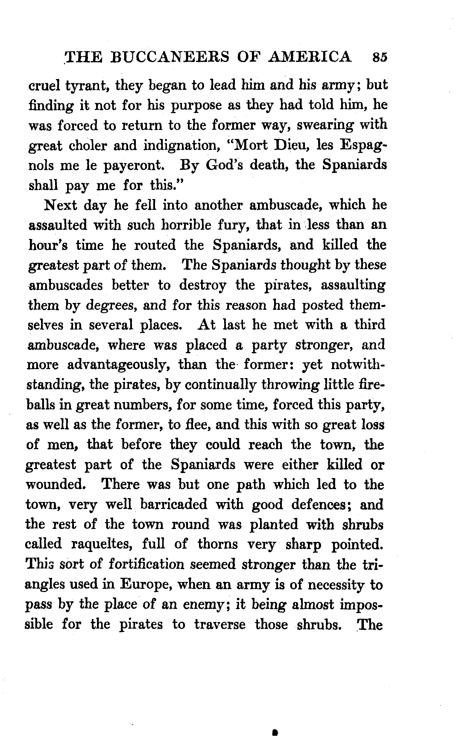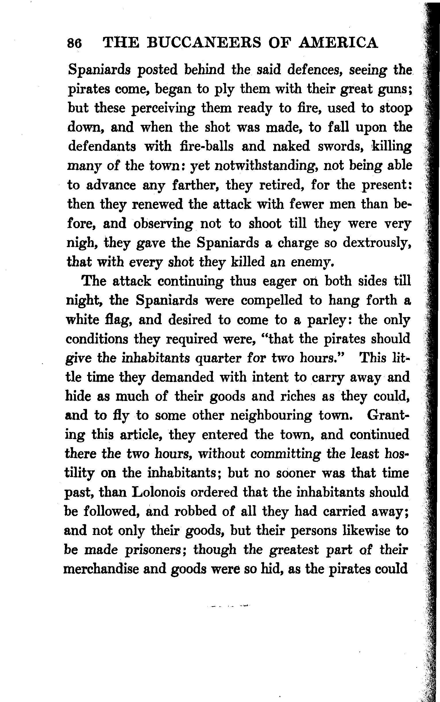 Next, as to the personal Valour of many of their Commanders, What man ever behaved himself more briskly than the Governour of Gibraltar, than the Governour of Puerto del Principe, both dying for the defence of their Towns; than Don Alonso del Campo, and[xxii] others? Or what examples can easily parallel the desperate courage of the Governour of Chagre? who, though the Palizda's were fired, the Terraplens were sunk into the Ditch, the Breaches were entred, the Houses all burnt above him, the whole Castle taken, his men all killed; yet would not admit of any quarter, but chose rather to die under his Arms, being shot into the brain, than surrender himself as a Prisoner unto the Bucaniers. What lion ever fought to the last gasp more obstinately than the Governour of Puerto Velo? who, seeing the Town enter'd by surprizal in the night, one chief Castle blown up into the Air, all the other Forts and Castles taken, his own assaulted several ways, both Religious men and women placed at the front of the Enemy to fix the Ladders against the Walls; yet spared not to kill as many of the said Religious persons as he could. And at last, the walls being scaled, the Castle enter'd and taken, all his own men overcome by fire and sword, who had cast down their Arms, and begged mercy from the Enemy; yet would admit of none for his own life. Yet, with his own hands killed several of his Souldiers, to force them to stand to their Arms, though all were lost. Yea, though his own Wife and Daughter begged of him upon their knees that he would have his life by craving quarter, though the Enemy desired of him the same thing; yet would hearken to no cries nor perswasions, but they were forced to kill him, combating with his Arms in his hands,[xxiii] being not otherwise able to take him Prisoner, as they were desirous to do. Shall these men be said to be influenced with Cowardize, who thus acted to the very last Scene of their own Tragedies? Or shall we rather say that they wanted no Courage, but Fortune? It being certainly true, that he who is killed in a Batel, may be equally couragious with him that killeth. And that whosoever derogateth from the Valour of the Spaniards in the West-Indies, diminisheth in like manner the Courage of the Bucaniers, his own Country-men, who have seemed to act beyond mortal men in America.