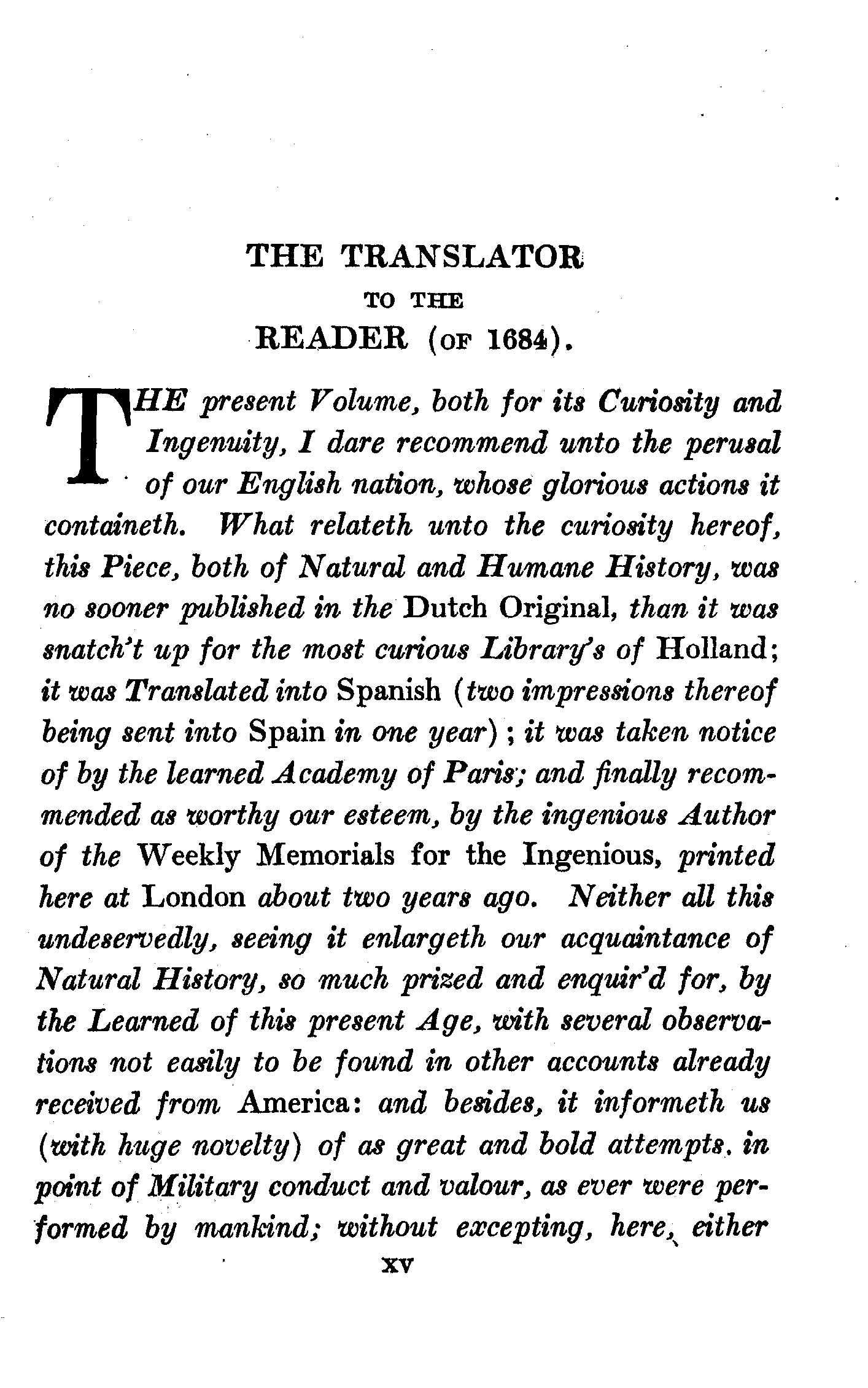 Besides the merits of this Piece for its curiosity, another point of no less esteem, is the truth and sincerity wherewith everything seemeth to be penned. No greater ornament or dignity can be added unto History, either humane or natural, than truth. All other embellishments, if this be failing, are of little or no esteem; if this be delivered, are either needless or superfluous. What concerneth this requisite in our Author, his lines do everywhere declare the faithfulness and sincerity of his mind. He writeth not by hearsay, but was an eye witness, as he somewhere telleth you, unto all and every one of the bold and hazardous attempts which he relateth. And these he delivereth with such candour of stile, such ingenuity of mind, such plainness of words, such conciseness of periods, so much divested of Rhetorical Hyperboles, or the least flourishes of Eloquence, so hugely void of Passion or national Reflections, as that he strongly perswadeth all-along to the credit of what he saith; yea, raiseth the mind of the Reader to believe these things far greater than what he hath said; and having read him, leaveth onely this scruple or concern behind, that you can read him no longer. In a word, such are his deserts, that some persons peradventure would not stickle to compare him to the Father[xviii] of Historians, Philip de Comines; at least thus much may be said, with all truth imaginable, that he resembleth that great Author in many of his excellent qualities.