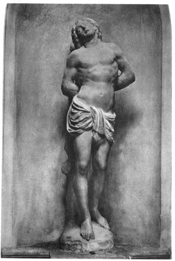 Now Cosimo de' Medici, having received many antiquities from Rome, had caused to be set up within the door of his garden, or rather, courtyard, which opens on the Via de' Ginori, a very beautiful Marsyas of white marble, bound to a tree-trunk and ready to be flayed; and his grandson[Pg 272] Lorenzo, into whose hands there had come the torso and head of another Marsyas, made of red stone, very ancient, and much more beautiful than the first, wished to set it beside the other, but could not, because it was so imperfect. Thereupon he gave it to Andrea to be restored and completed, and he made the legs, thighs, and arms that were lacking in this figure out of pieces of red marble, so well that Lorenzo was highly satisfied and had it placed opposite to the other, on the other side of the door. This ancient torso, made to represent a flayed Marsyas, was wrought with such care and judgment that certain delicate white veins, which were in the red stone, were carved by the craftsman exactly in the right places, so as to appear to be little nerves, such as are seen in real bodies when they have been flayed; which must have given to that work, when it had its original finish, a most life-like appearance.