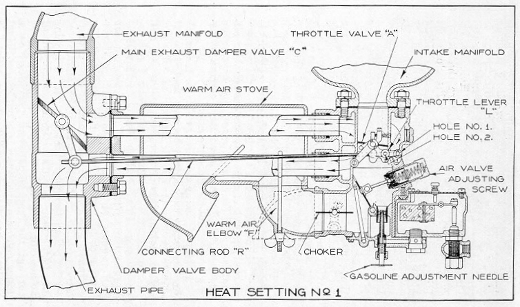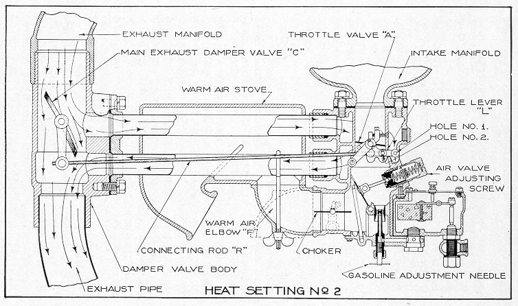 By referring to the cut shown (See Page 5) and noting "Heat Setting No. 1," it will be noted that valve "C" in main exhaust line is fully closed with the closed or idling position of the throttle valve. This adjustment is accomplished by having long connecting rod "R" from valve "C" Lever set in "Hole No. 1," in Throttle Lever "L," being sure that when throttle valve is standing in fully closed or idling position that valve "C" is also in closed position, proving out the latter feature by loosening connection of valve "C" lever holding long connecting rod; holding Throttle Lever "L" in closed or idling position and bringing up valve "C" lever on connecting rod "R" as far as it will go to the right toward the carbureter and tightening its connection on the connecting rod in that position. After having made the adjustment as just described, it is assured that "Heat Setting No. 1" has been properly made and that all of the heat possible from the exhaust has been secured.