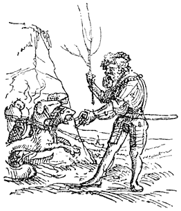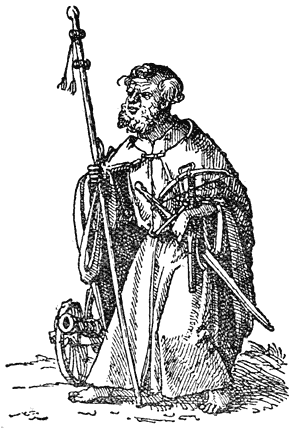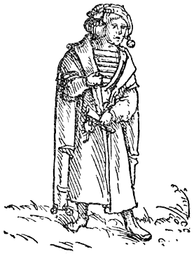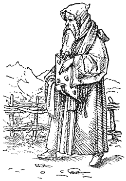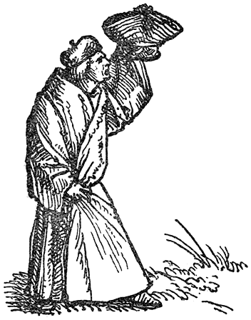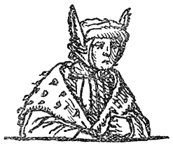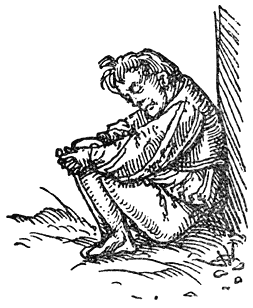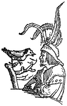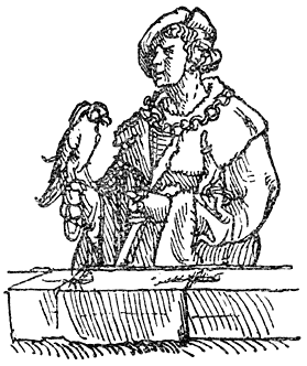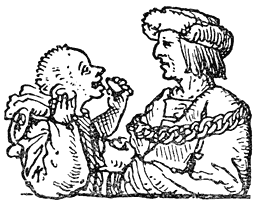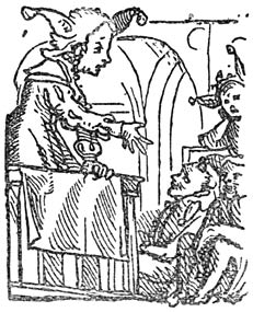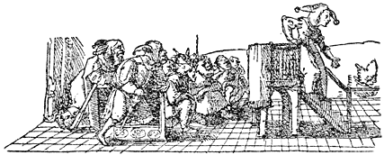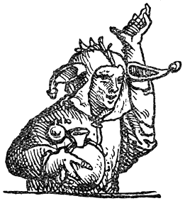 Een enkel woord over de in deze uitgave opgenomen penteekeningen van Holbein: Hans Holbein, de jongere, 1497–1543, woonde gedurende de eerste jaren van zijn werkzaamheid in Bazel, waar Erasmus zich met voorliefde placht op te houden en waar hij ook gestorven is. In een exemplaar van “de Lof der Zotheid,” door den Bazelschen drukker Froben in 1514 uitgegeven, dat voor Erasmus persoonlijk bestemd was, heeft Holbein—die met Erasmus op goeden voet stond—op den rand der bladzijden een aantal geestige illustraties aangebracht. Het boek berust thans in het museum van Bazel. Aan dit werk heeft de schilder, zooals uit een aanteekening op een blad van het exemplaar blijkt, slechts tien dagen besteed. En zoo heeft hij natuurlijk niet zorgvuldig gewikt en gewogen, wat van den inhoud meer in het bijzonder in aanmerking kwam [8]om te worden in beeld gebracht, maar slechts de voorstelling, die een woord of zegswijze voor zijn schildersoog deed oprijzen, met losse hand op het papier geworpen. Vandaar, dat de plaatjes2 dikwijls zoo ongelijkmatig zijn verdeeld. Een enkele maal zelfs bekommert Holbein zich in het geheel niet om den tekst, maar illustreert den commentaar van Listrius, die ook in bovengenoemd exemplaar was afgedrukt.