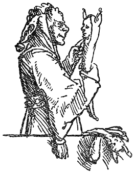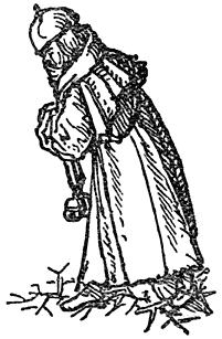 1 Het deftige personage op het prentje (een raadsheer of iets dergelijks) kan niet nalaten naar het aardige meisje om te kijken, zoodat hij in een mand met koopwaar trapt.