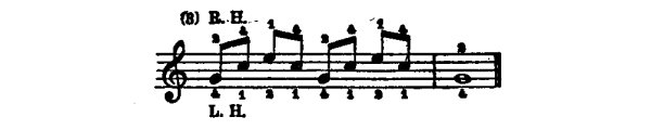 "I ofttimes find it expedient to adapt a more difficult fingering of some given passage for the reason that the difficult fingering frequently leads to a better interpretation of the composer's meaning. I know of innumerable passages in the piano classics which illustrate this point. Moreover a fingering that seems difficult at first is often more simple than the conventional or arbitrary fingering employed[276] by the student, after the student has given sufficient time to the new fingering. The required accent often obliges the performer to employ a different fingering. The stronger fingers are naturally better adapted to the stronger accents. Otherwise it is best to use a similar fingering for similar passages.