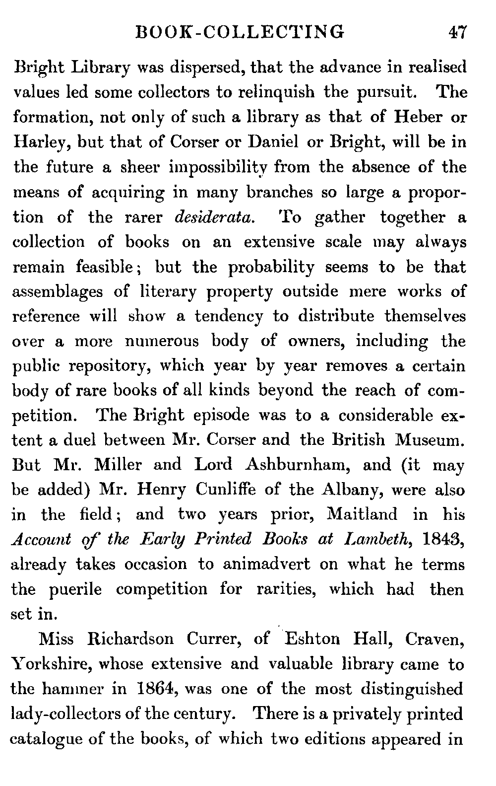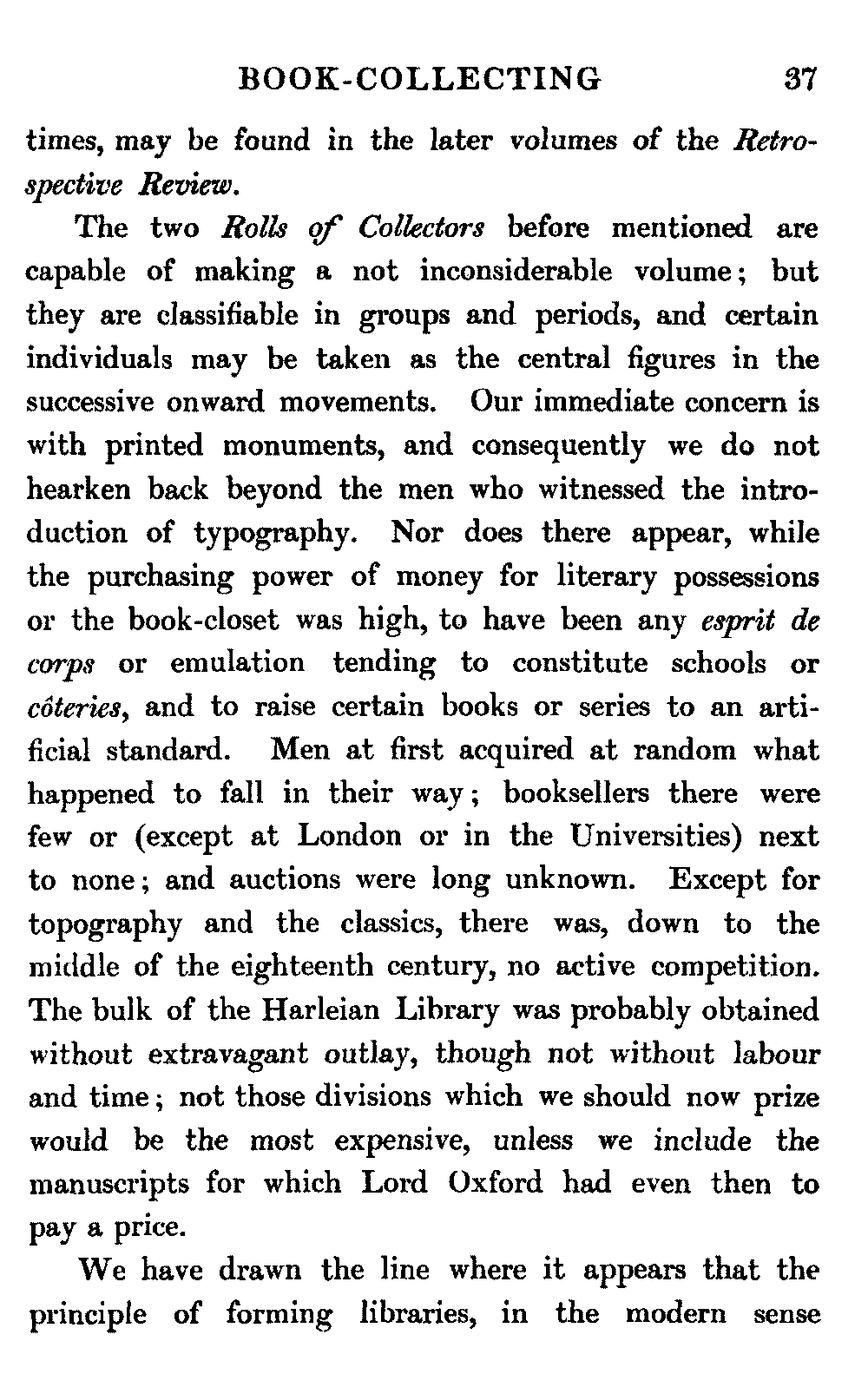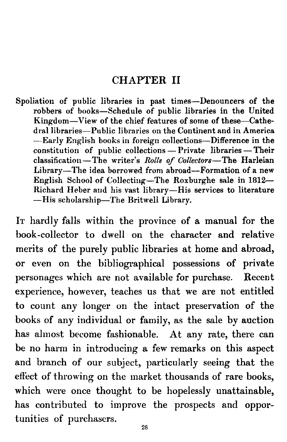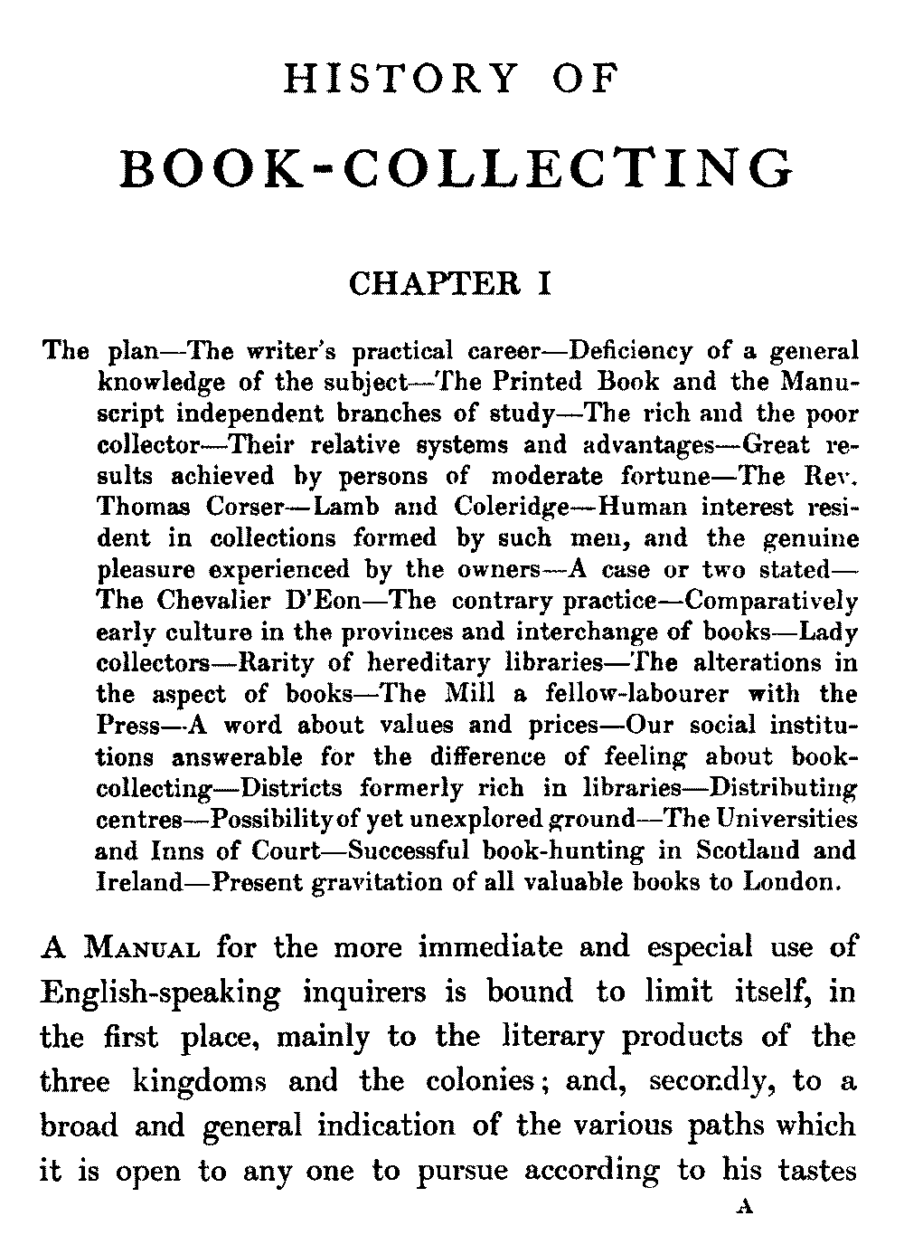 The plan—The writer's practical career—Deficiency of a general knowledge of the subject—The Printed Book and the Manuscript independent branches of study—The rich and the poor collector—Their relative systems and advantages—Great results achieved by persons of moderate fortune—The Rev. Thomas Corser—Lamb and Coleridge—Human interest resident in collections formed by such men, and the genuine pleasure experienced by the owners—A case or two stated—The Chevalier D'Eon—The contrary practice—Comparatively early culture in the provinces and interchange of books—Lady collectors—Rarity of hereditary libraries—The alterations in the aspect of books—The Mill a fellow-labourer with the Press—A word about values and prices—Our social institutions answerable for the difference of feeling about book-collecting—Districts formerly rich in libraries—Distributing centres—Possibility of yet unexplored ground—The Universities and Inns of Court—Successful book-hunting in Scotland and Ireland—Present gravitation of all valuable books to London.