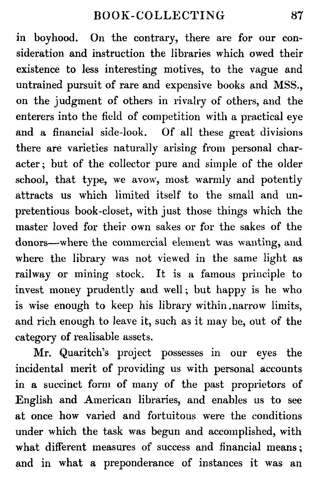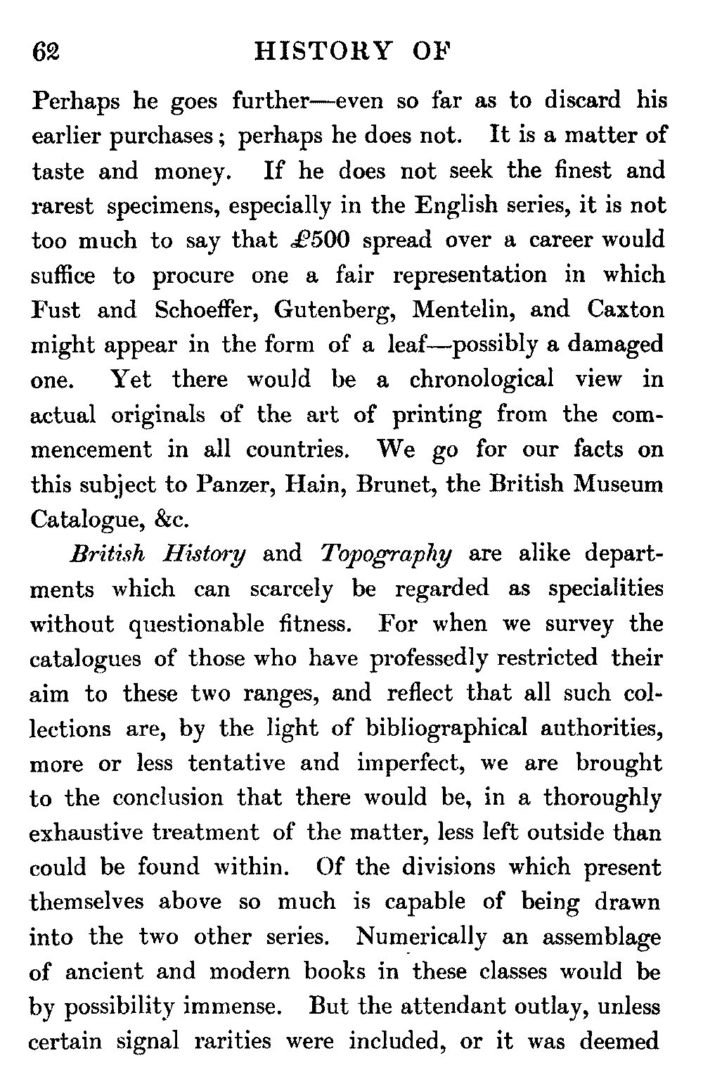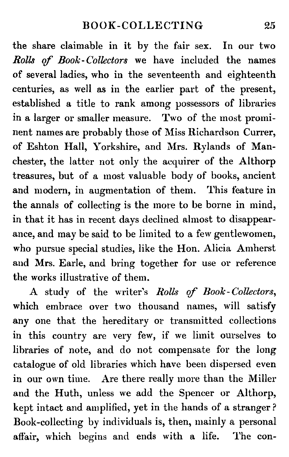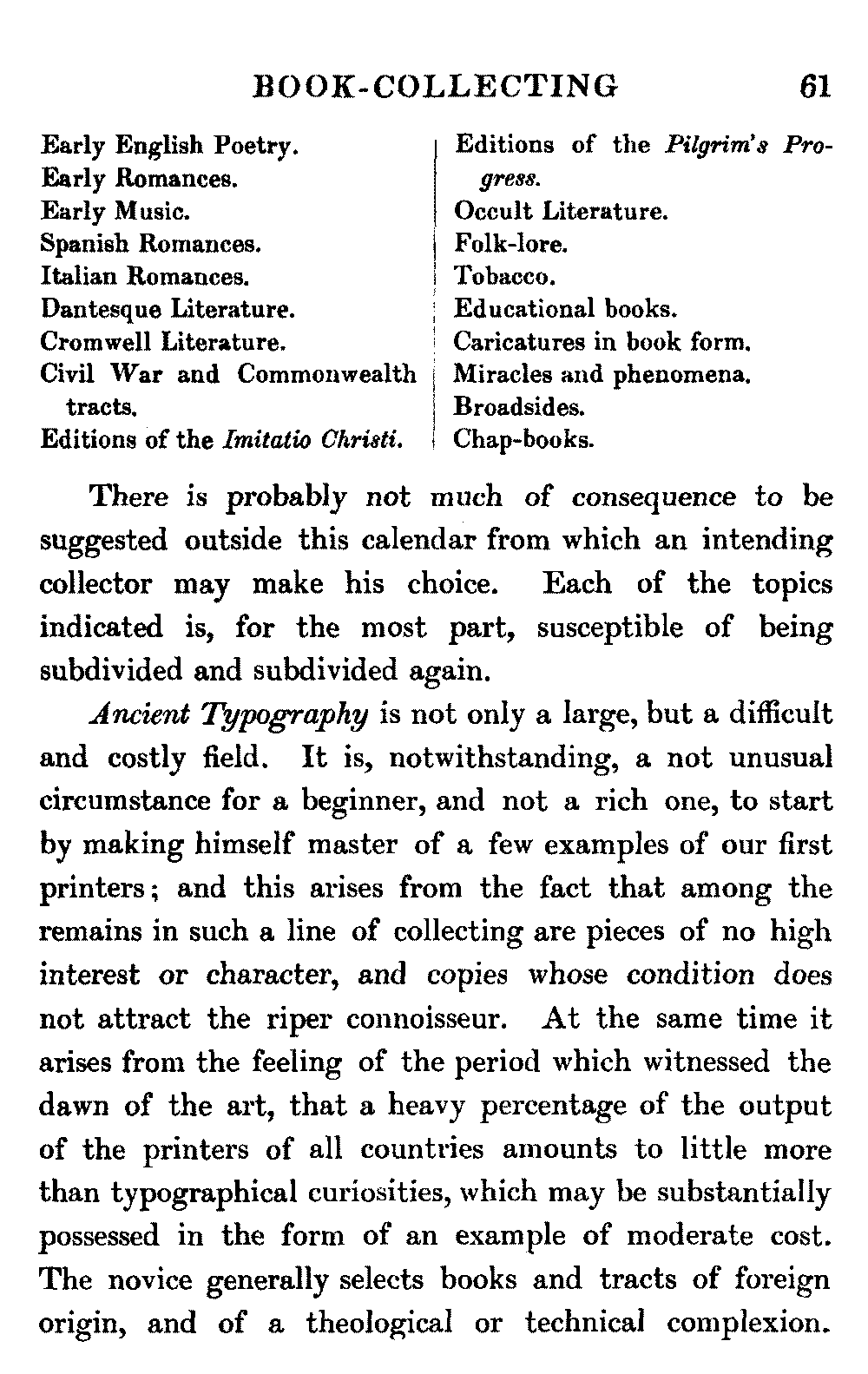 The plan—The writer's practical career—Deficiency of a general knowledge of the subject—The Printed Book and the Manuscript independent branches of study—The rich and the poor collector—Their relative systems and advantages—Great results achieved by persons of moderate fortune—The Rev. Thomas Corser—Lamb and Coleridge—Human interest resident in collections formed by such men, and the genuine pleasure experienced by the owners—A case or two stated—The Chevalier D'Eon—The contrary practice—Comparatively early culture in the provinces and interchange of books—Lady collectors—Rarity of hereditary libraries—The alterations in the aspect of books—The Mill a fellow-labourer with the Press—A word about values and prices—Our social institutions answerable for the difference of feeling about book-collecting—Districts formerly rich in libraries—Distributing centres—Possibility of yet unexplored ground—The Universities and Inns of Court—Successful book-hunting in Scotland and Ireland—Present gravitation of all valuable books to London.