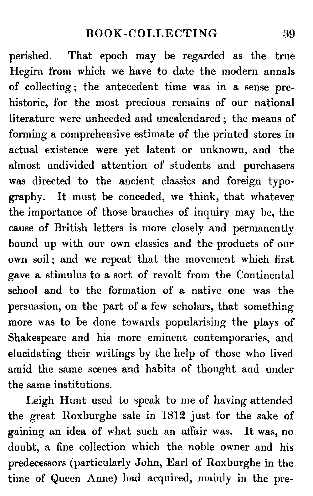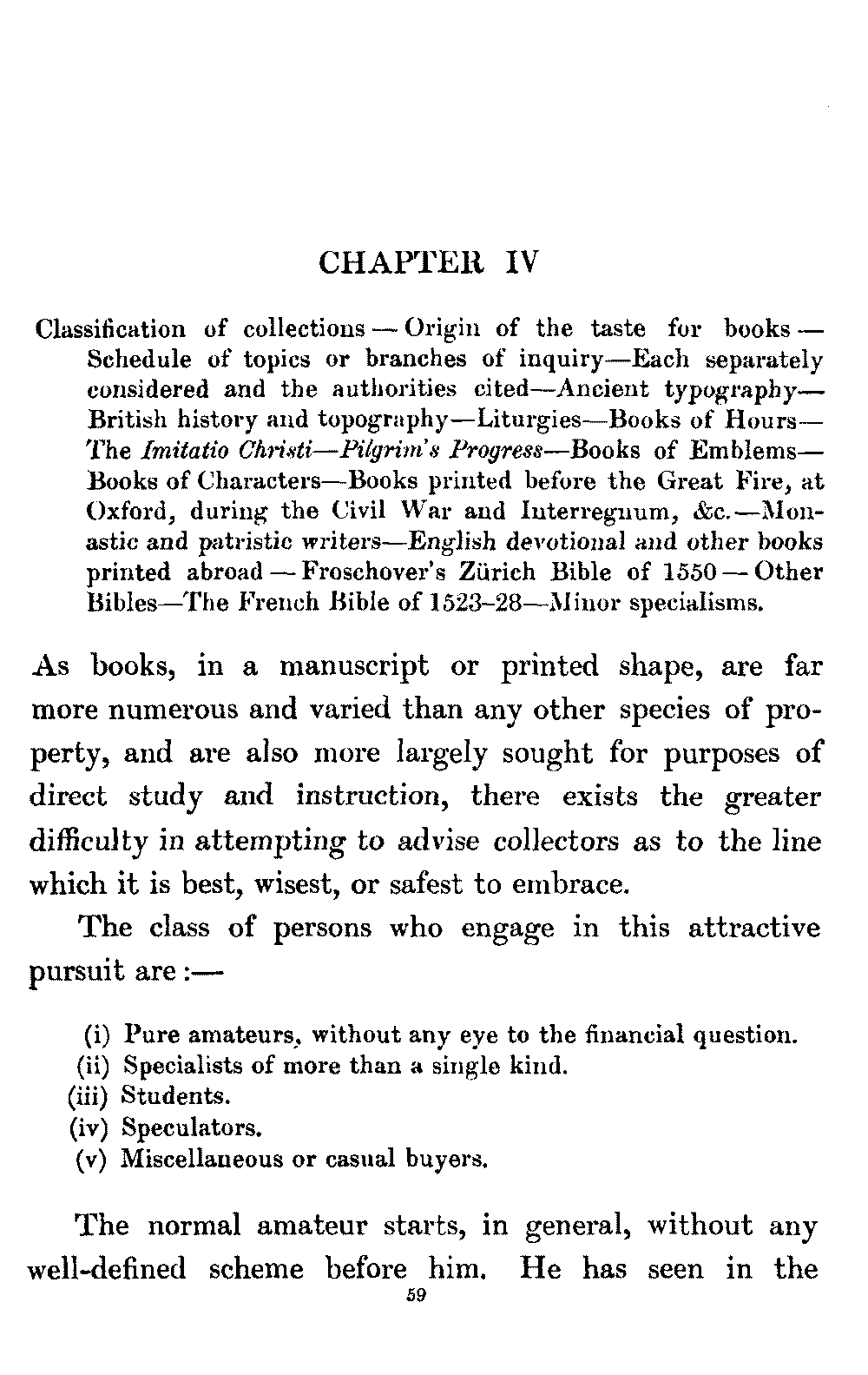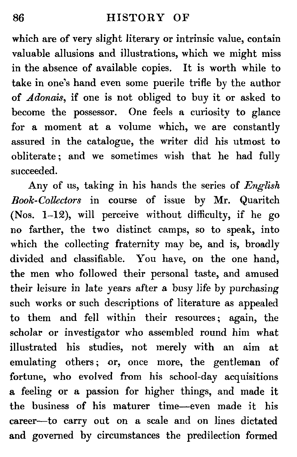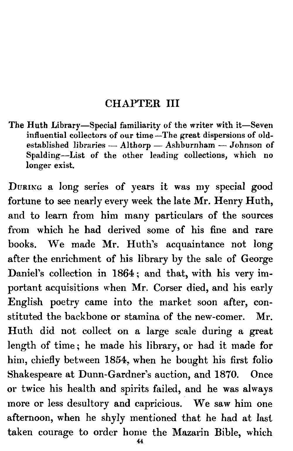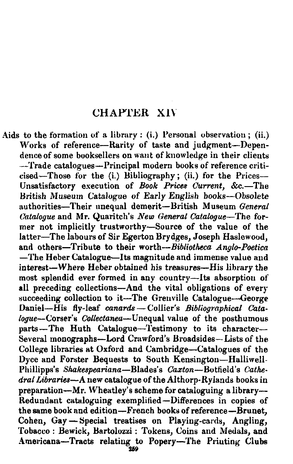 The plan—The writer's practical career—Deficiency of a general knowledge of the subject—The Printed Book and the Manuscript independent branches of study—The rich and the poor collector—Their relative systems and advantages—Great results achieved by persons of moderate fortune—The Rev. Thomas Corser—Lamb and Coleridge—Human interest resident in collections formed by such men, and the genuine pleasure experienced by the owners—A case or two stated—The Chevalier D'Eon—The contrary practice—Comparatively early culture in the provinces and interchange of books—Lady collectors—Rarity of hereditary libraries—The alterations in the aspect of books—The Mill a fellow-labourer with the Press—A word about values and prices—Our social institutions answerable for the difference of feeling about book-collecting—Districts formerly rich in libraries—Distributing centres—Possibility of yet unexplored ground—The Universities and Inns of Court—Successful book-hunting in Scotland and Ireland—Present gravitation of all valuable books to London.