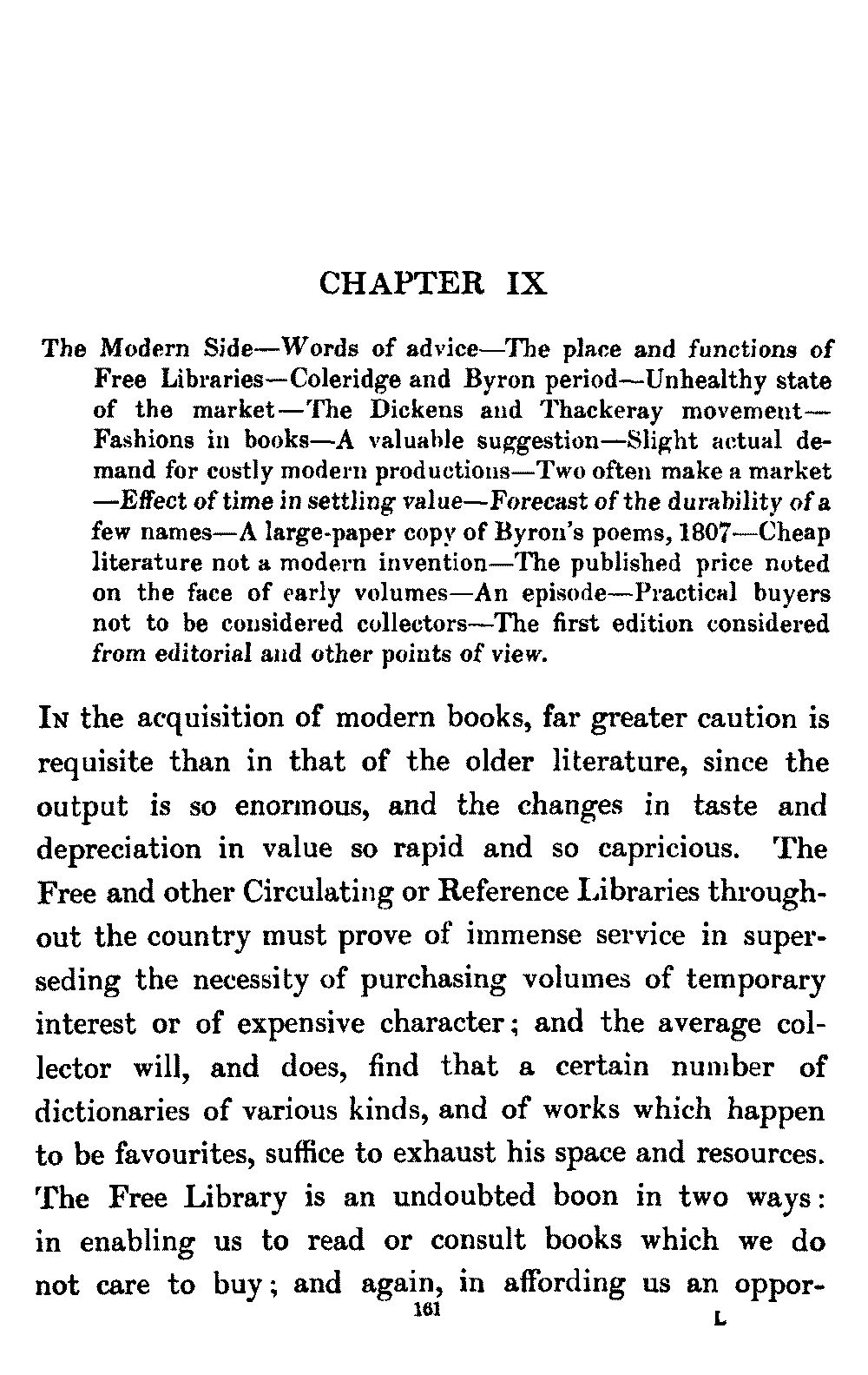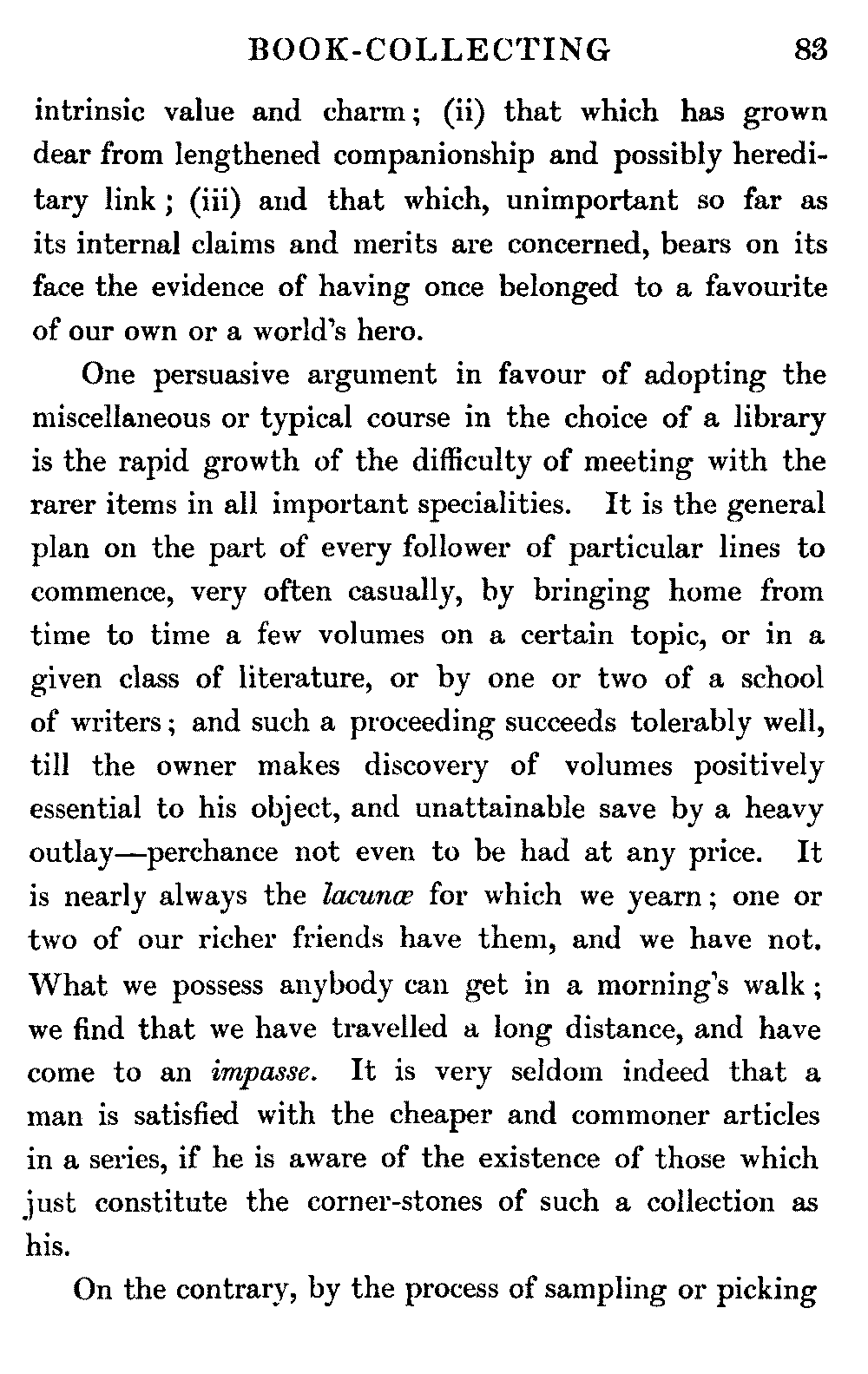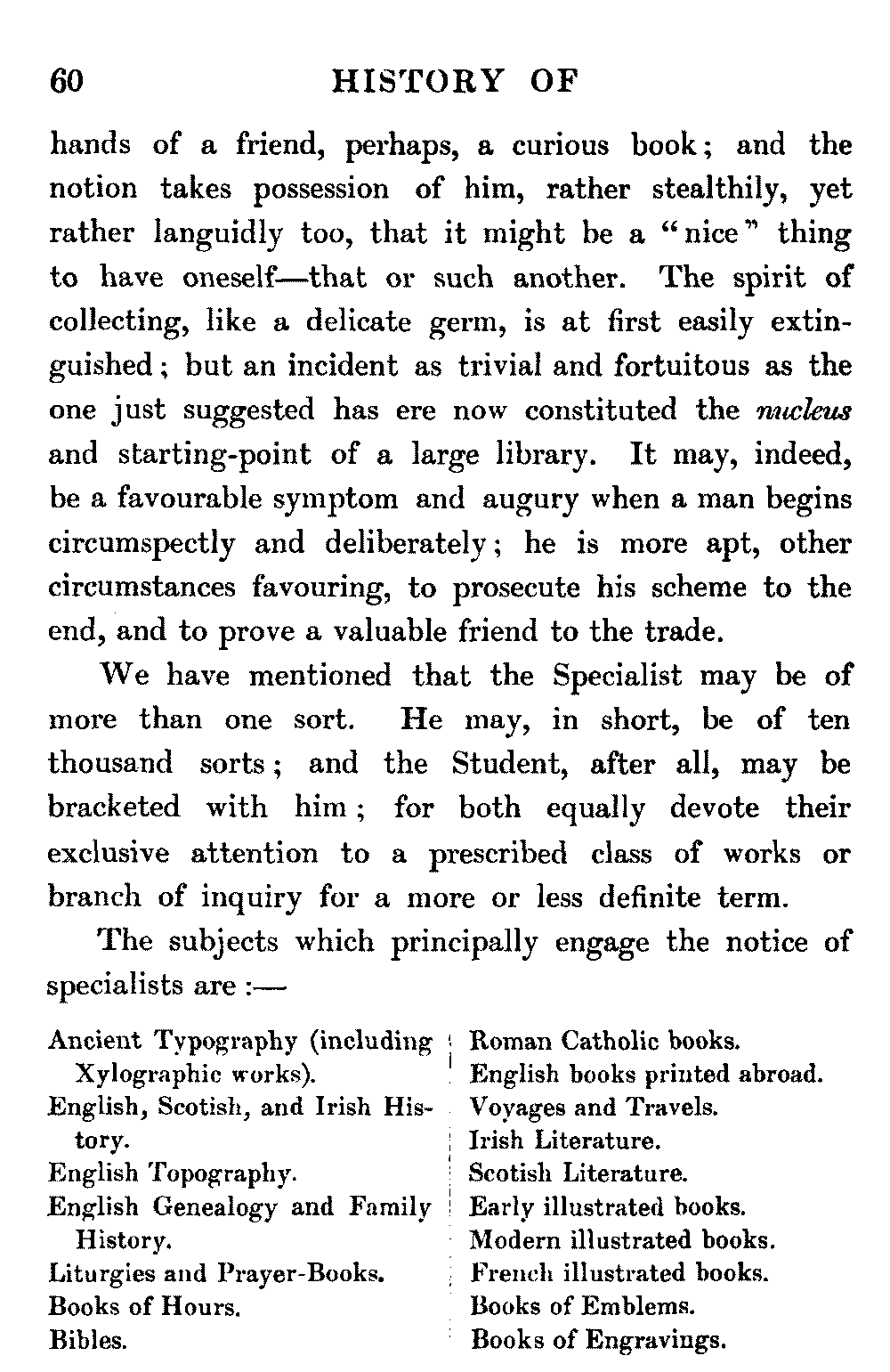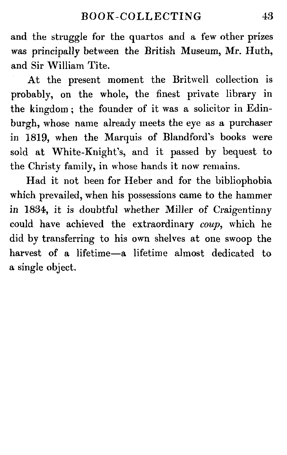The plan—The writer's practical career—Deficiency of a general knowledge of the subject—The Printed Book and the Manuscript independent branches of study—The rich and the poor collector—Their relative systems and advantages—Great results achieved by persons of moderate fortune—The Rev. Thomas Corser—Lamb and Coleridge—Human interest resident in collections formed by such men, and the genuine pleasure experienced by the owners—A case or two stated—The Chevalier D'Eon—The contrary practice—Comparatively early culture in the provinces and interchange of books—Lady collectors—Rarity of hereditary libraries—The alterations in the aspect of books—The Mill a fellow-labourer with the Press—A word about values and prices—Our social institutions answerable for the difference of feeling about book-collecting—Districts formerly rich in libraries—Distributing centres—Possibility of yet unexplored ground—The Universities and Inns of Court—Successful book-hunting in Scotland and Ireland—Present gravitation of all valuable books to London.