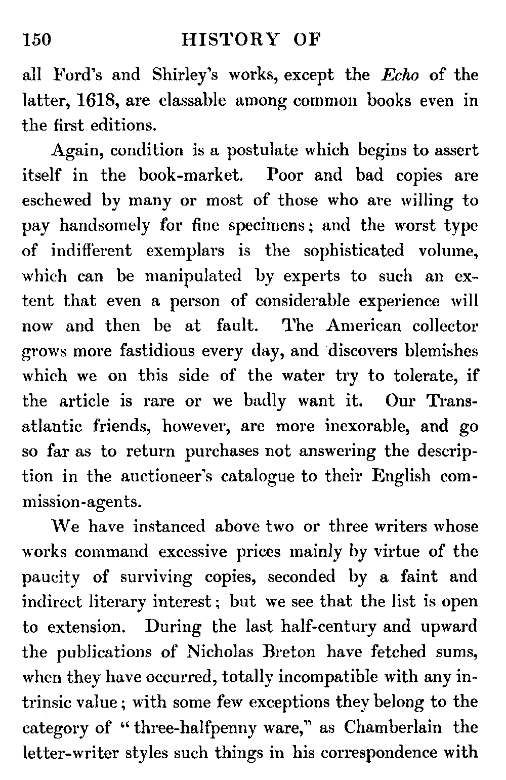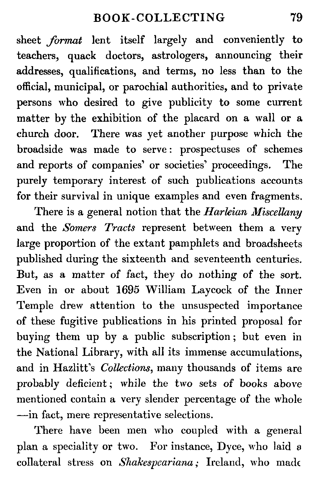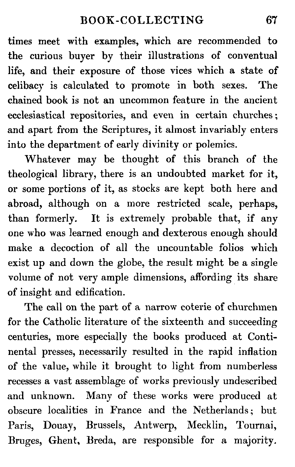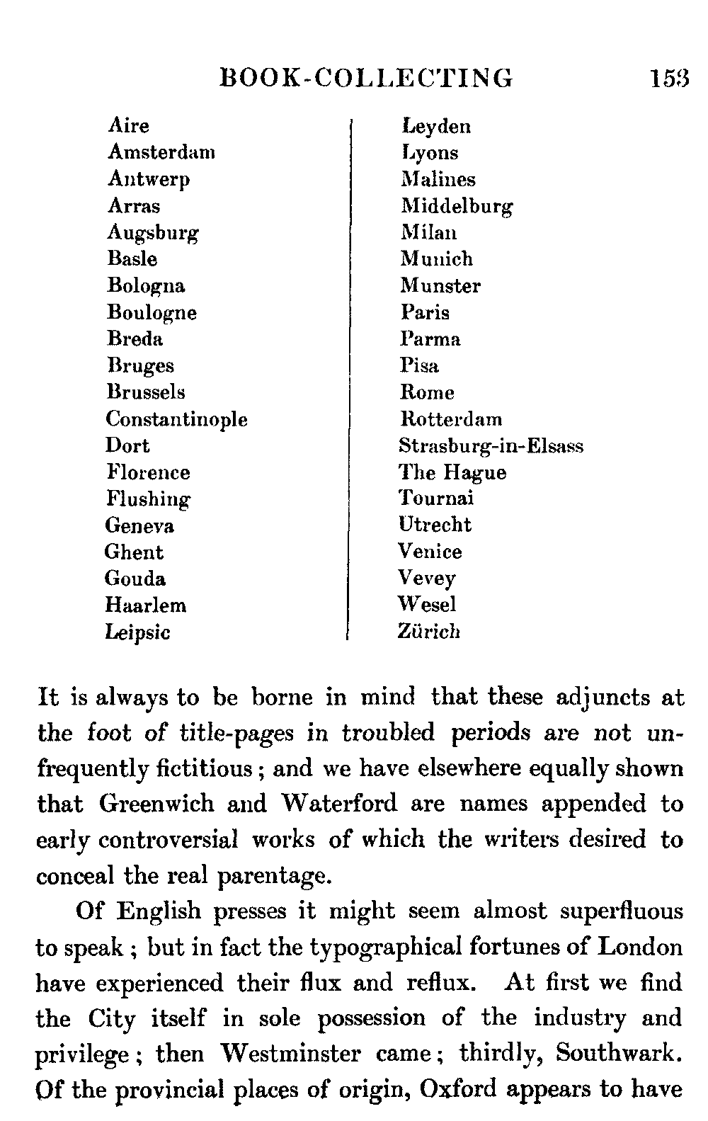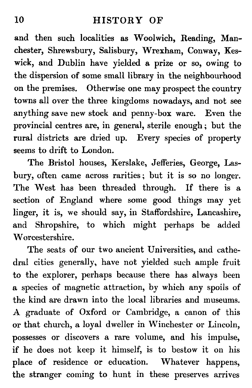 Even in later times the suburbs of London, and now[10] and then such localities as Woolwich, Reading, Manchester, Shrewsbury, Salisbury, Wrexham, Conway, Keswick, and Dublin have yielded a prize or so, owing to the dispersion of some small library in the neighbourhood on the premises. Otherwise one may prospect the country towns all over the three kingdoms nowadays, and not see anything save new stock and penny-box ware. Even the provincial centres are, in general, sterile enough; but the rural districts are dried up. Every species of property seems to drift to London.
