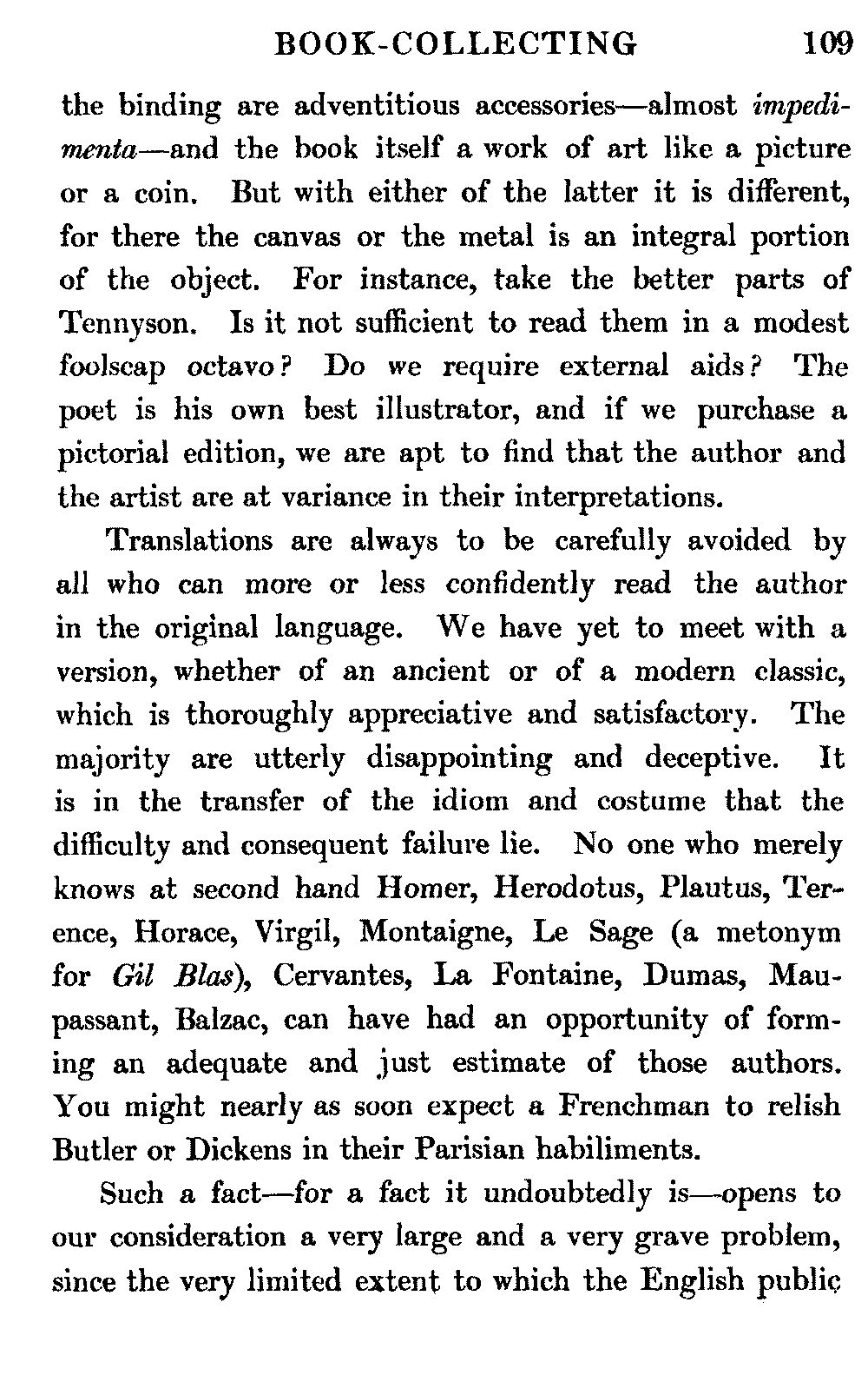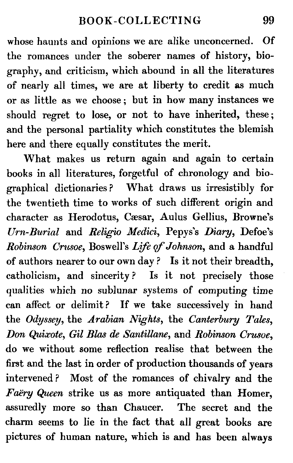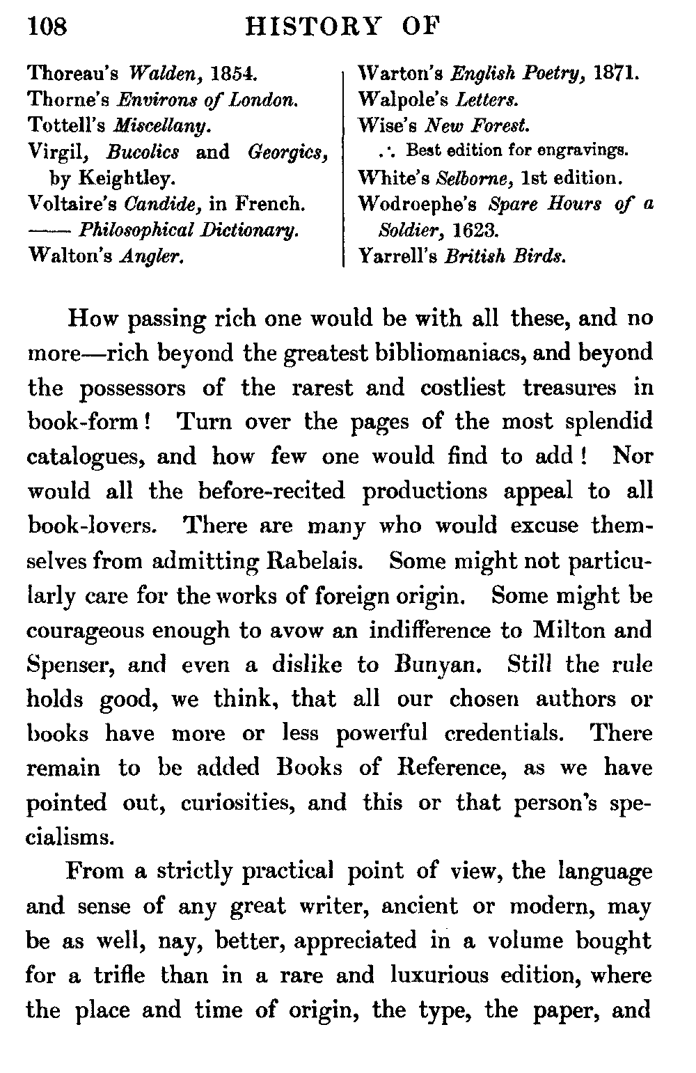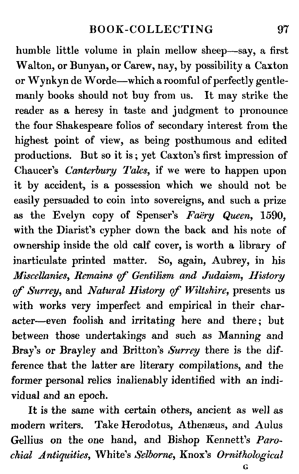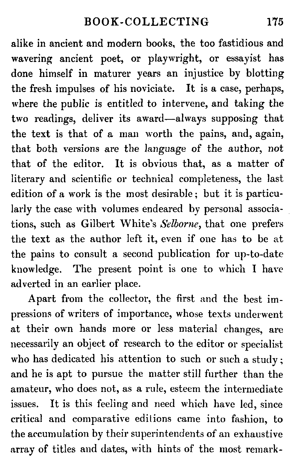 P. 103. Books Appreciable on Special Grounds.—Among these are—Pennant's Tour in Scotland, 1769, and White's Selborne, 1785. Everybody is aware that there are better works on Scotland than Pennant's, and better accounts of birds, those of Selborne included, than White's. But we desire the two heirlooms, as their authors left them, pure and simple. We prefer not to have to disentangle the two pieces of eighteenth century workmanship from the editorial and artistic improvements which have overlaid them. A much-edited writer becomes a partner in a limited company without a vote. His pages are converted by degrees into an arena where others commend him above his deserts, or what might have been his wishes, while here and there he finds a commentator, whose aim is to convince you how superior a job he would have made of it had it been left to him.