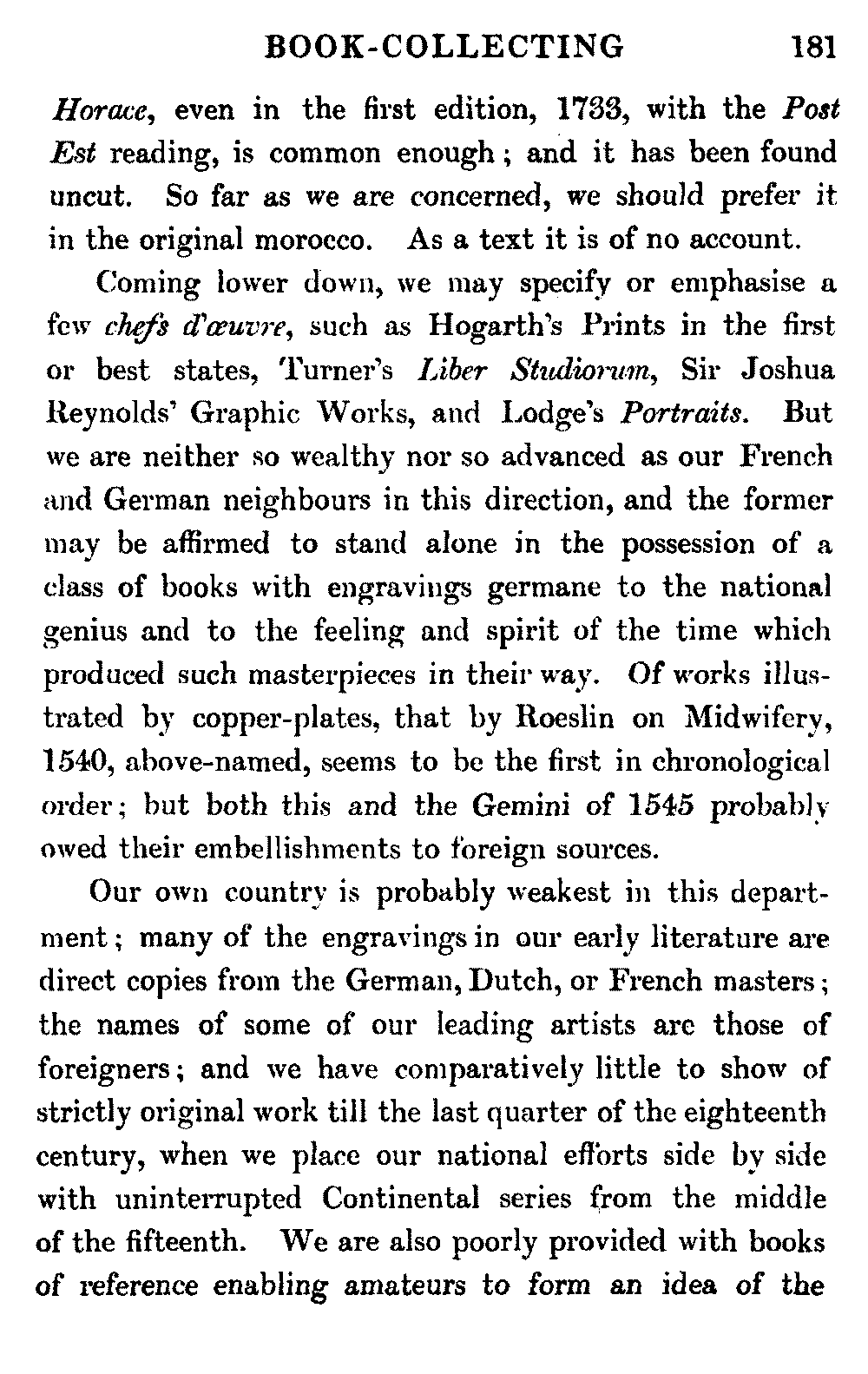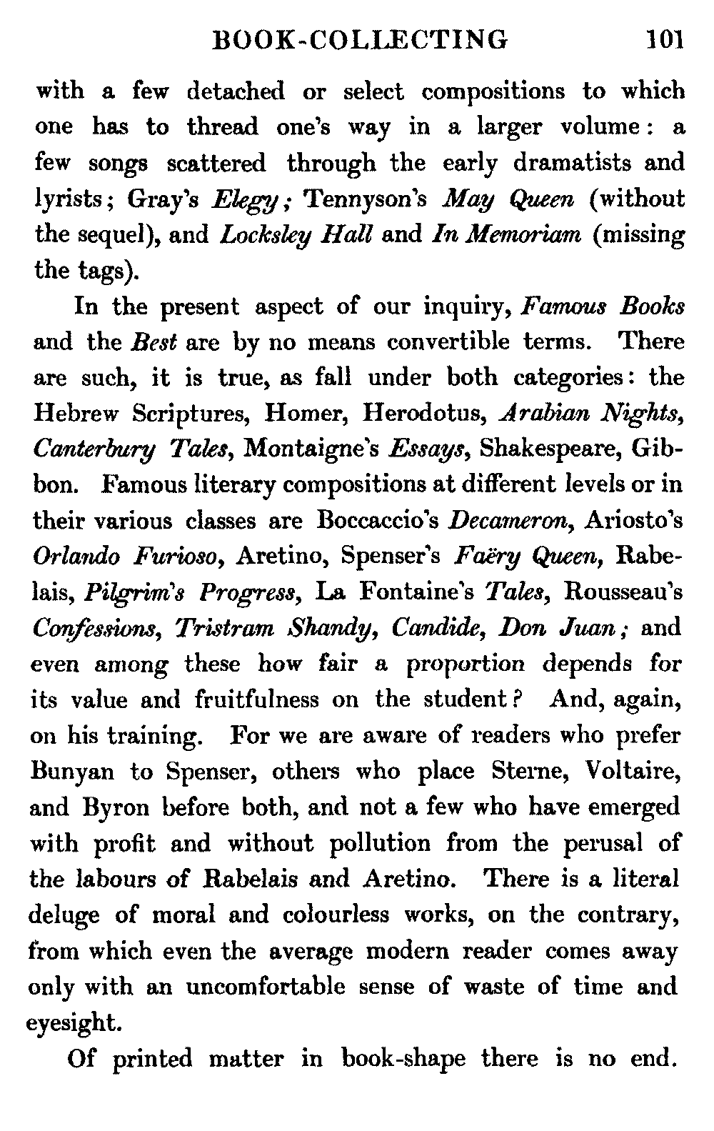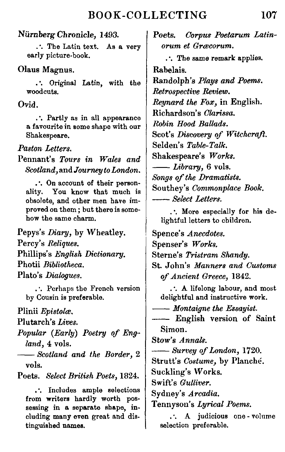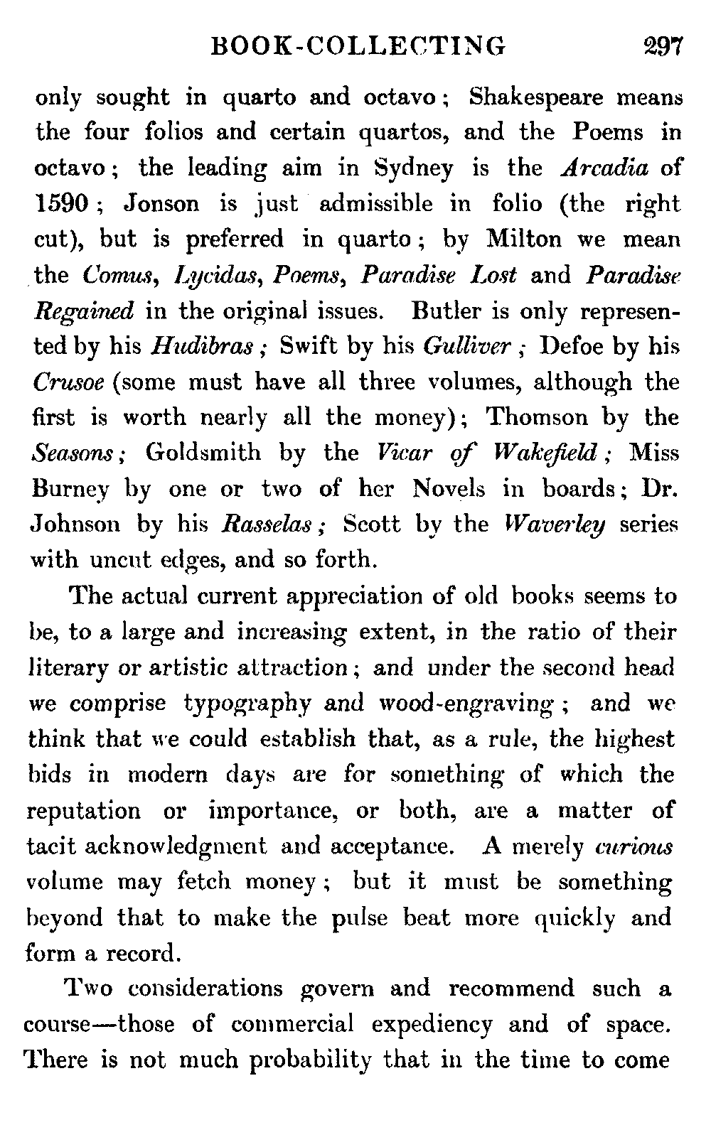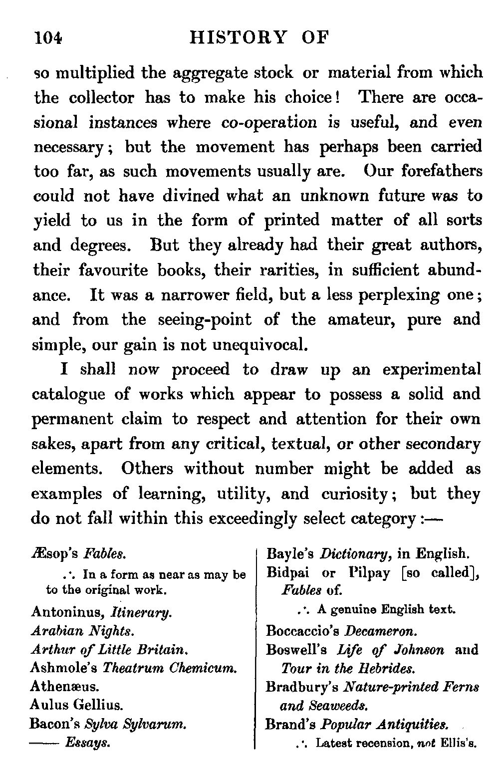 P. 103. Books Appreciable on Special Grounds.—Among these are—Pennant's Tour in Scotland, 1769, and White's Selborne, 1785. Everybody is aware that there are better works on Scotland than Pennant's, and better accounts of birds, those of Selborne included, than White's. But we desire the two heirlooms, as their authors left them, pure and simple. We prefer not to have to disentangle the two pieces of eighteenth century workmanship from the editorial and artistic improvements which have overlaid them. A much-edited writer becomes a partner in a limited company without a vote. His pages are converted by degrees into an arena where others commend him above his deserts, or what might have been his wishes, while here and there he finds a commentator, whose aim is to convince you how superior a job he would have made of it had it been left to him.