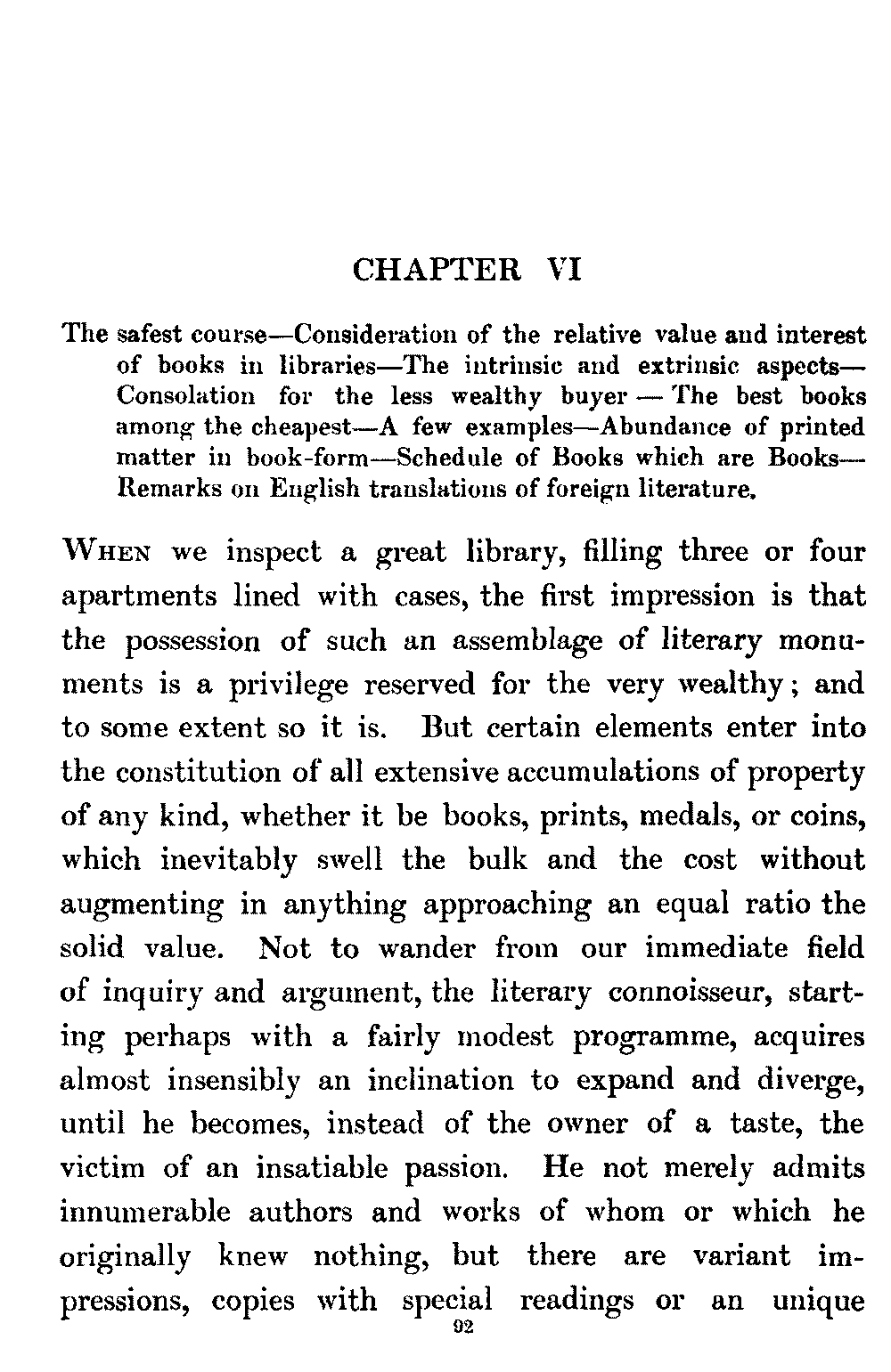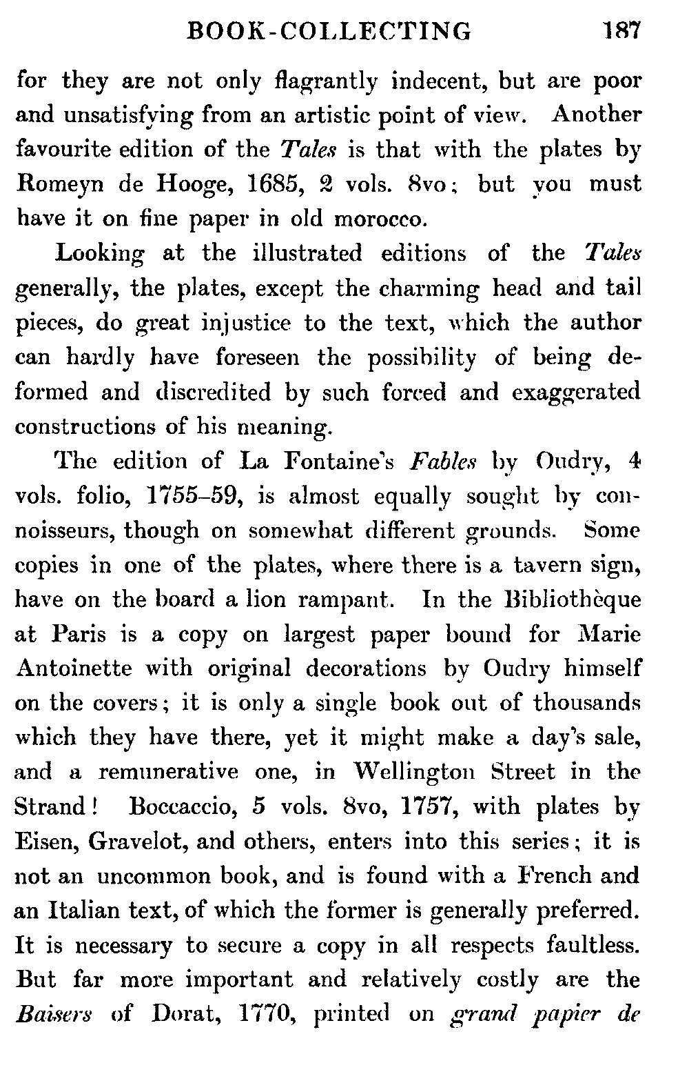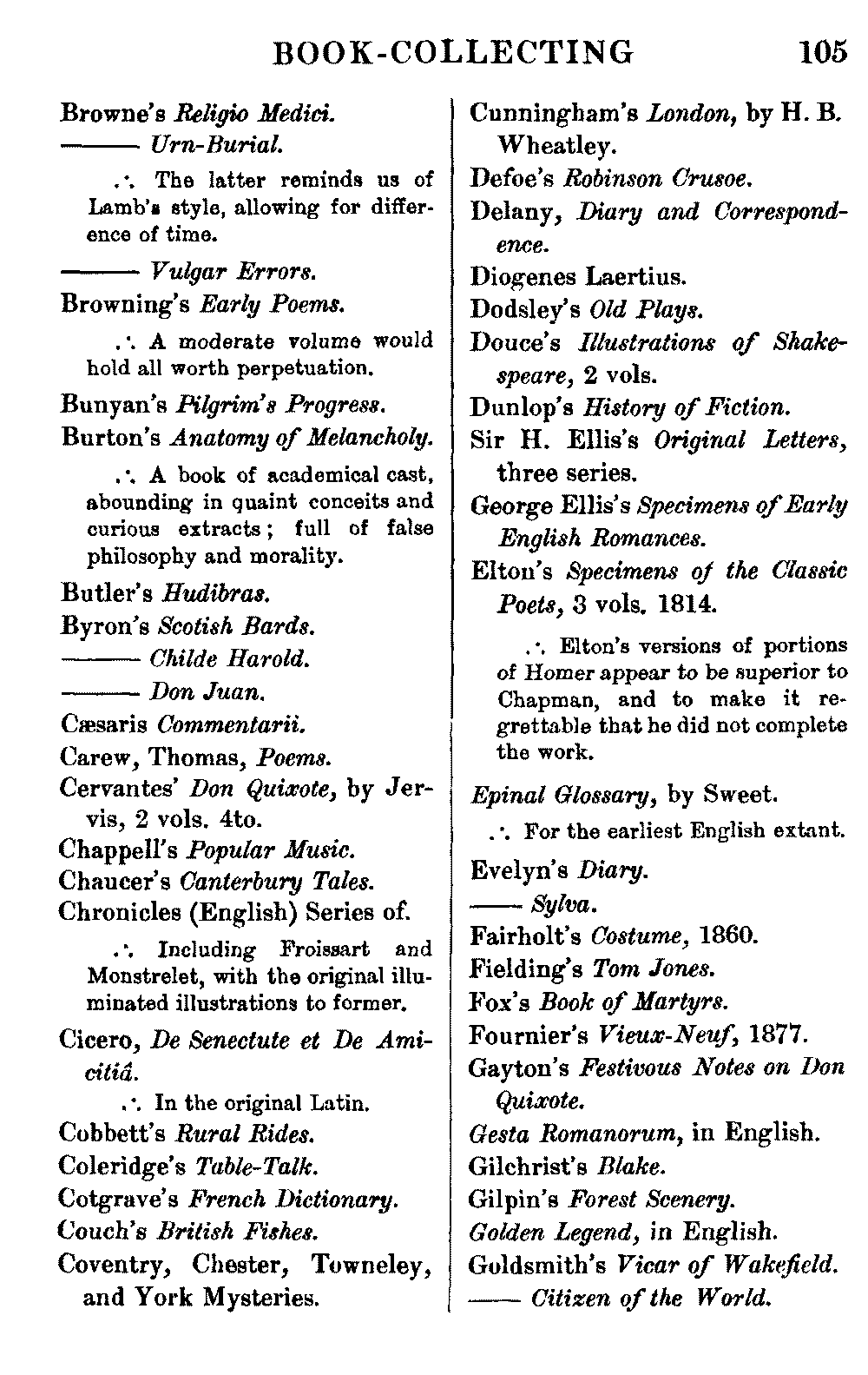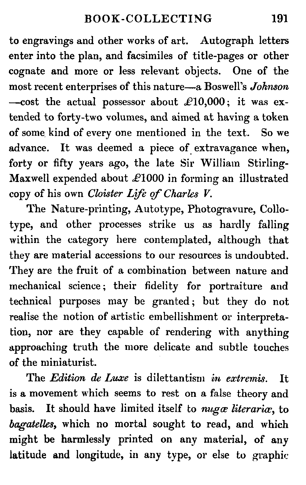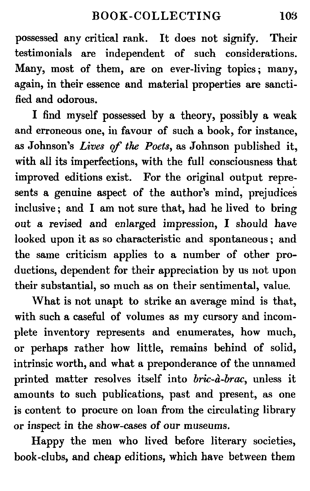 P. 103. Books Appreciable on Special Grounds.—Among these are—Pennant's Tour in Scotland, 1769, and White's Selborne, 1785. Everybody is aware that there are better works on Scotland than Pennant's, and better accounts of birds, those of Selborne included, than White's. But we desire the two heirlooms, as their authors left them, pure and simple. We prefer not to have to disentangle the two pieces of eighteenth century workmanship from the editorial and artistic improvements which have overlaid them. A much-edited writer becomes a partner in a limited company without a vote. His pages are converted by degrees into an arena where others commend him above his deserts, or what might have been his wishes, while here and there he finds a commentator, whose aim is to convince you how superior a job he would have made of it had it been left to him.