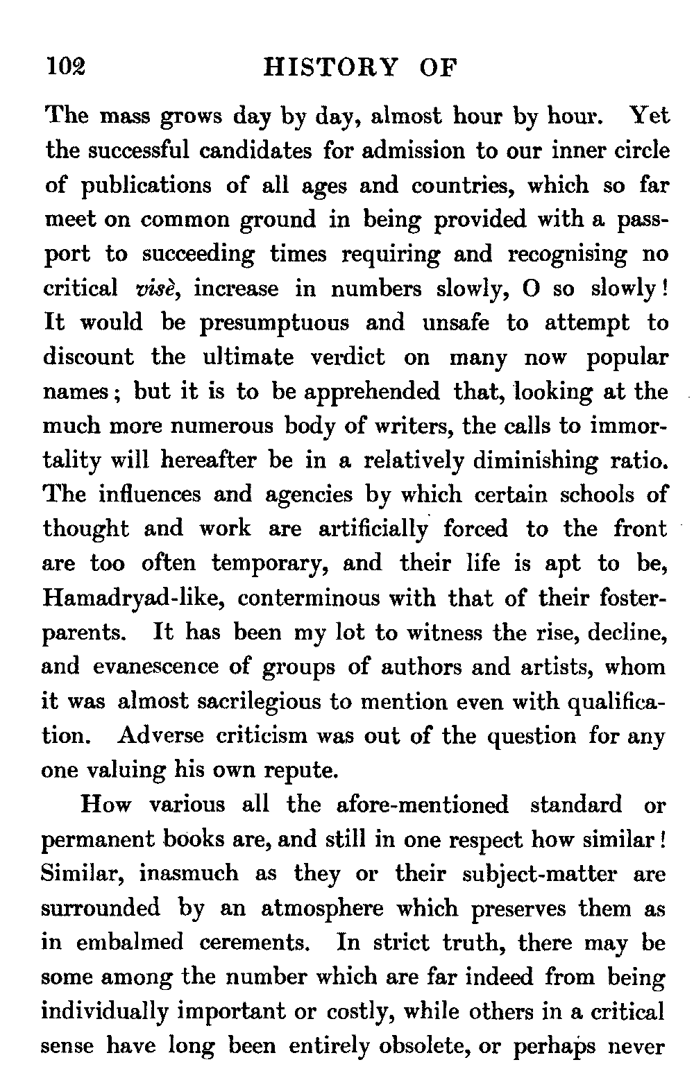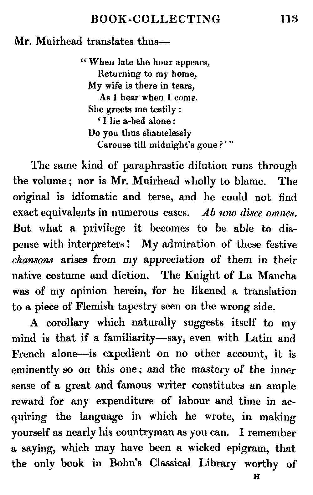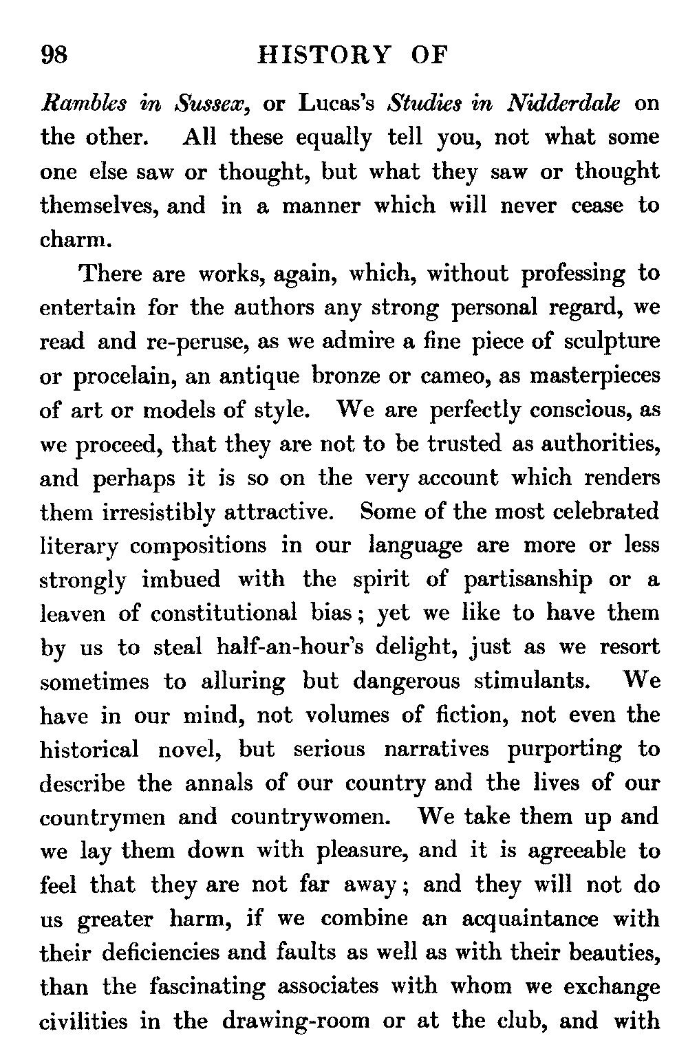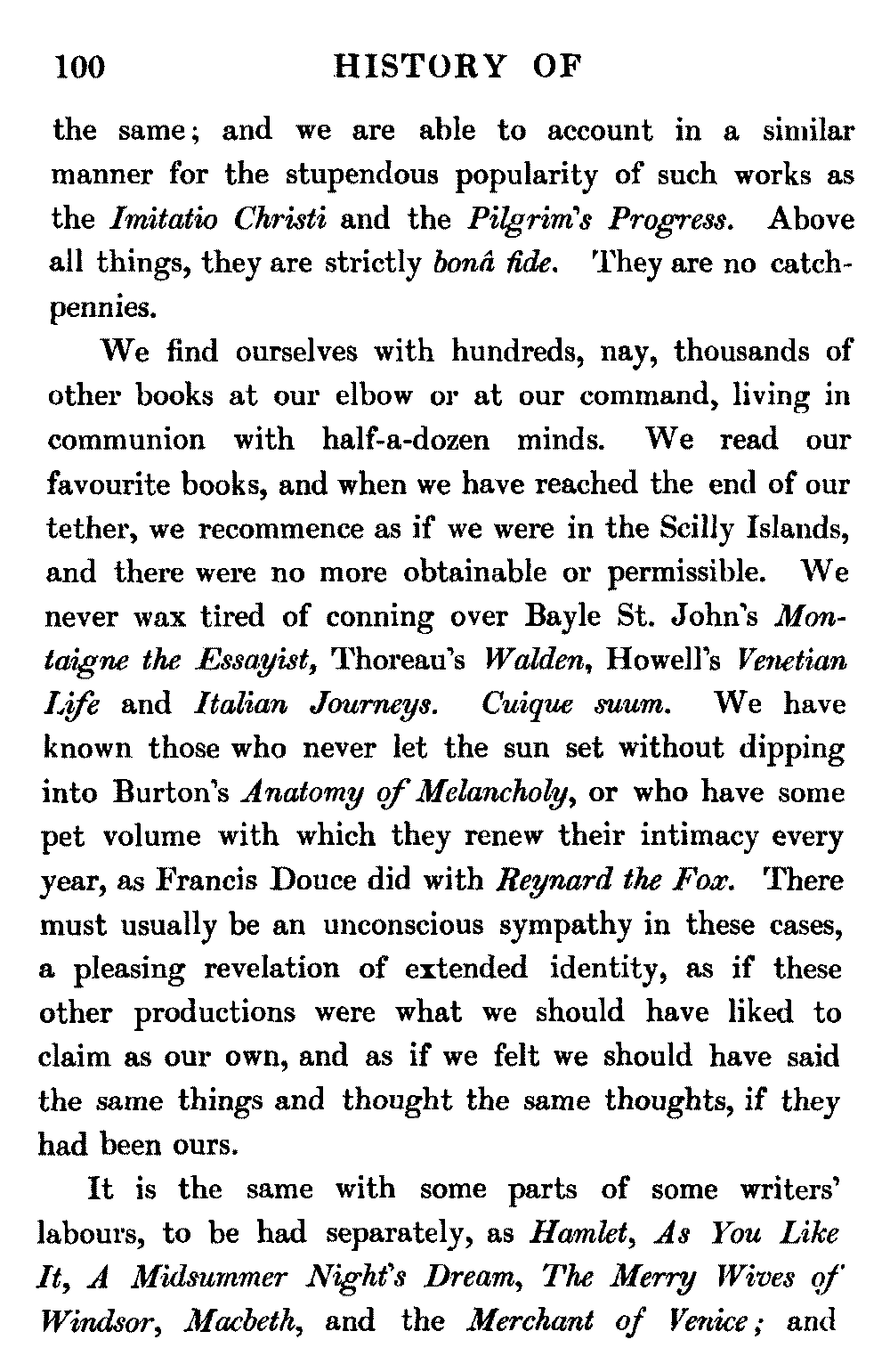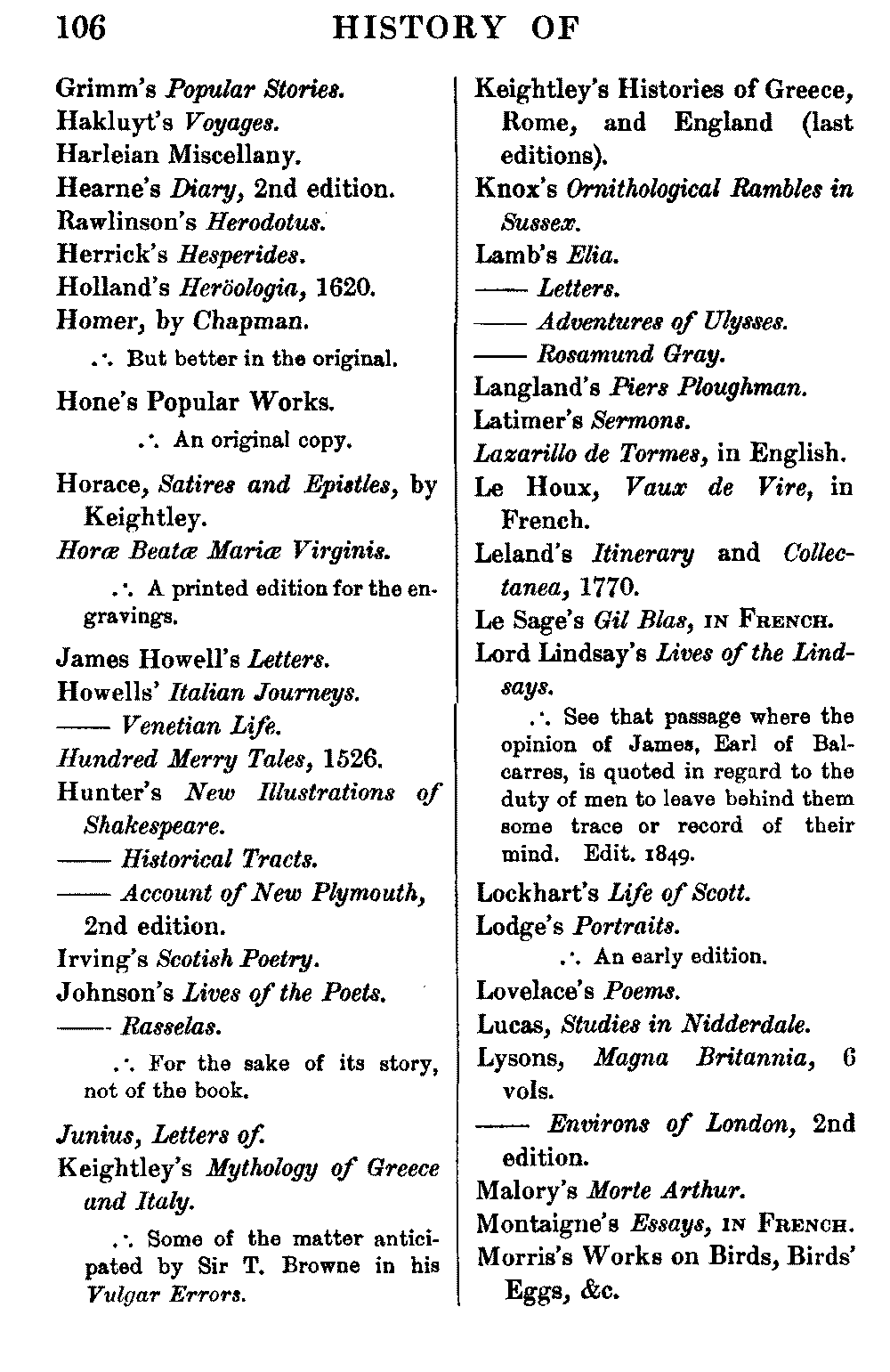 P. 103. Books Appreciable on Special Grounds.—Among these are—Pennant's Tour in Scotland, 1769, and White's Selborne, 1785. Everybody is aware that there are better works on Scotland than Pennant's, and better accounts of birds, those of Selborne included, than White's. But we desire the two heirlooms, as their authors left them, pure and simple. We prefer not to have to disentangle the two pieces of eighteenth century workmanship from the editorial and artistic improvements which have overlaid them. A much-edited writer becomes a partner in a limited company without a vote. His pages are converted by degrees into an arena where others commend him above his deserts, or what might have been his wishes, while here and there he finds a commentator, whose aim is to convince you how superior a job he would have made of it had it been left to him.