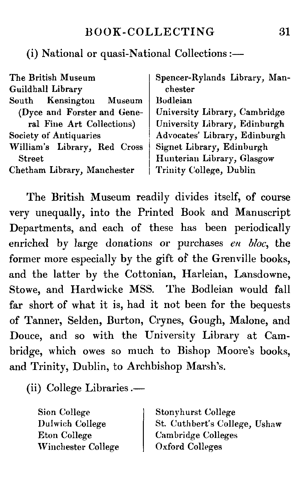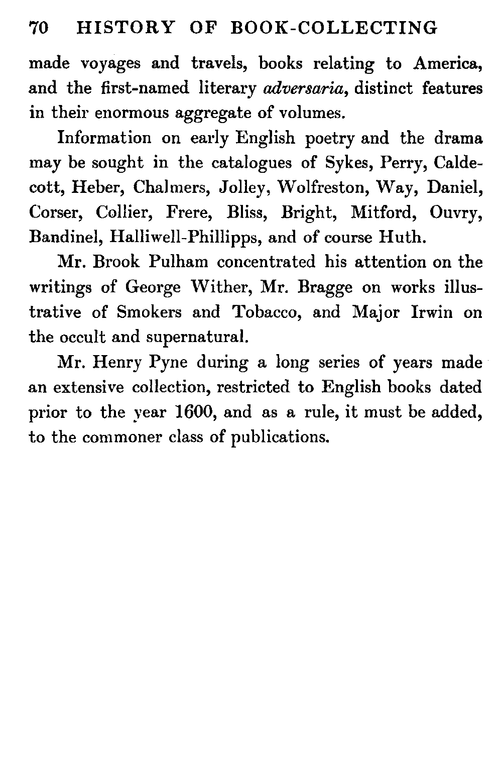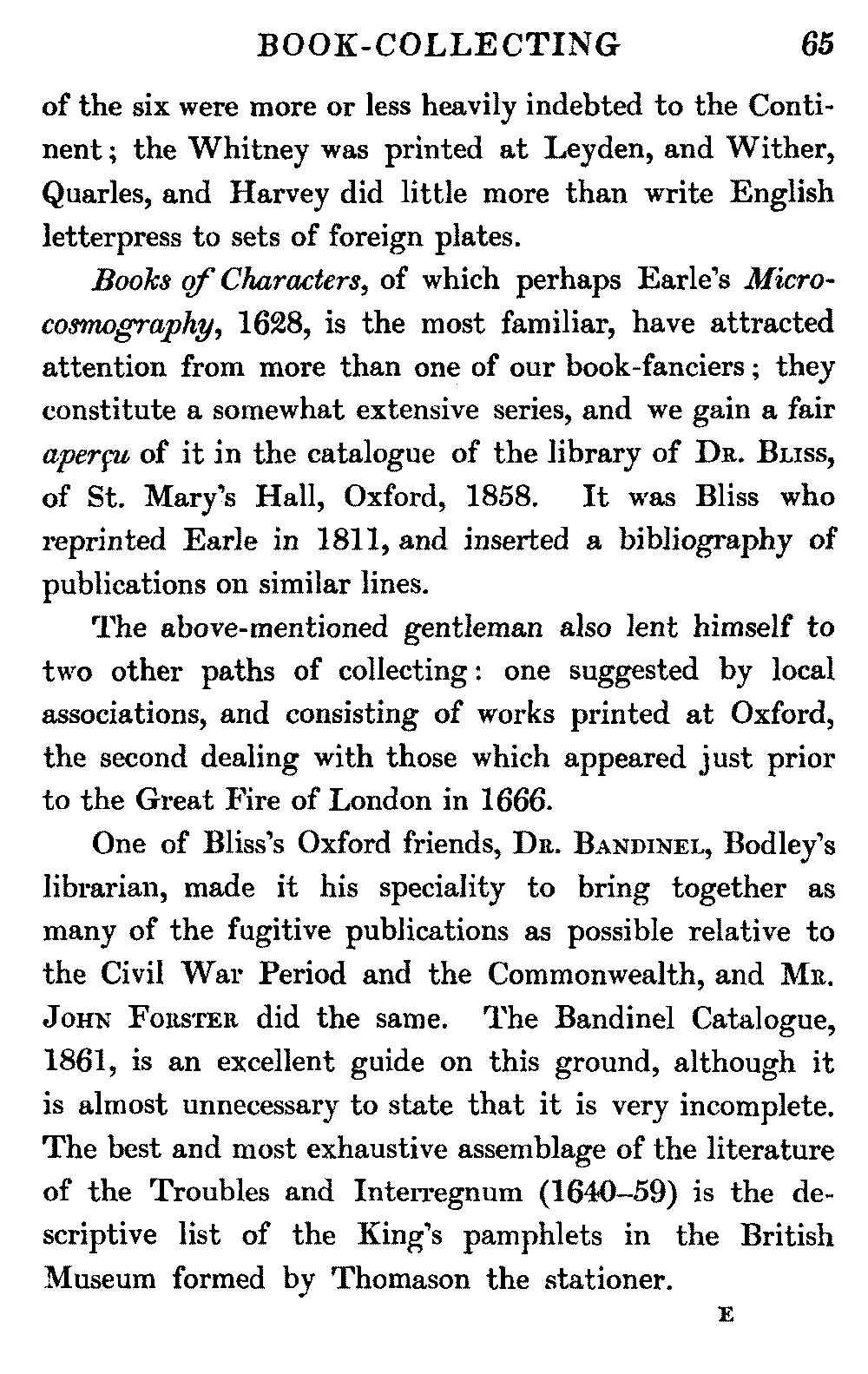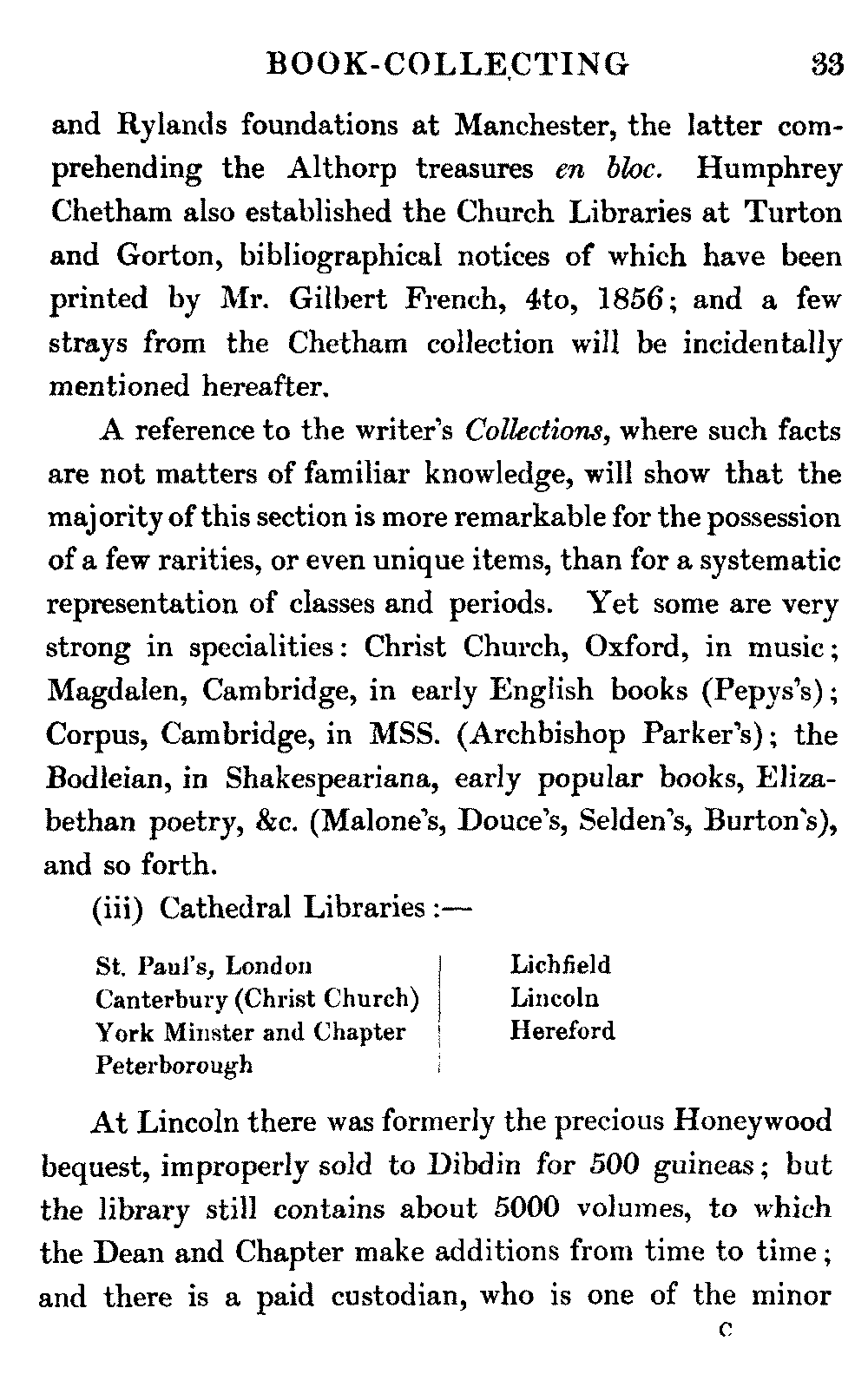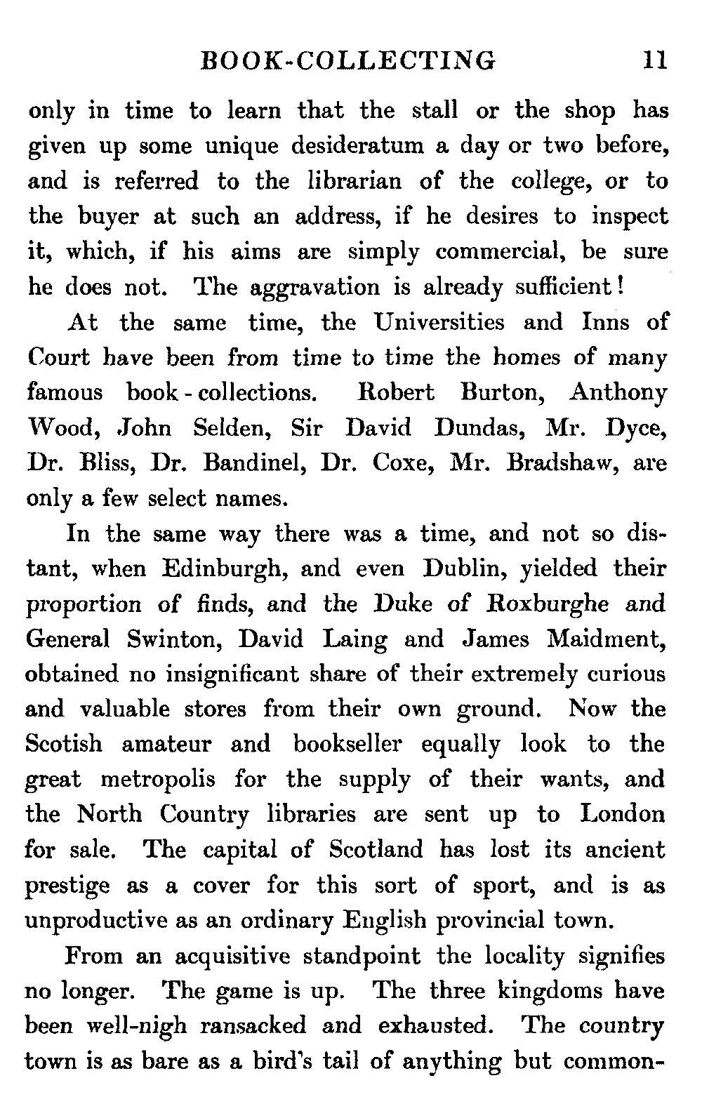 At the same time, the Universities and Inns of Court have been from time to time the homes of many famous book-collections. Robert Burton, Anthony Wood, John Selden, Sir David Dundas, Mr. Dyce, Dr. Bliss, Dr. Bandinel, Dr. Coxe, Mr. Bradshaw, are only a few select names.