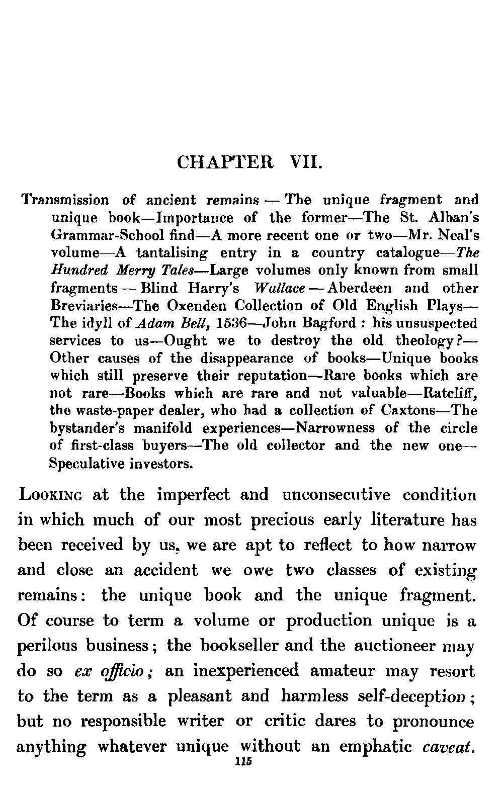 On the other hand, hundreds of early English books and tracts which this indefatigable and munificent of collectors never succeeded in obtaining, items and authors whose titles and names were hitherto utterly unknown, have within the last two generations come piecemeal into the market, to delight alike, yet in a different way, the bibliographer and the amateur. The accidental and almost miraculous survival of literary relics of past ages is curious on account of the purely casual manner in which they present themselves from season to season, as well as from the strange hands in which many of them are found—often persons of obscure character and in humble life, who have one, two, or half-a-dozen books of which all had somehow eluded the researches of every collector. Cases are known in which a single article has come to light in this manner, a unique publication of the Plantagenet or Tudor era, maybe in sorry state, maybe just as it left the press two or three centuries ago, but anyhow a monument and a revelation.