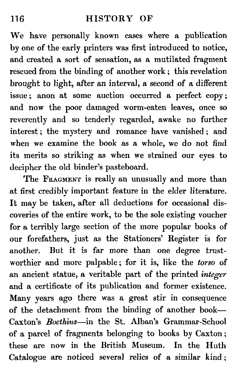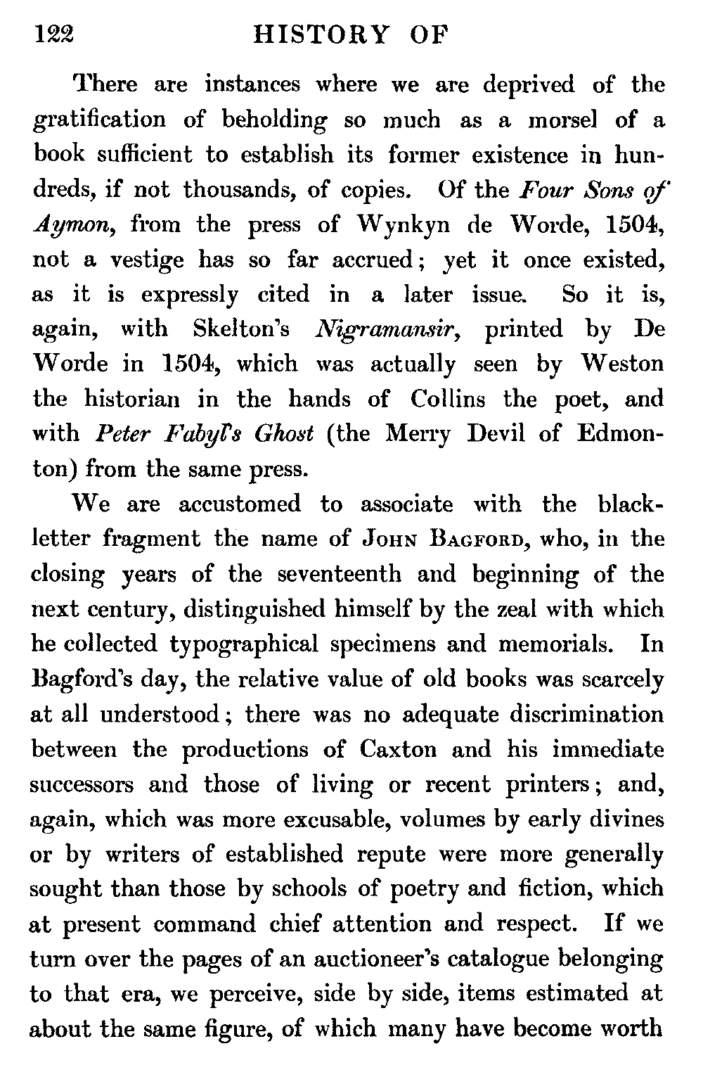 P. 128. Fragments.—The Fragment has within the last twenty or thirty years come into surprising evidence, and in my latest instalment of Bibliographical Notes, 1903, I have been enabled to supply numerous deficiencies in existing records even of modern date from a variety of sources not ostensibly connected with Bagford, Fenn, or any other culprit of this type, shewing that the process of disappearance was in universal operation, and that mere chance arrested it here and there just in the nick of time.