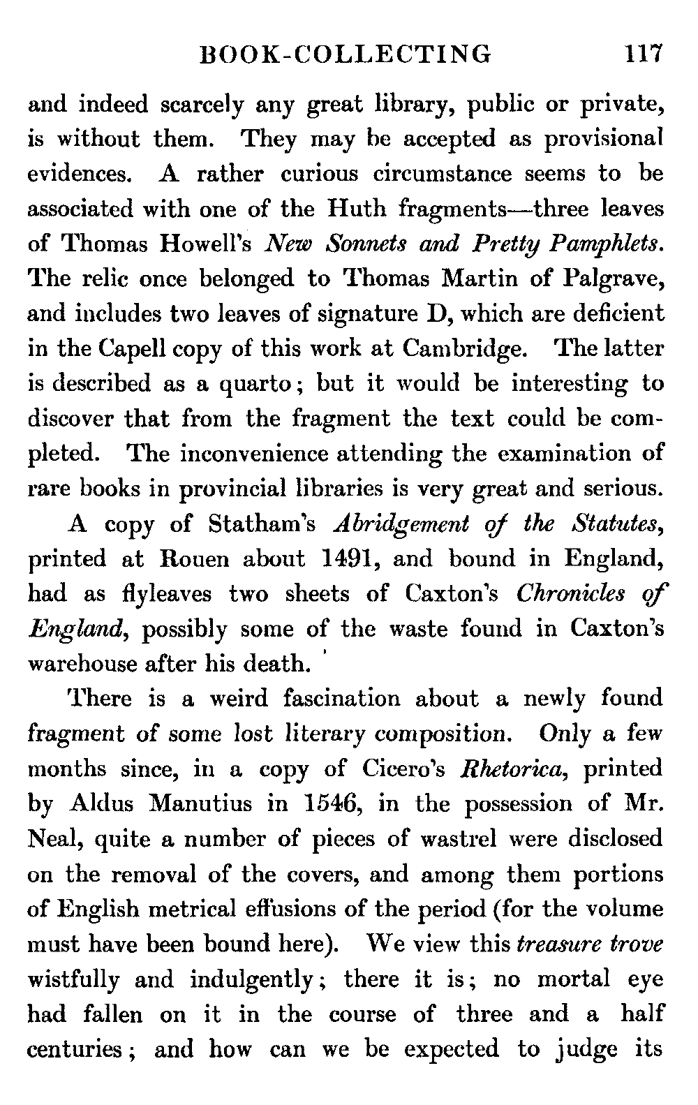 P. 117. Howell's New Sonnets and Pretty Pamphlets.—The Huth fragment seems as if it would complete the unique, but imperfect, Capell copy.