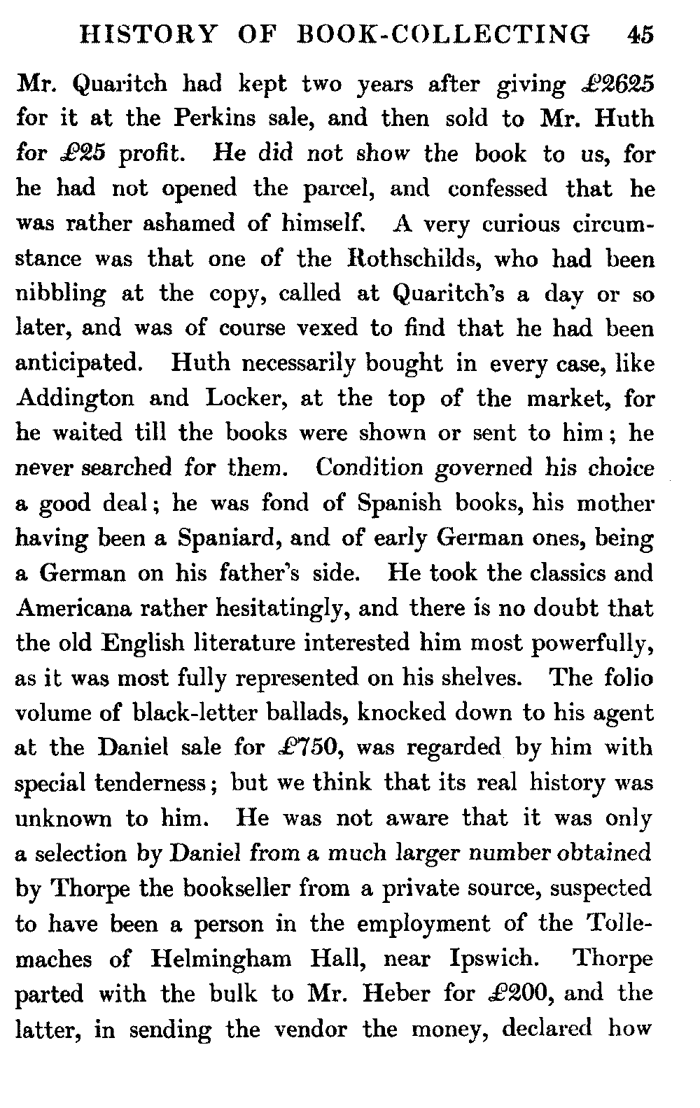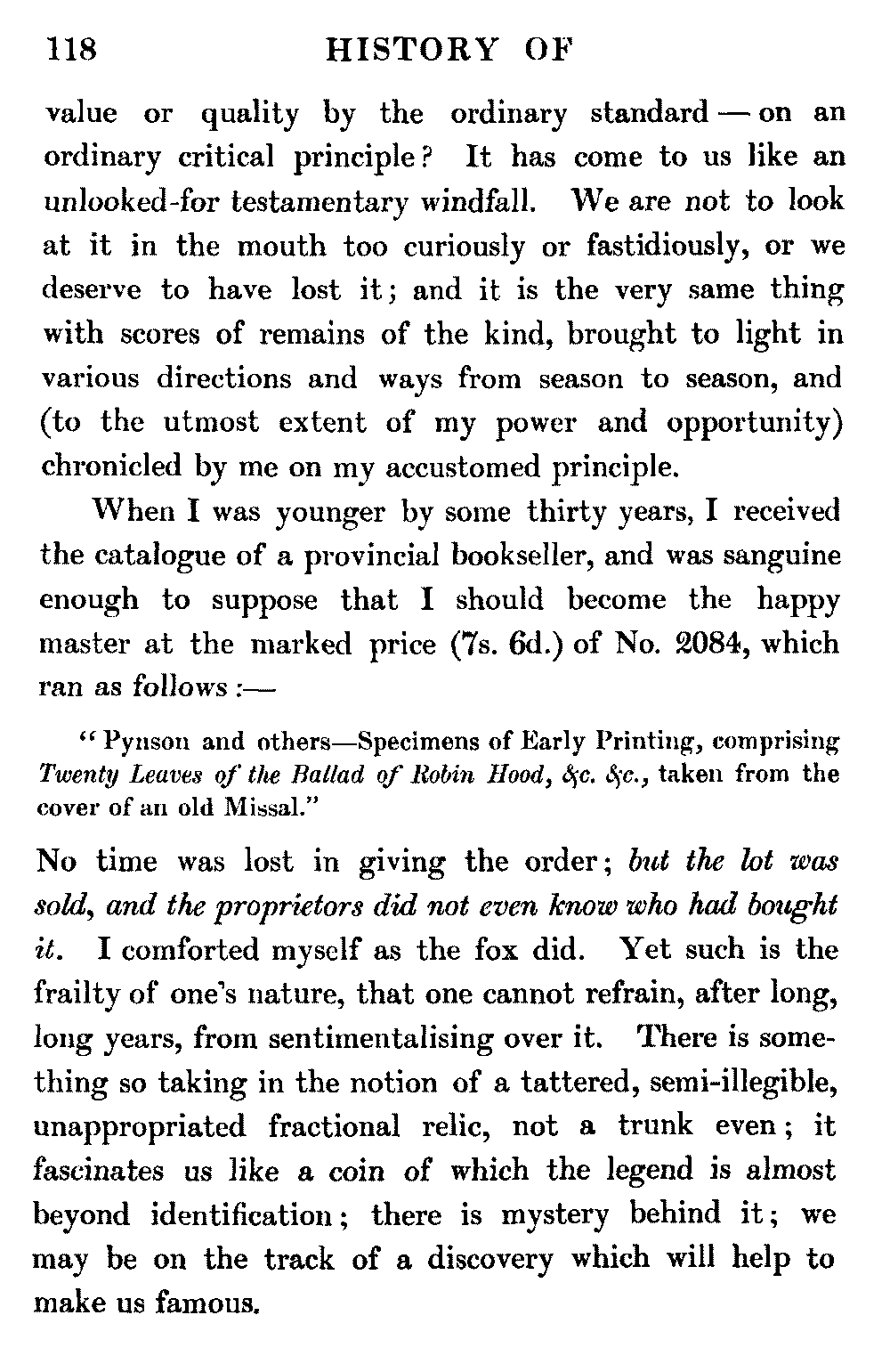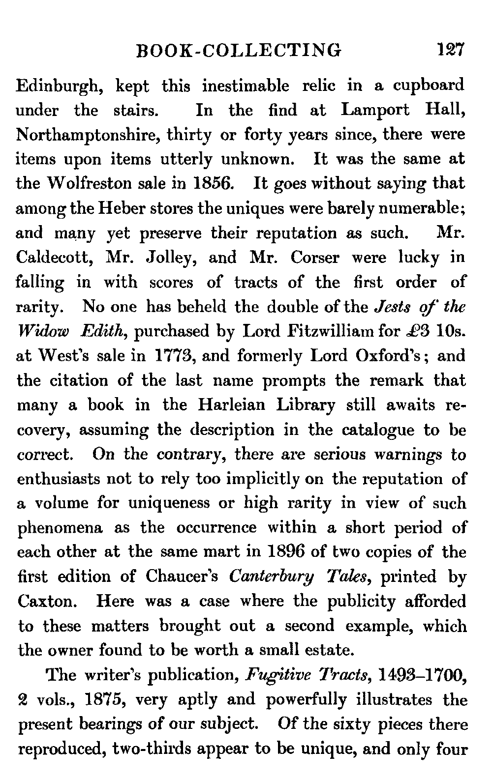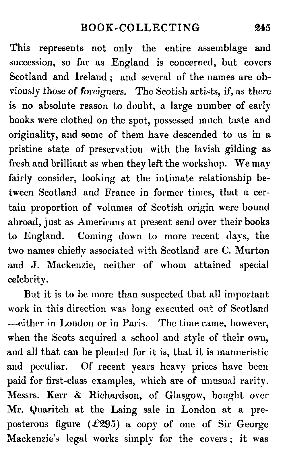 In the same way there was a time, and not so distant, when Edinburgh, and even Dublin, yielded their proportion of finds, and the Duke of Roxburghe and General Swinton, David Laing and James Maidment, obtained no insignificant share of their extremely curious and valuable stores from their own ground. Now the Scotish amateur and bookseller equally look to the great metropolis for the supply of their wants, and the North Country libraries are sent up to London for sale. The capital of Scotland has lost its ancient prestige as a cover for this sort of sport, and is as unproductive as an ordinary English provincial town.