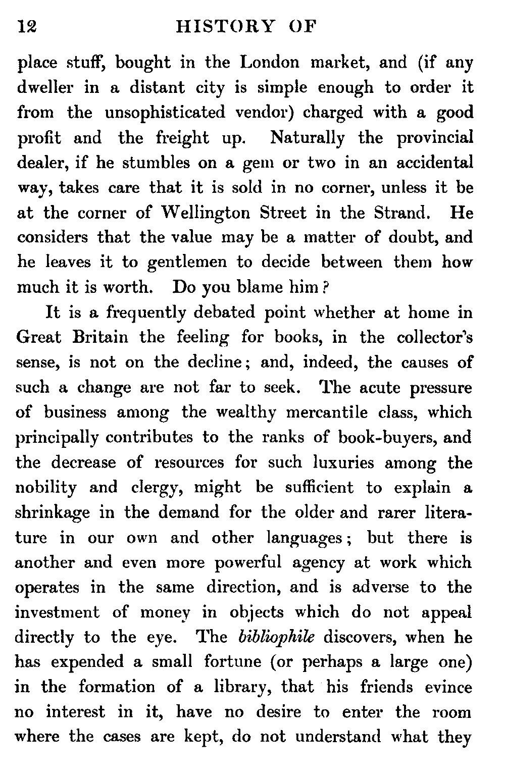 It is a frequently debated point whether at home in Great Britain the feeling for books, in the collector's sense, is not on the decline; and, indeed, the causes of such a change are not far to seek. The acute pressure of business among the wealthy mercantile class, which principally contributes to the ranks of book-buyers, and the decrease of resources for such luxuries among the nobility and clergy, might be sufficient to explain a shrinkage in the demand for the older and rarer literature in our own and other languages; but there is another and even more powerful agency at work which operates in the same direction, and is adverse to the investment of money in objects which do not appeal directly to the eye. The bibliophile discovers, when he has expended a small fortune (or perhaps a large one) in the formation of a library, that his friends evince no interest in it, have no desire to enter the room where the cases are kept, do not understand what they[13] are told about this or that precious acquisition, and turn on their heel to look at the pictures, the antique furniture, or the china. This undoubtedly wide-spread sentiment strikes a very serious blow at a pursuit in which the enthusiast meets with slight sympathy or encouragement, unless it is at the hands of the dealers, naturally bound for their own sakes to keep him in heart by sympathy and flattery. Doubtless the present aspect of the question might have become ere now more serious, had it not been for the American market and the extension of the system of public and free libraries.