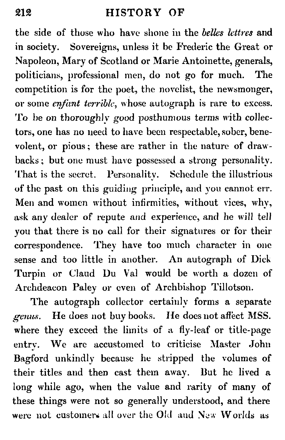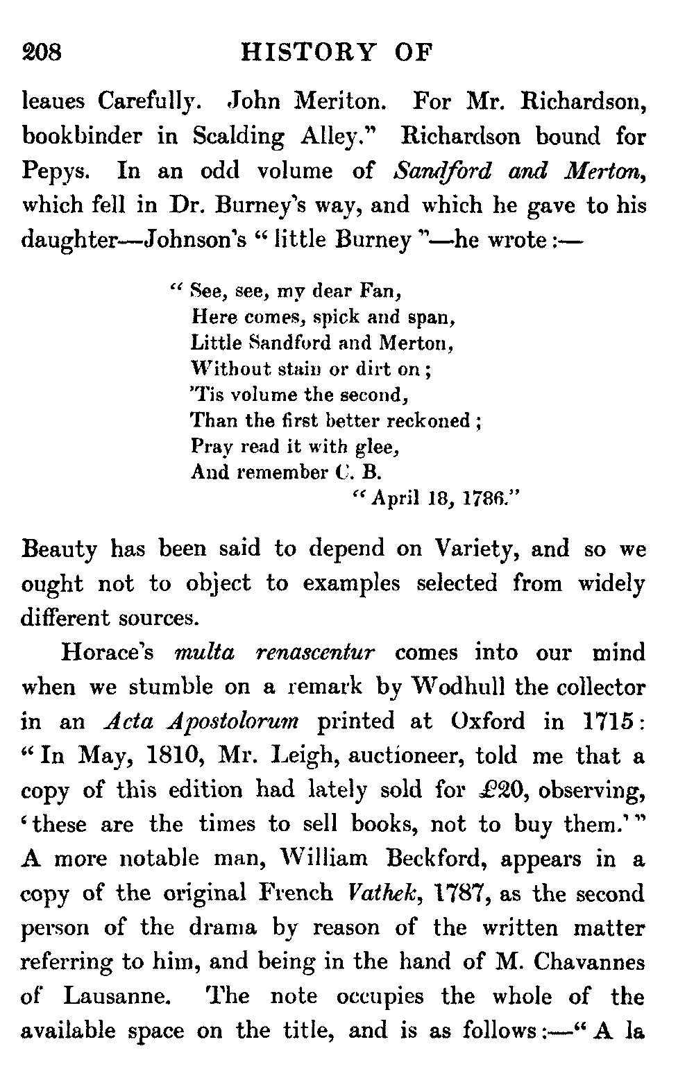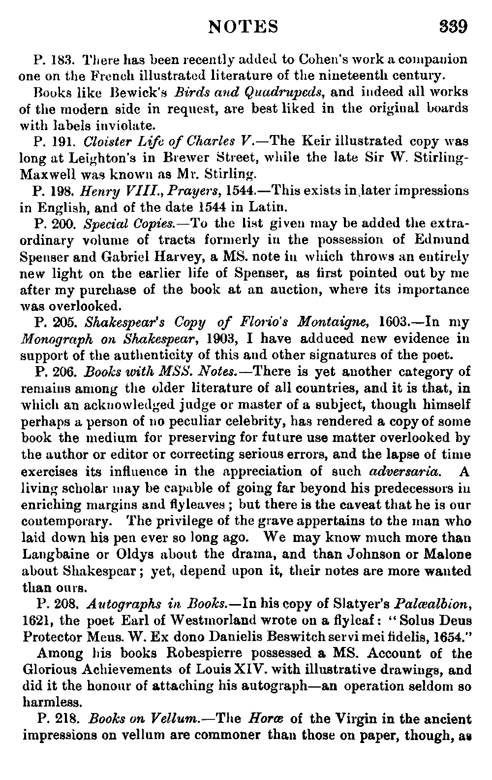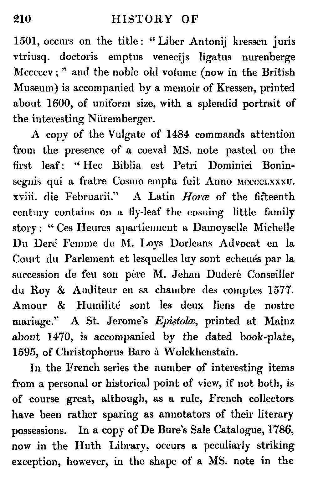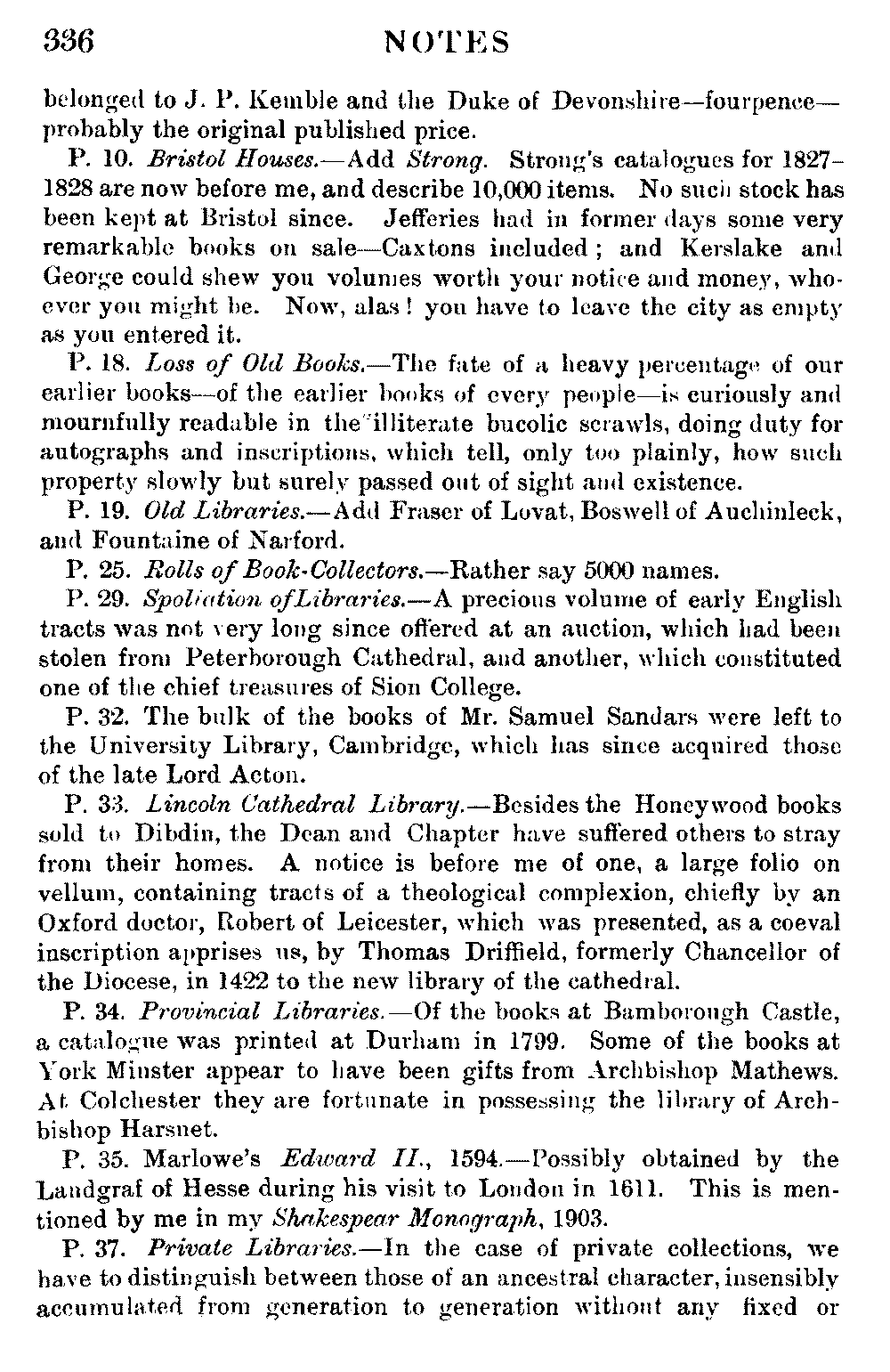 P. 206. Books with MSS. Notes.—There is yet another category of remains among the older literature of all countries, and it is that, in which an acknowledged judge or master of a subject, though himself perhaps a person of no peculiar celebrity, has rendered a copy of some book the medium for preserving for future use matter overlooked by the author or editor or correcting serious errors, and the lapse of time exercises its influence in the appreciation of such adversaria. A living scholar may be capable of going far beyond his predecessors in enriching margins and flyleaves; but there is the caveat that he is our contemporary. The privilege of the grave appertains to the man who laid down his pen ever so long ago. We may know much more than Langbaine or Oldys about the drama, and than Johnson or Malone about Shakespear; yet, depend upon it, their notes are more wanted than ours.