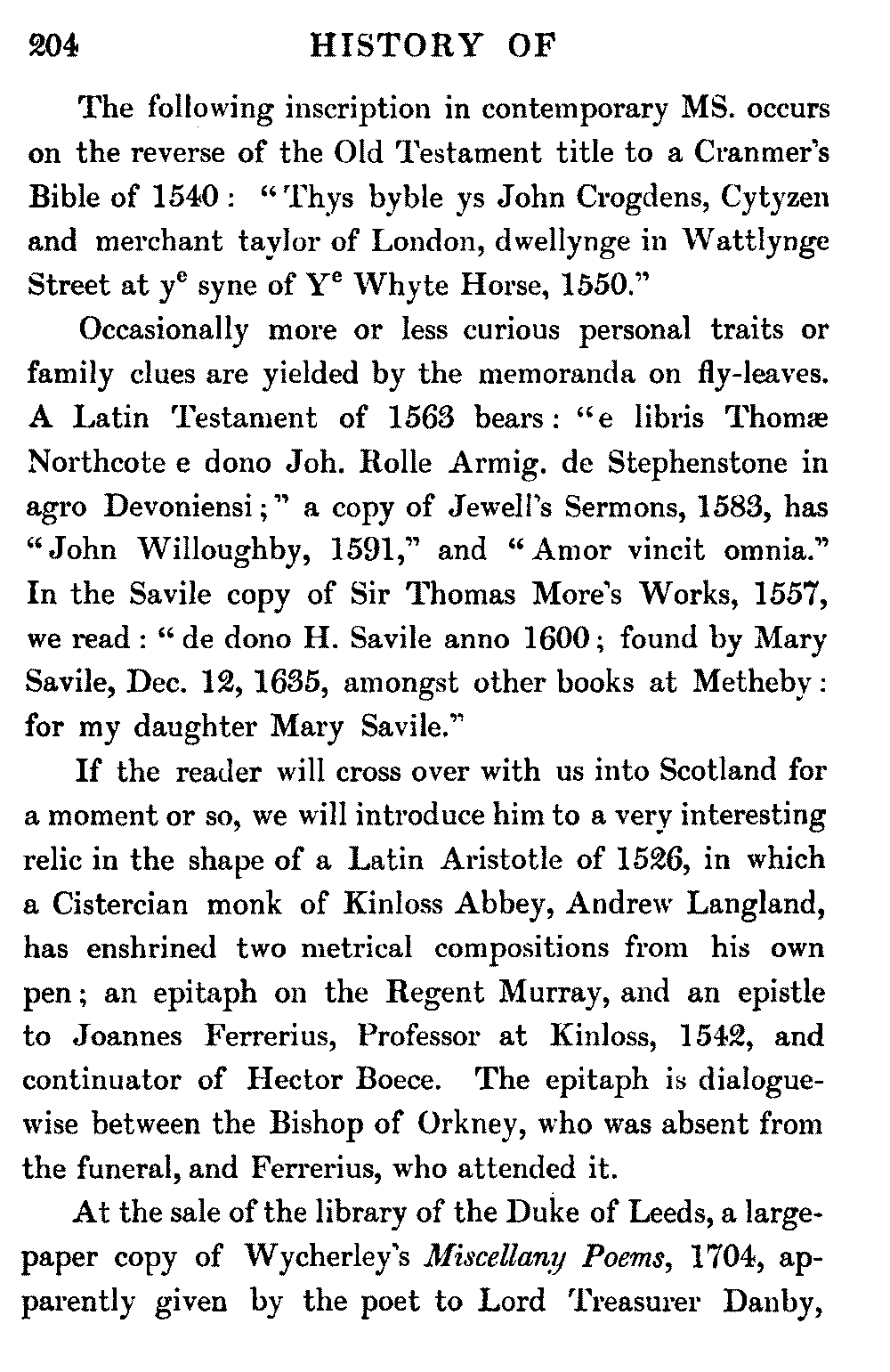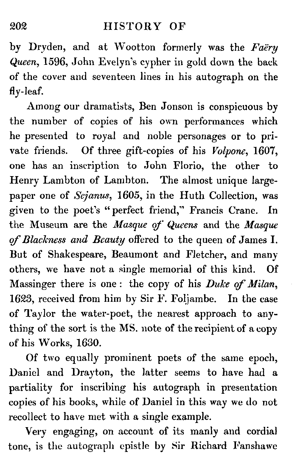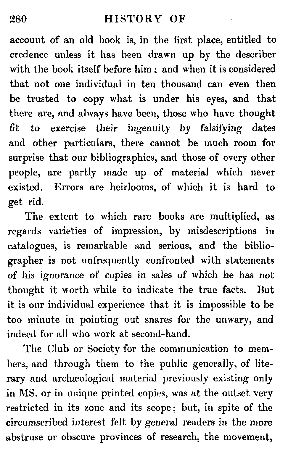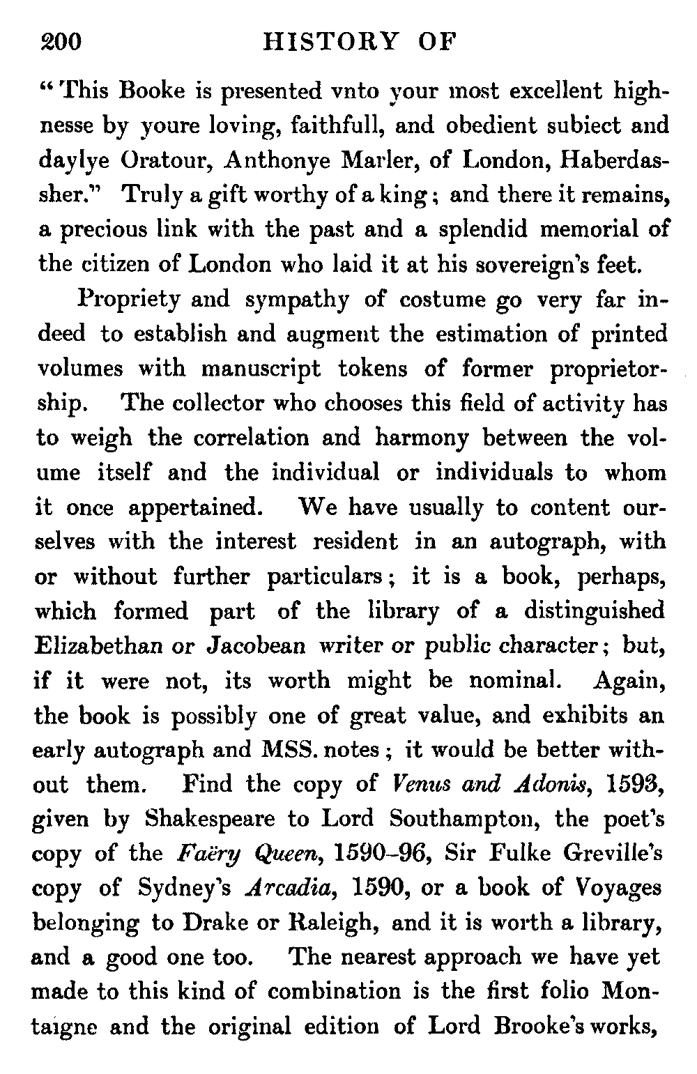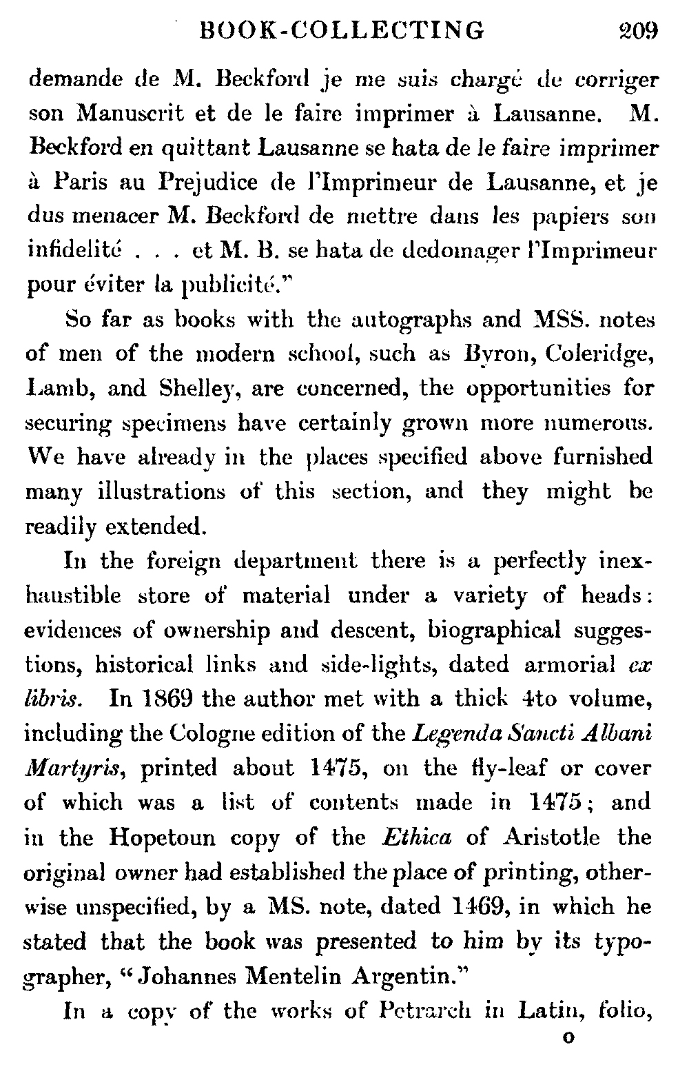 P. 206. Books with MSS. Notes.—There is yet another category of remains among the older literature of all countries, and it is that, in which an acknowledged judge or master of a subject, though himself perhaps a person of no peculiar celebrity, has rendered a copy of some book the medium for preserving for future use matter overlooked by the author or editor or correcting serious errors, and the lapse of time exercises its influence in the appreciation of such adversaria. A living scholar may be capable of going far beyond his predecessors in enriching margins and flyleaves; but there is the caveat that he is our contemporary. The privilege of the grave appertains to the man who laid down his pen ever so long ago. We may know much more than Langbaine or Oldys about the drama, and than Johnson or Malone about Shakespear; yet, depend upon it, their notes are more wanted than ours.