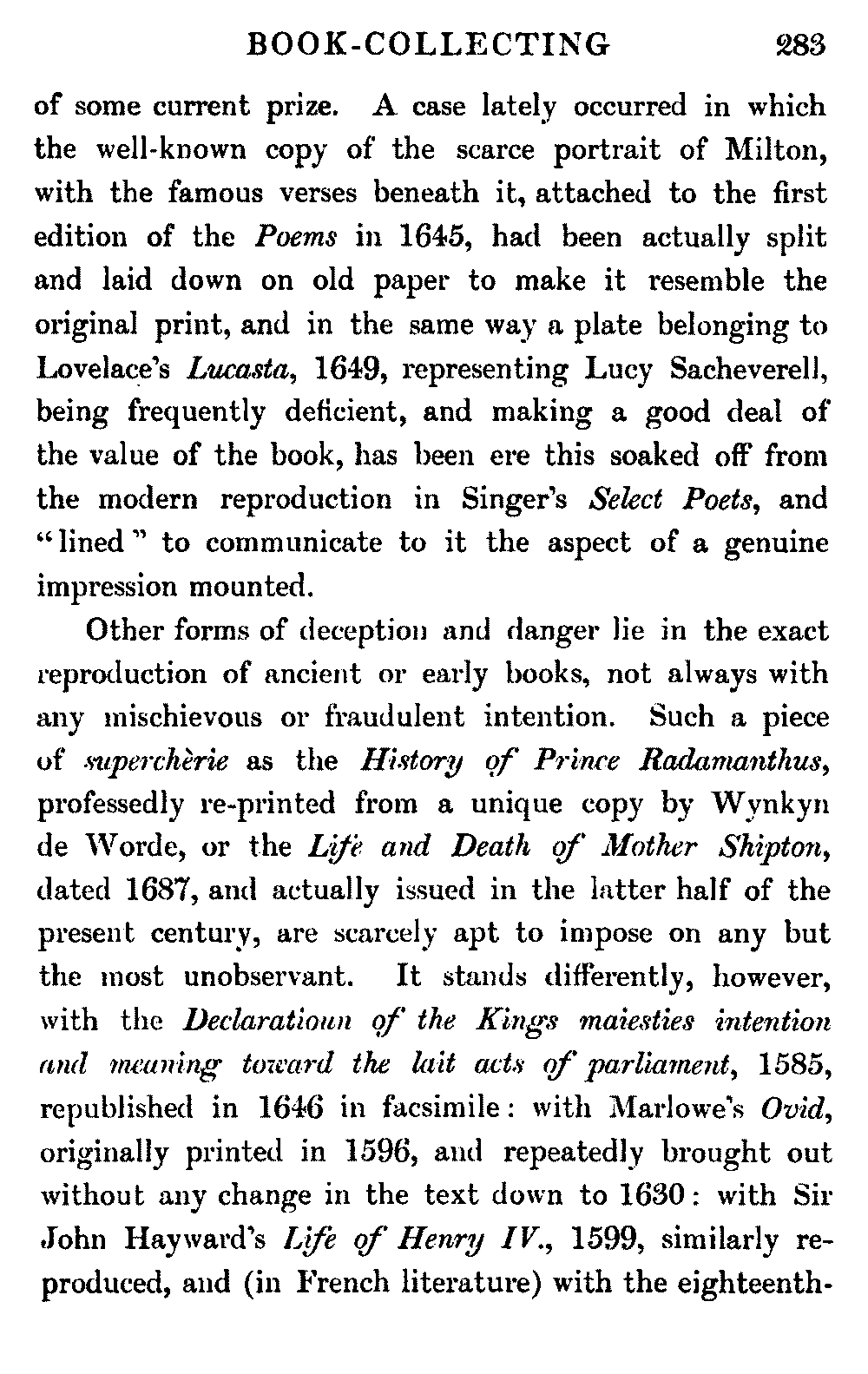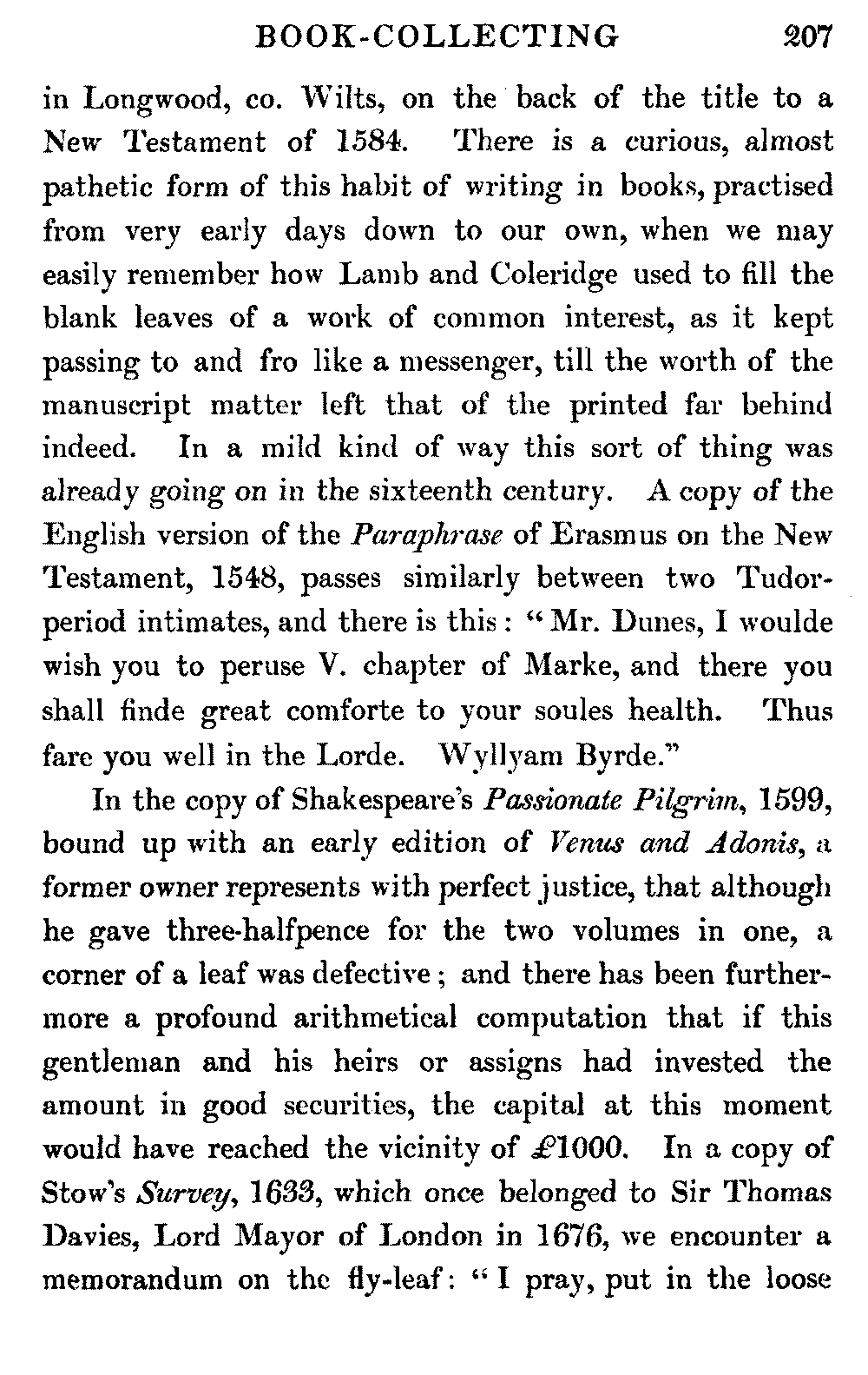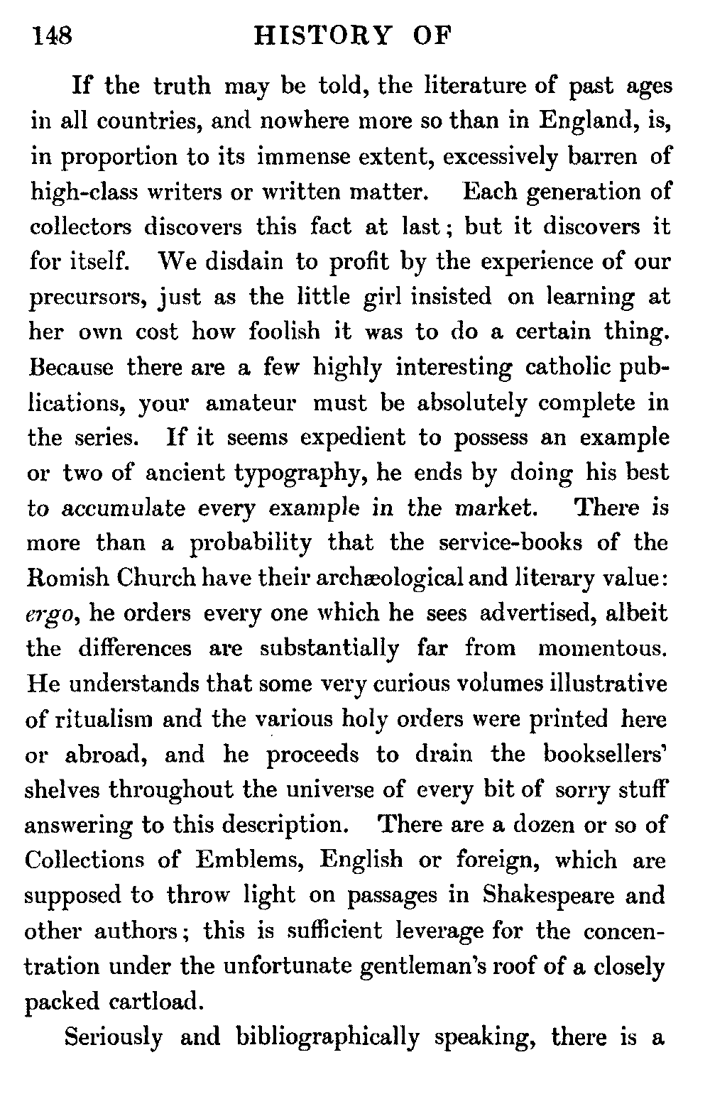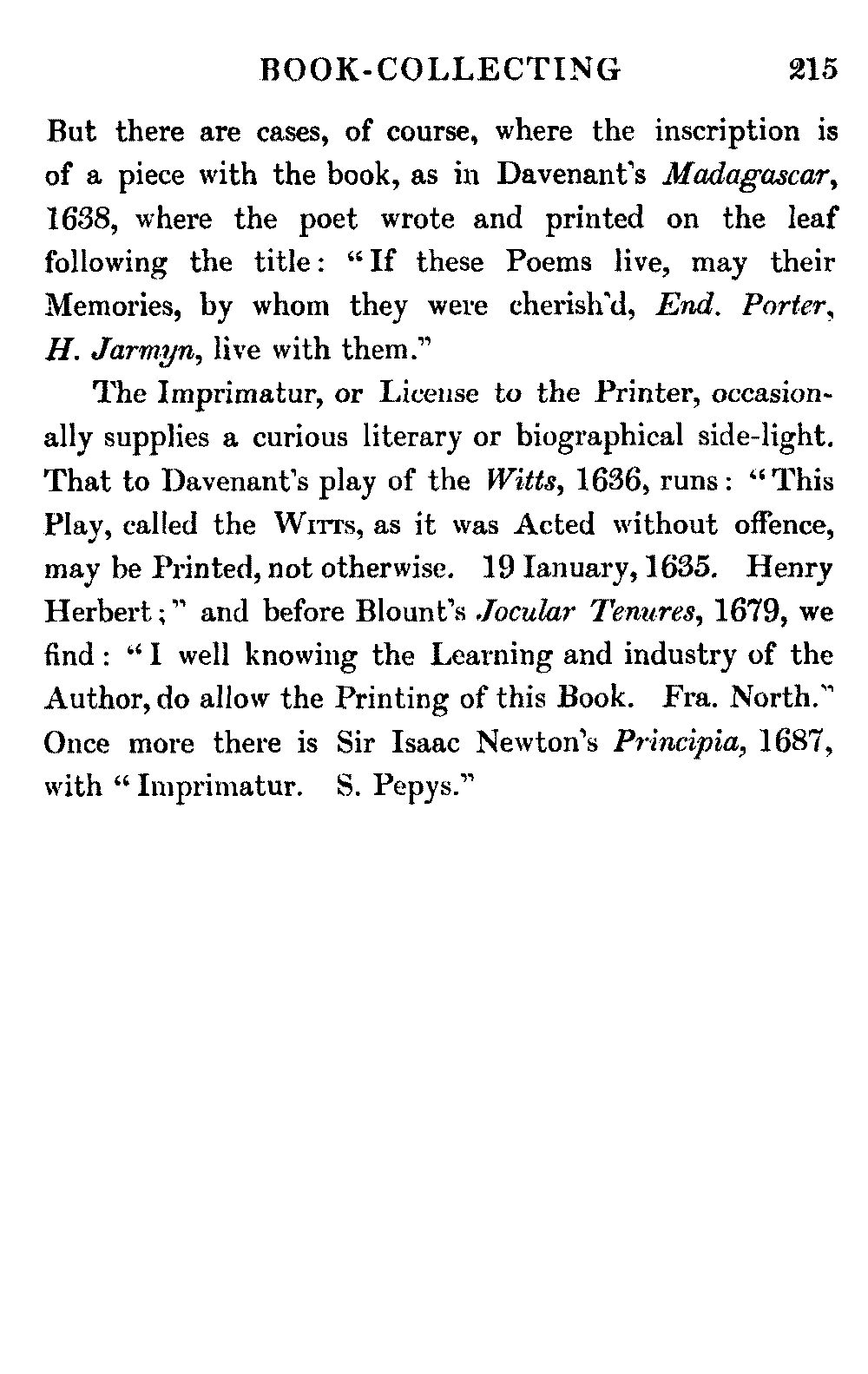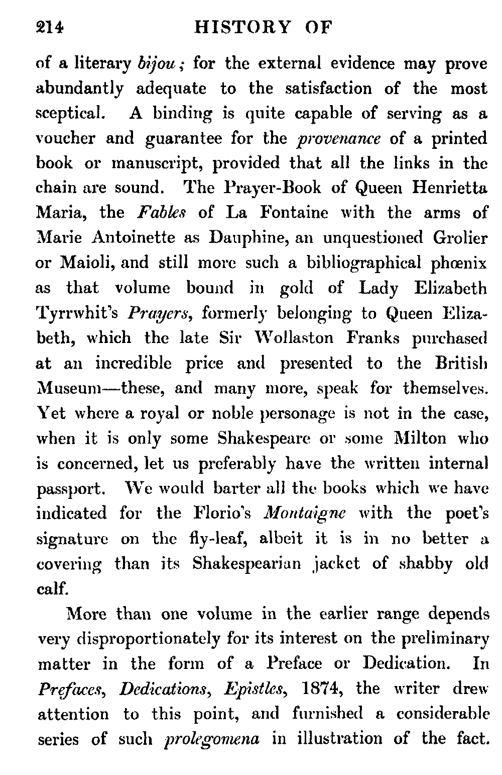 P. 206. Books with MSS. Notes.—There is yet another category of remains among the older literature of all countries, and it is that, in which an acknowledged judge or master of a subject, though himself perhaps a person of no peculiar celebrity, has rendered a copy of some book the medium for preserving for future use matter overlooked by the author or editor or correcting serious errors, and the lapse of time exercises its influence in the appreciation of such adversaria. A living scholar may be capable of going far beyond his predecessors in enriching margins and flyleaves; but there is the caveat that he is our contemporary. The privilege of the grave appertains to the man who laid down his pen ever so long ago. We may know much more than Langbaine or Oldys about the drama, and than Johnson or Malone about Shakespear; yet, depend upon it, their notes are more wanted than ours.