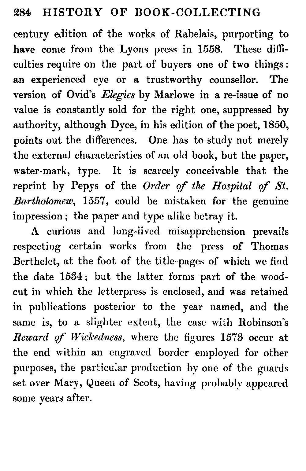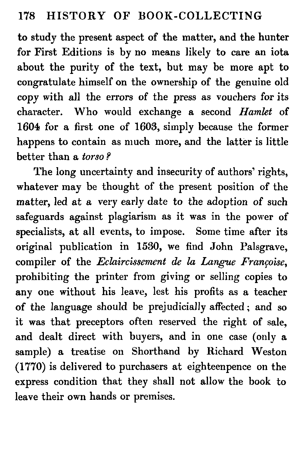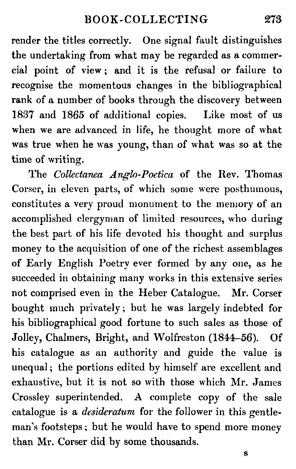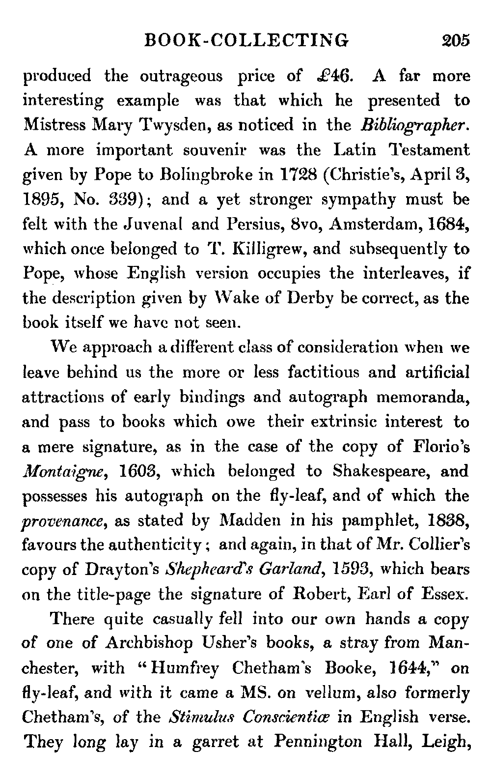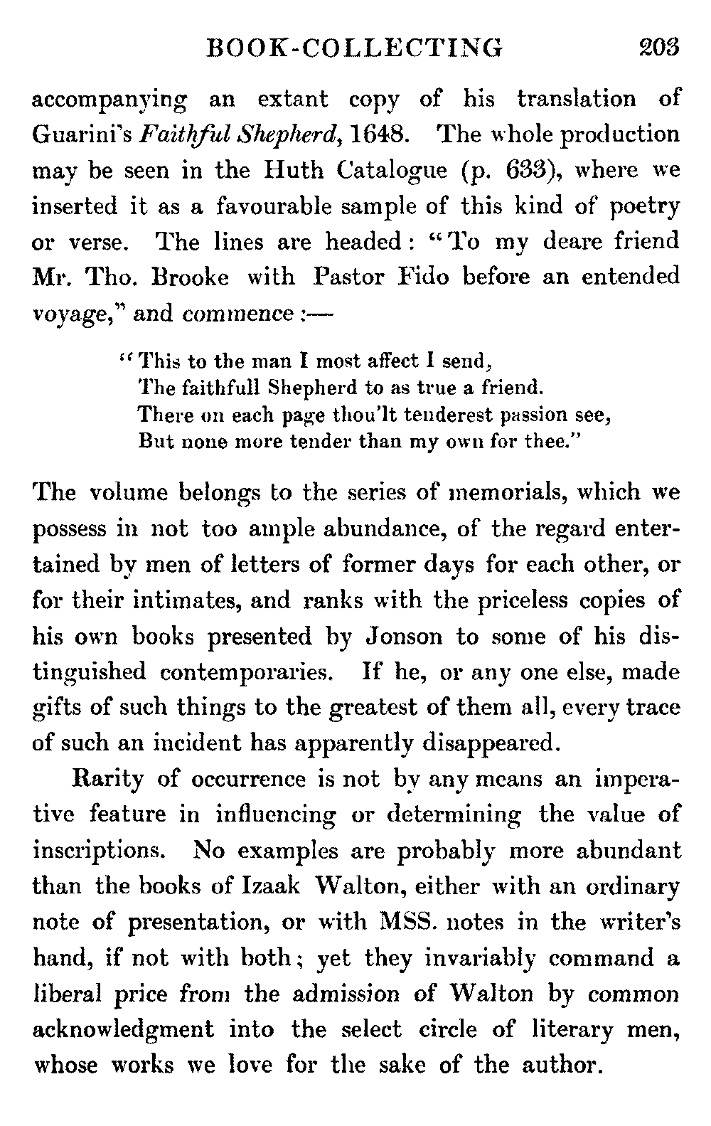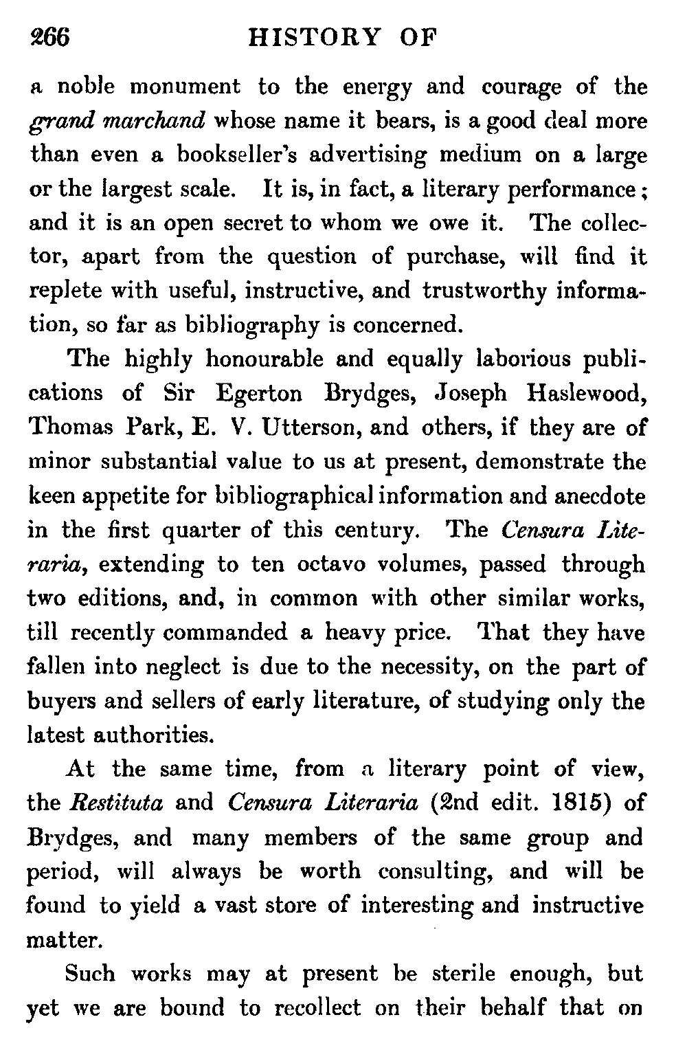P. 206. Books with MSS. Notes.—There is yet another category of remains among the older literature of all countries, and it is that, in which an acknowledged judge or master of a subject, though himself perhaps a person of no peculiar celebrity, has rendered a copy of some book the medium for preserving for future use matter overlooked by the author or editor or correcting serious errors, and the lapse of time exercises its influence in the appreciation of such adversaria. A living scholar may be capable of going far beyond his predecessors in enriching margins and flyleaves; but there is the caveat that he is our contemporary. The privilege of the grave appertains to the man who laid down his pen ever so long ago. We may know much more than Langbaine or Oldys about the drama, and than Johnson or Malone about Shakespear; yet, depend upon it, their notes are more wanted than ours.
