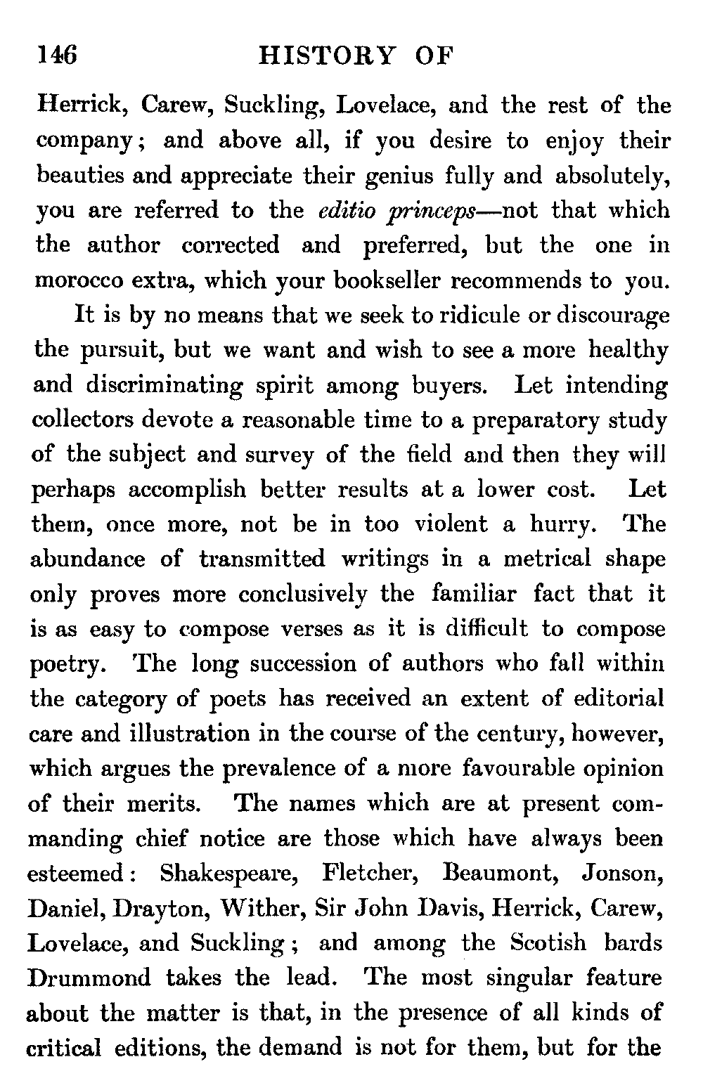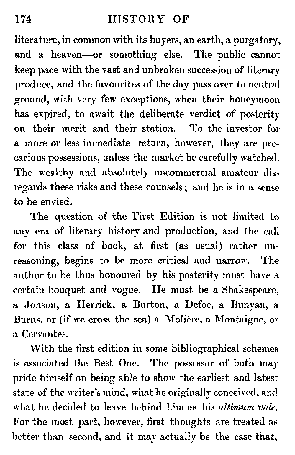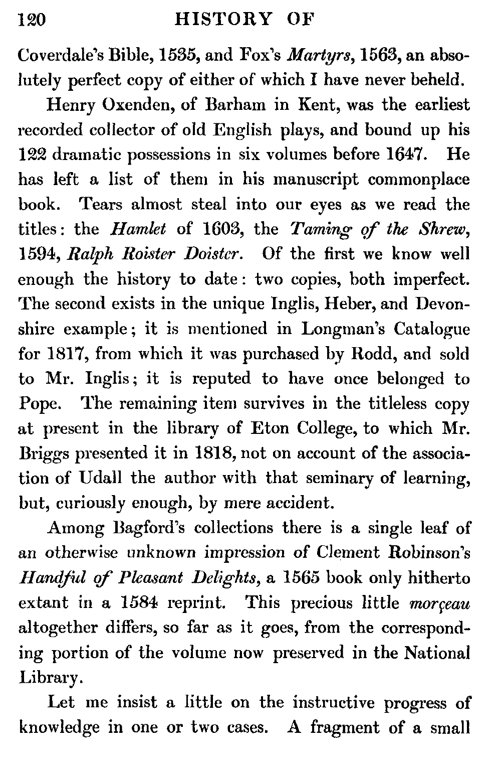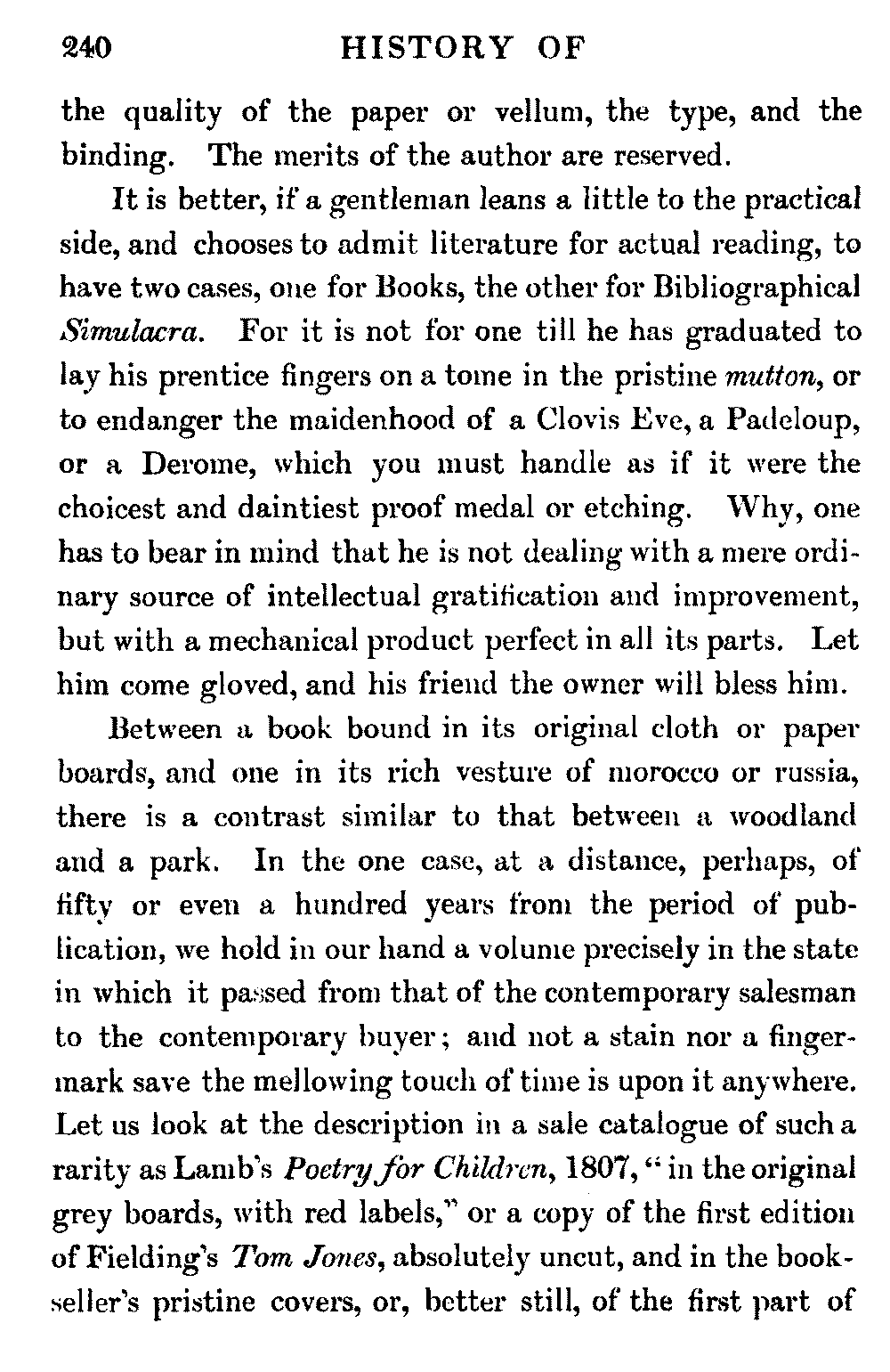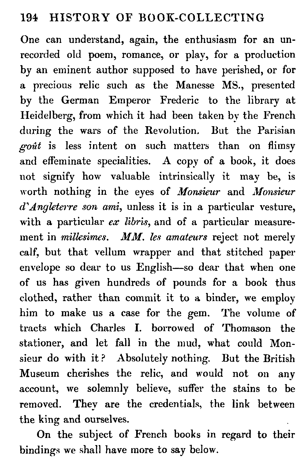 P. 206. Books with MSS. Notes.—There is yet another category of remains among the older literature of all countries, and it is that, in which an acknowledged judge or master of a subject, though himself perhaps a person of no peculiar celebrity, has rendered a copy of some book the medium for preserving for future use matter overlooked by the author or editor or correcting serious errors, and the lapse of time exercises its influence in the appreciation of such adversaria. A living scholar may be capable of going far beyond his predecessors in enriching margins and flyleaves; but there is the caveat that he is our contemporary. The privilege of the grave appertains to the man who laid down his pen ever so long ago. We may know much more than Langbaine or Oldys about the drama, and than Johnson or Malone about Shakespear; yet, depend upon it, their notes are more wanted than ours.