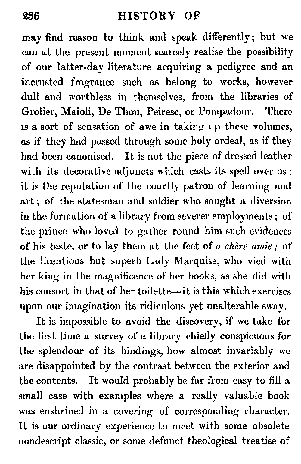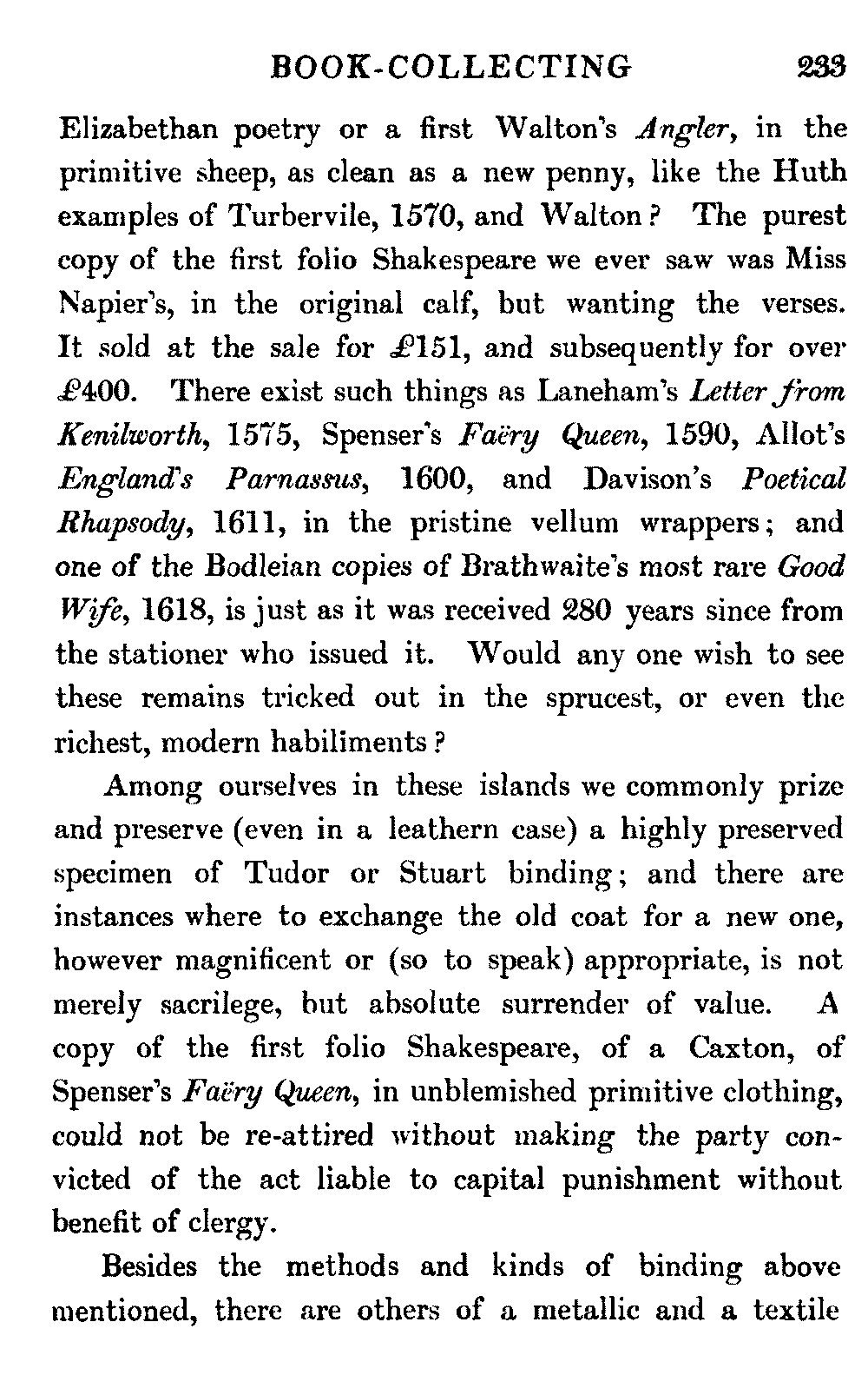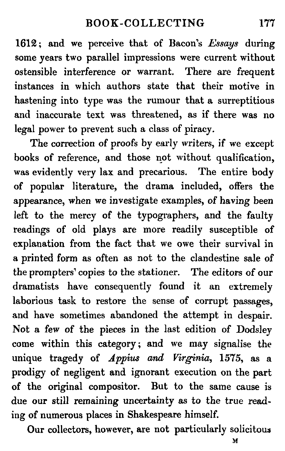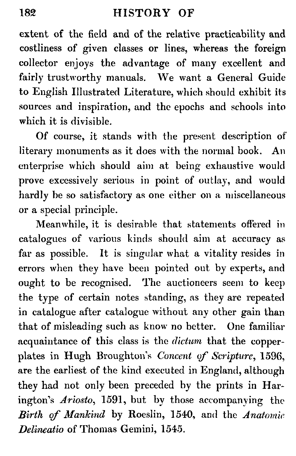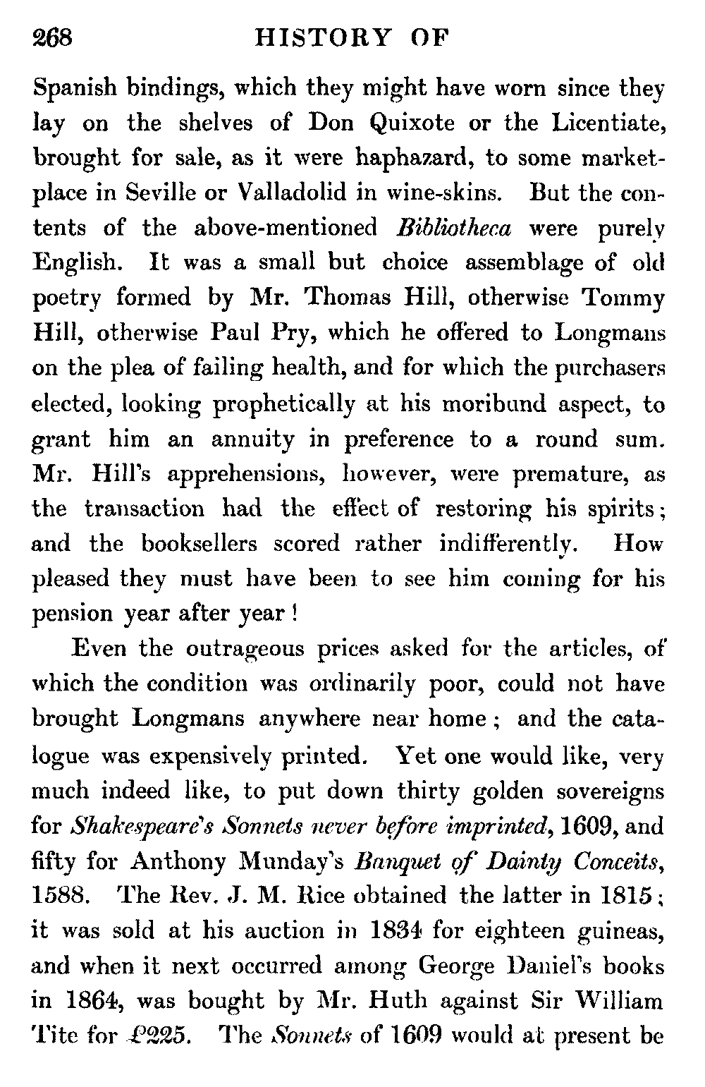 P. 206. Books with MSS. Notes.—There is yet another category of remains among the older literature of all countries, and it is that, in which an acknowledged judge or master of a subject, though himself perhaps a person of no peculiar celebrity, has rendered a copy of some book the medium for preserving for future use matter overlooked by the author or editor or correcting serious errors, and the lapse of time exercises its influence in the appreciation of such adversaria. A living scholar may be capable of going far beyond his predecessors in enriching margins and flyleaves; but there is the caveat that he is our contemporary. The privilege of the grave appertains to the man who laid down his pen ever so long ago. We may know much more than Langbaine or Oldys about the drama, and than Johnson or Malone about Shakespear; yet, depend upon it, their notes are more wanted than ours.