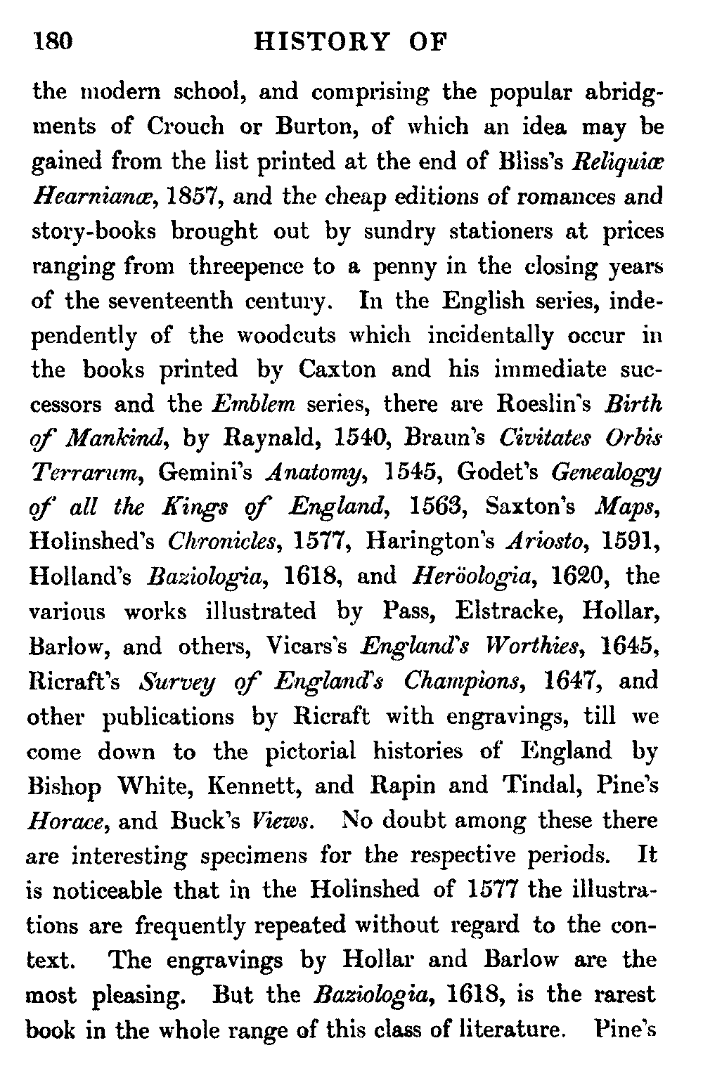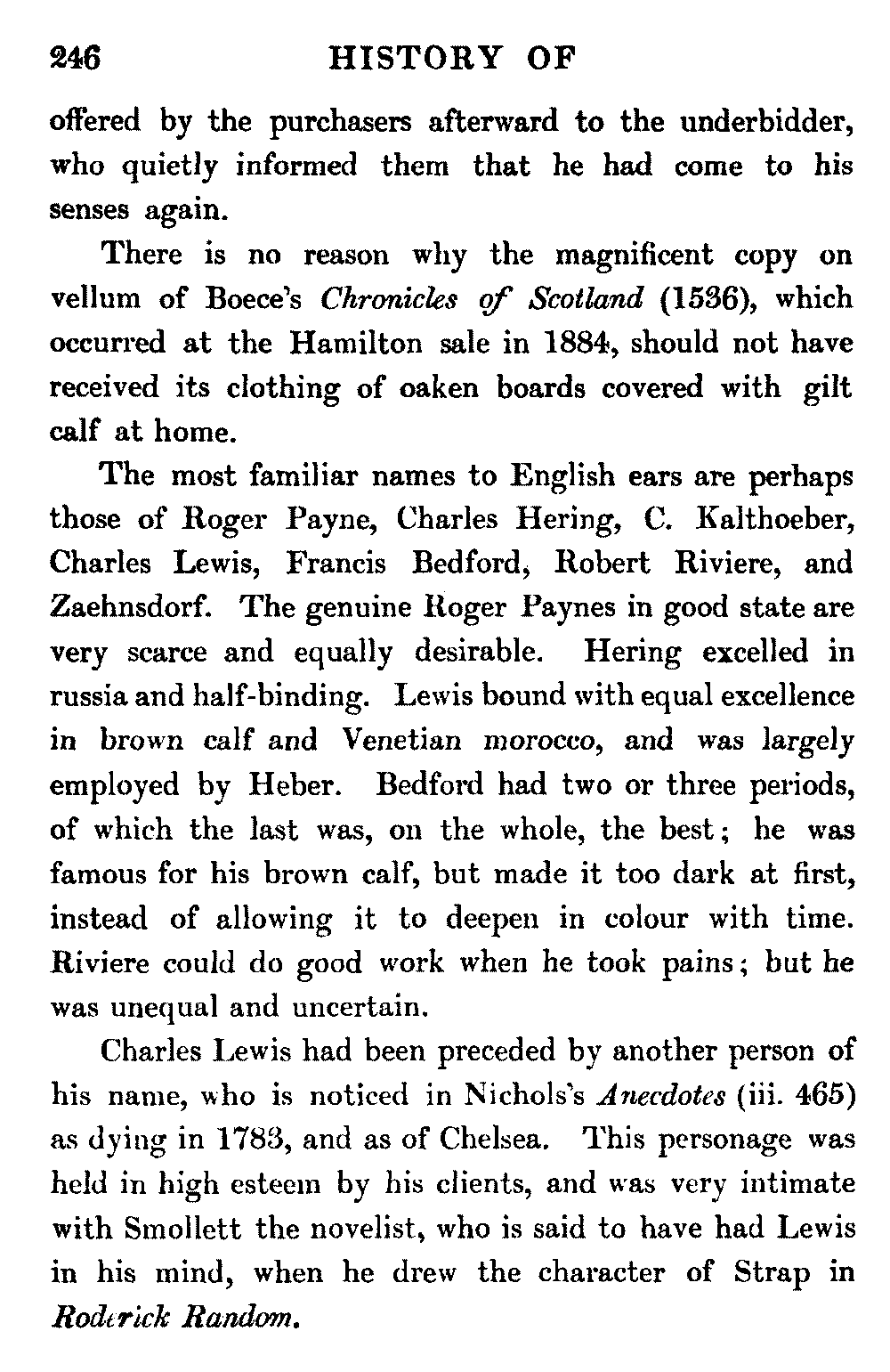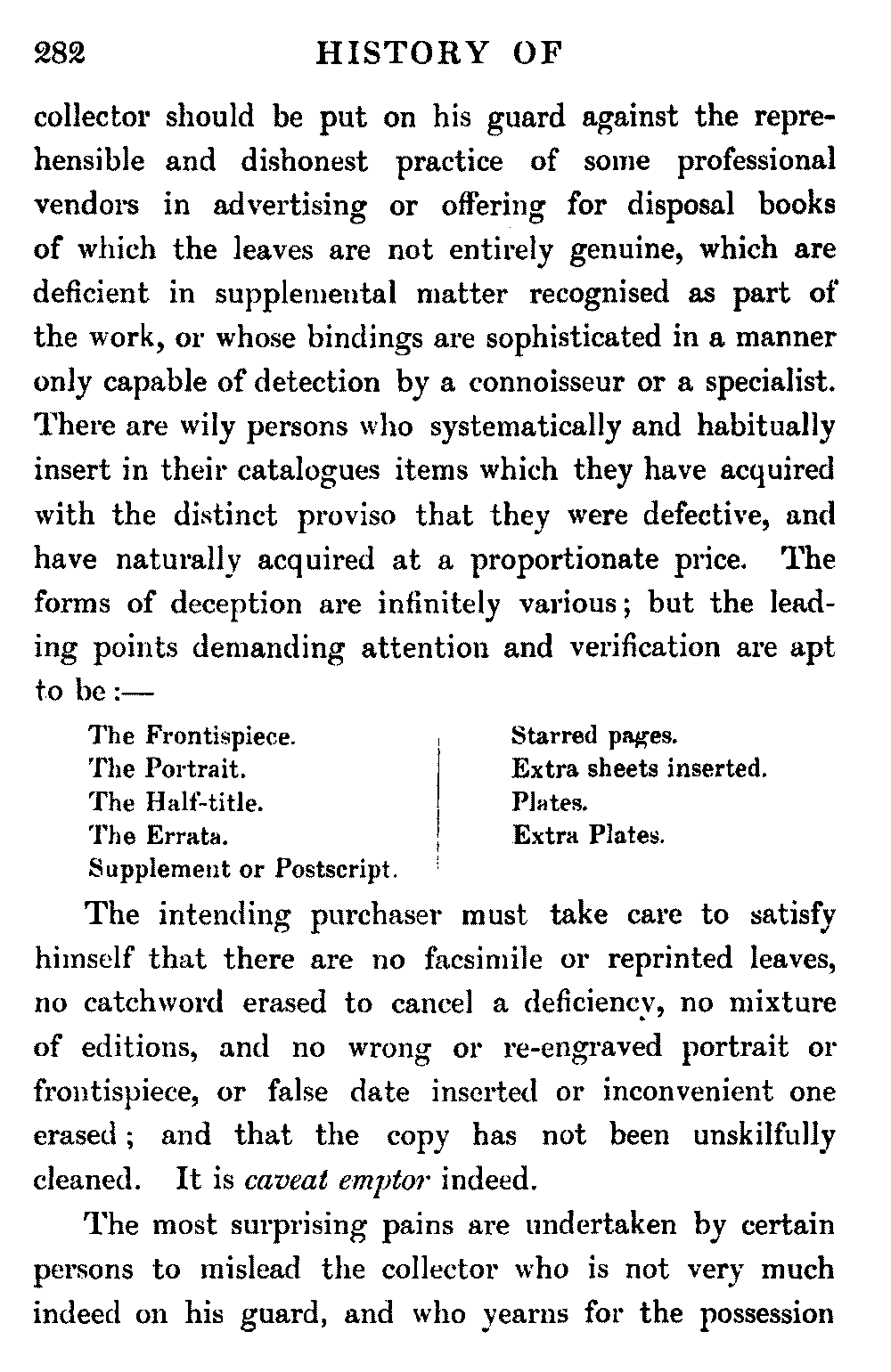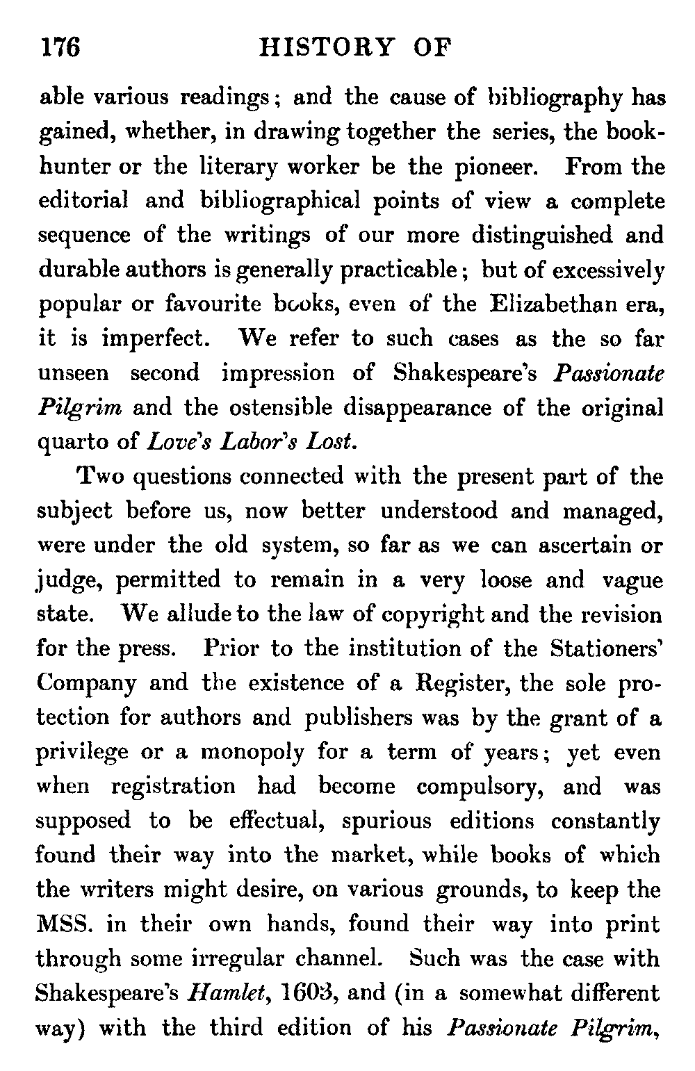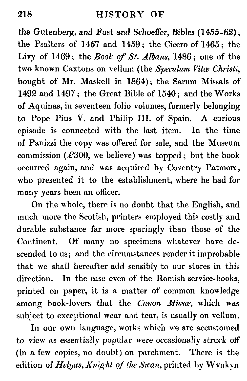 P. 206. Books with MSS. Notes.—There is yet another category of remains among the older literature of all countries, and it is that, in which an acknowledged judge or master of a subject, though himself perhaps a person of no peculiar celebrity, has rendered a copy of some book the medium for preserving for future use matter overlooked by the author or editor or correcting serious errors, and the lapse of time exercises its influence in the appreciation of such adversaria. A living scholar may be capable of going far beyond his predecessors in enriching margins and flyleaves; but there is the caveat that he is our contemporary. The privilege of the grave appertains to the man who laid down his pen ever so long ago. We may know much more than Langbaine or Oldys about the drama, and than Johnson or Malone about Shakespear; yet, depend upon it, their notes are more wanted than ours.