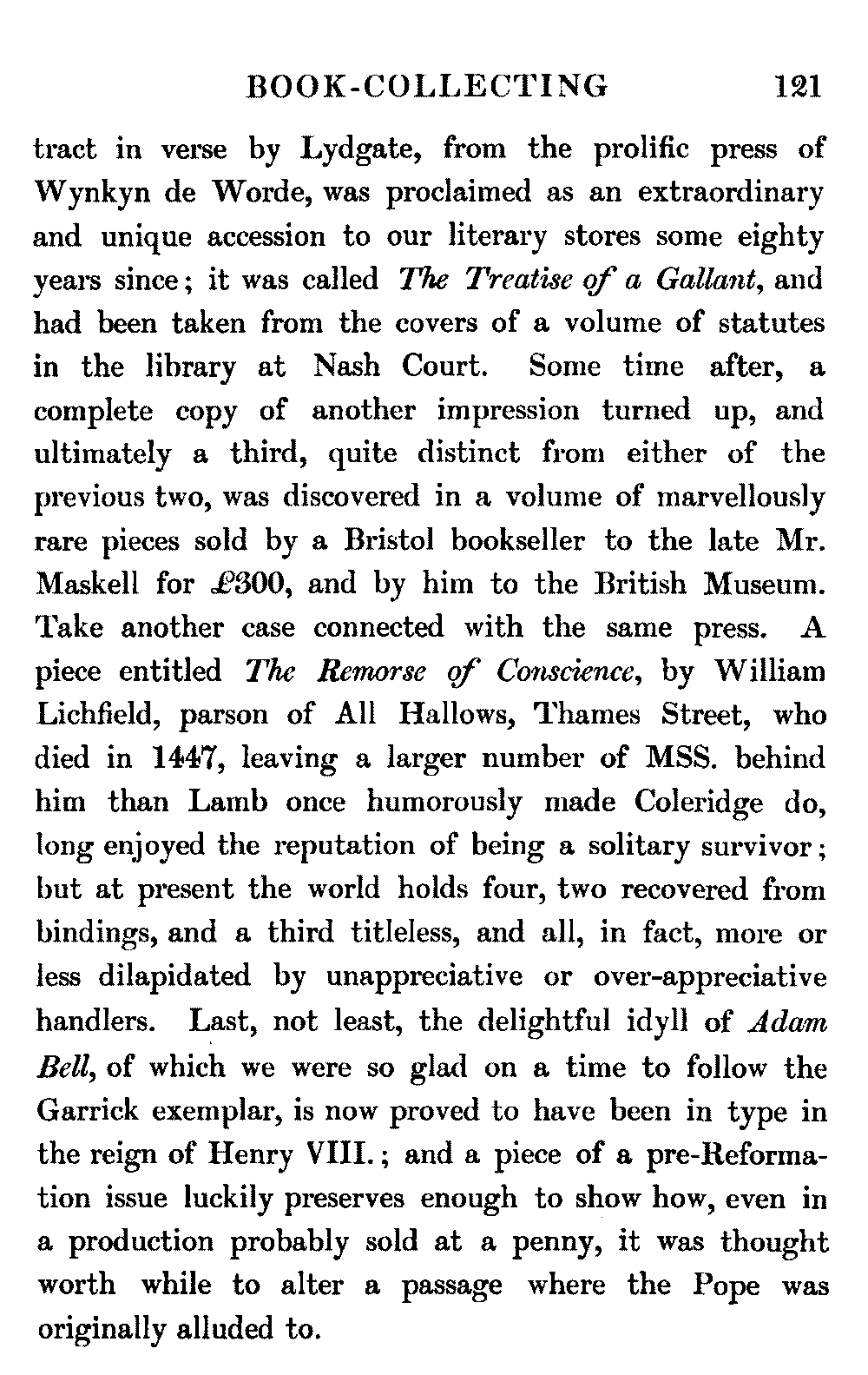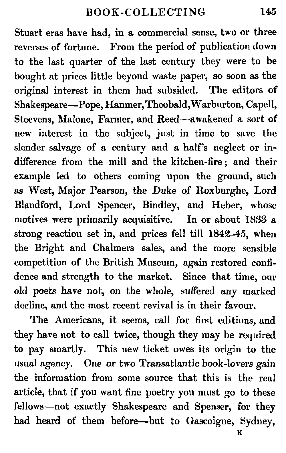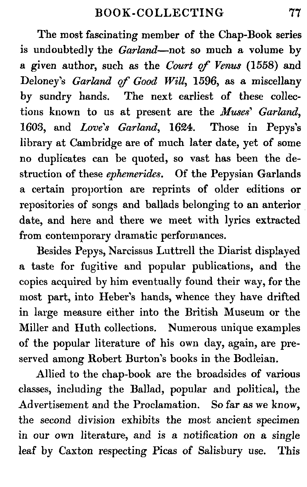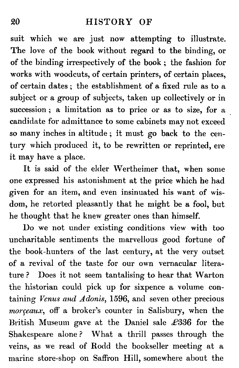 Do we not under existing conditions view with too uncharitable sentiments the marvellous good fortune of the book-hunters of the last century, at the very outset of a revival of the taste for our own vernacular literature? Does it not seem tantalising to hear that Warton the historian could pick up for sixpence a volume containing Venus and Adonis, 1596, and seven other precious morçeaux, off a broker's counter in Salisbury, when the British Museum gave at the Daniel sale £336 for the Shakespeare alone? What a thrill passes through the veins, as we read of Rodd the bookseller meeting at a marine store-shop on Saffron Hill, somewhere about the[21] thirties, with a volume of Elizabethan tracts, and having it weighed out to him at threepence three-farthings! Our space is far more limited than such anecdotes; but they all strike us as pointing the same moral. If one happens on a Caxton or a quarto Shakespeare to-day for a trifle, it is the isolated ignorance of the possessor which befriends one. But till the market came for these things, the price for what very few wanted was naturally low; and an acquirer like George Steevens, Edward Capell, or Edmond Malone was scarcely apt to feel the keen gratification on meeting with some unique find that a man would now do, seeing that its rarity was yet unascertained, and even had it been so, was not likely to awaken much sensation.