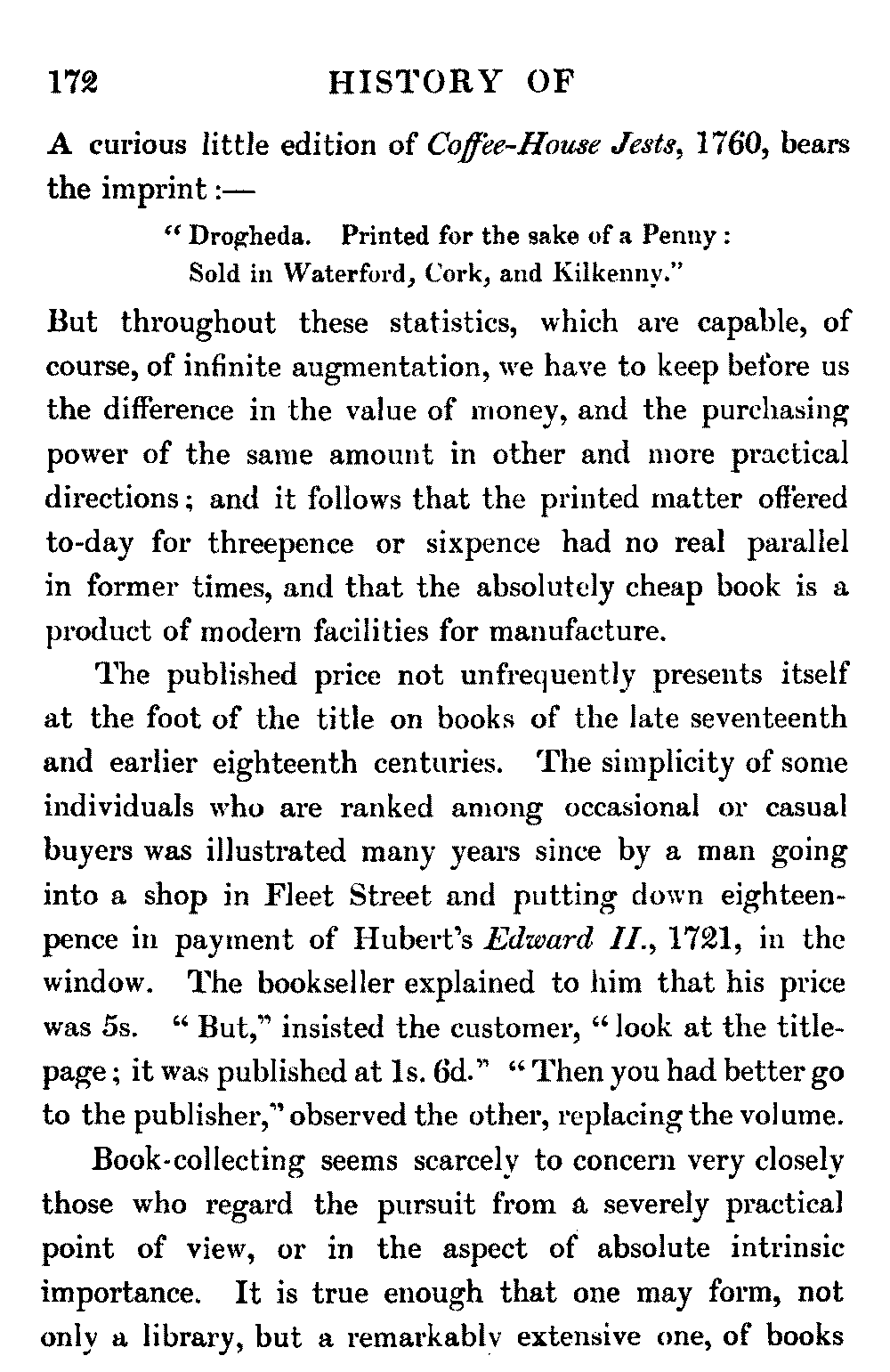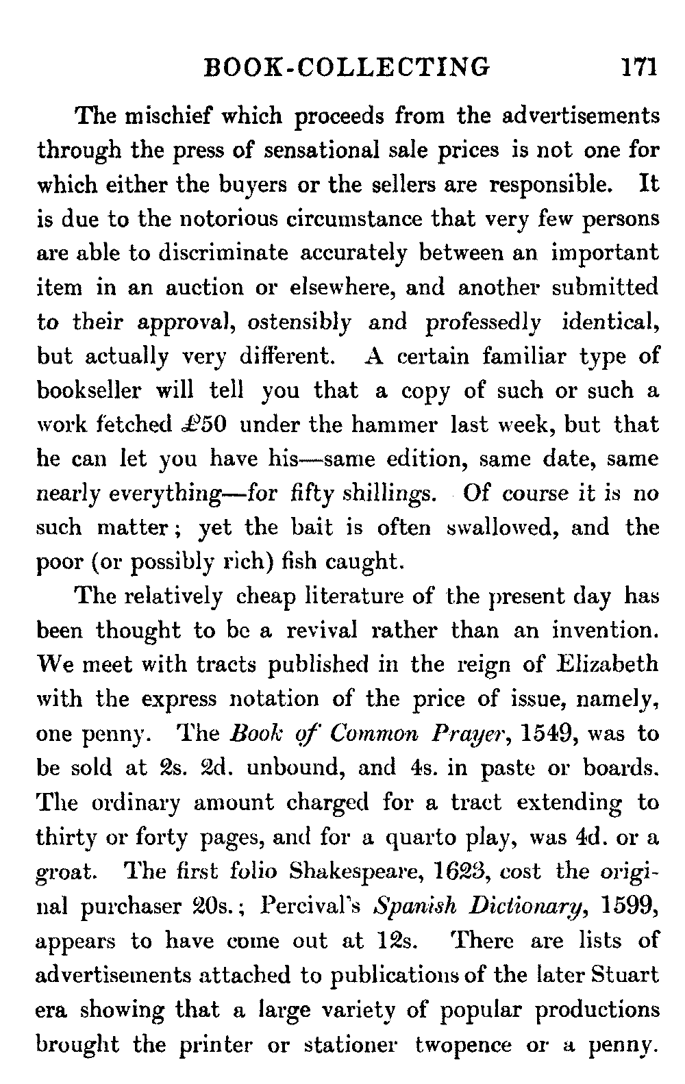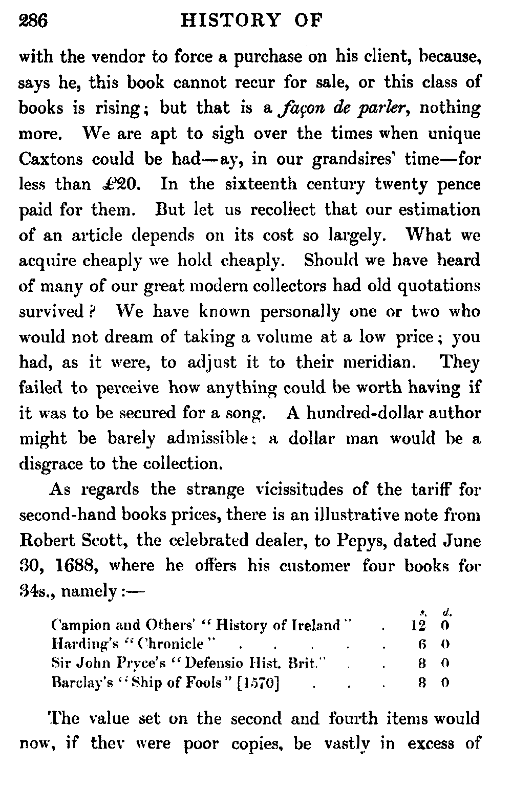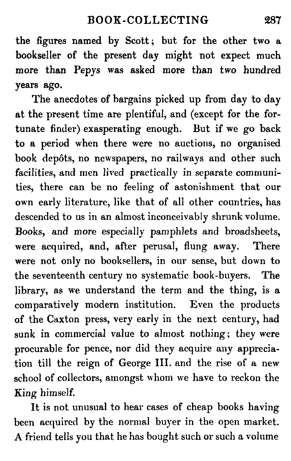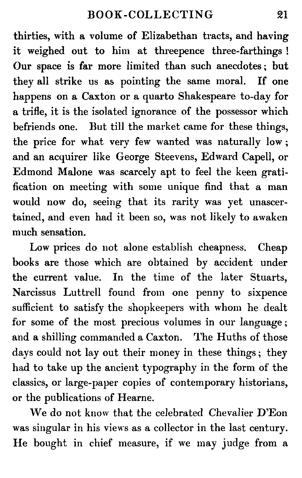 Low prices do not alone establish cheapness. Cheap books are those which are obtained by accident under the current value. In the time of the later Stuarts, Narcissus Luttrell found from one penny to sixpence sufficient to satisfy the shopkeepers with whom he dealt for some of the most precious volumes in our language; and a shilling commanded a Caxton. The Huths of those days could not lay out their money in these things; they had to take up the ancient typography in the form of the classics, or large-paper copies of contemporary historians, or the publications of Hearne.
