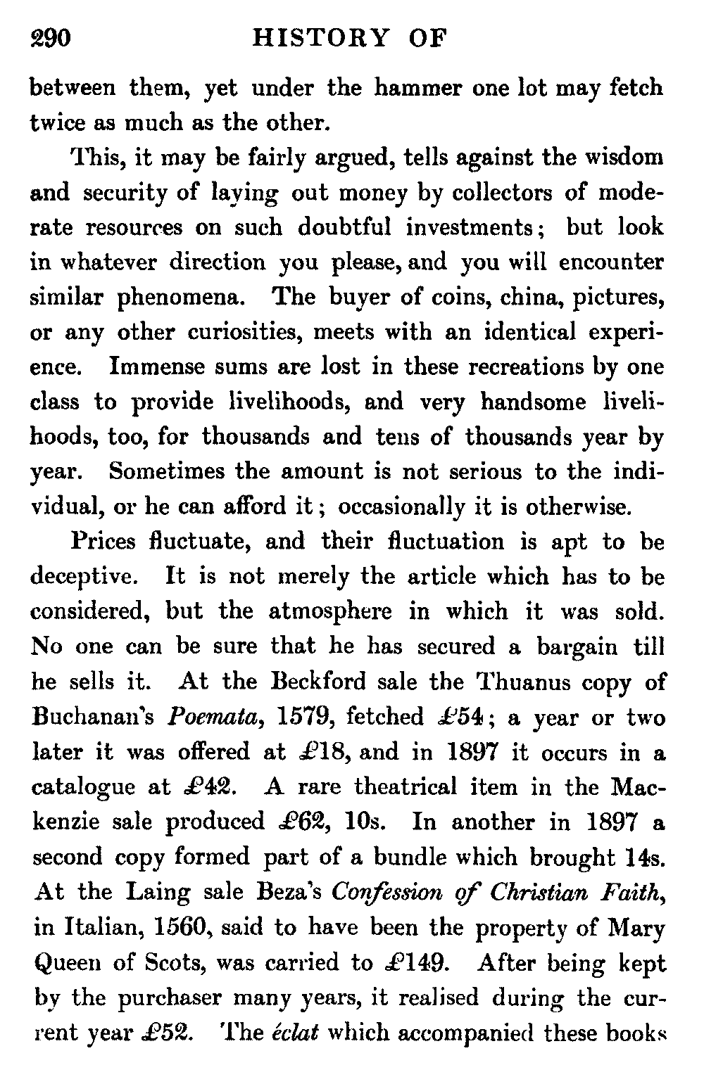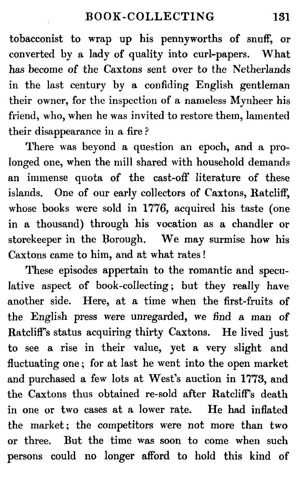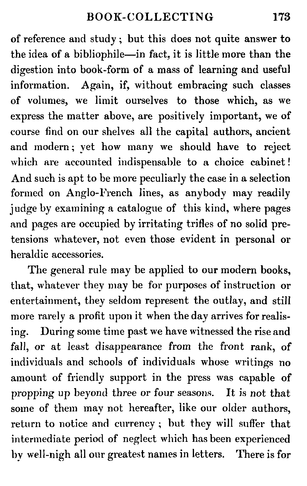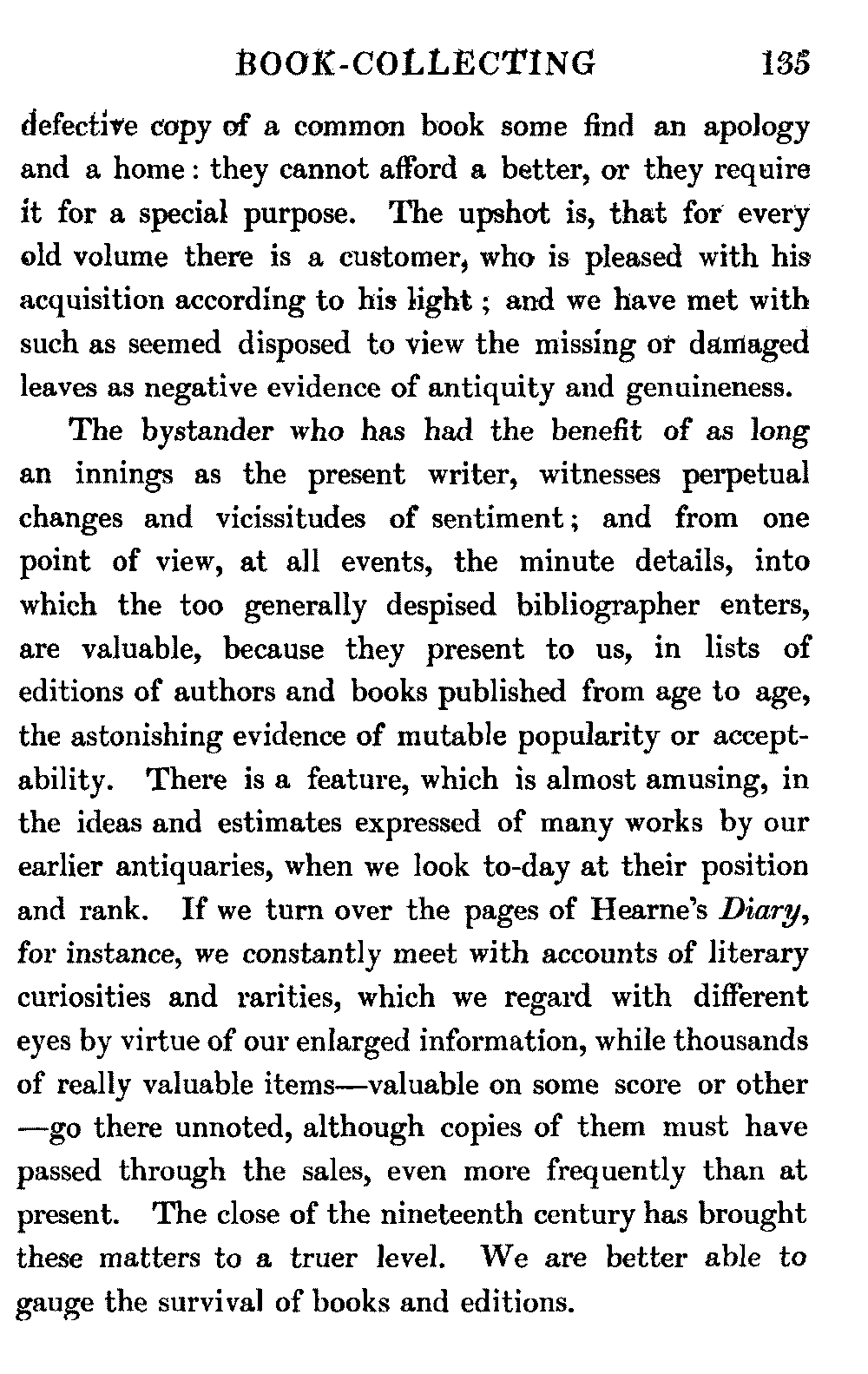 Low prices do not alone establish cheapness. Cheap books are those which are obtained by accident under the current value. In the time of the later Stuarts, Narcissus Luttrell found from one penny to sixpence sufficient to satisfy the shopkeepers with whom he dealt for some of the most precious volumes in our language; and a shilling commanded a Caxton. The Huths of those days could not lay out their money in these things; they had to take up the ancient typography in the form of the classics, or large-paper copies of contemporary historians, or the publications of Hearne.