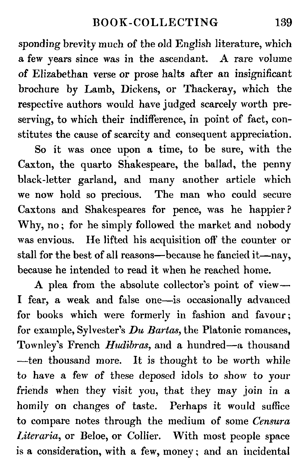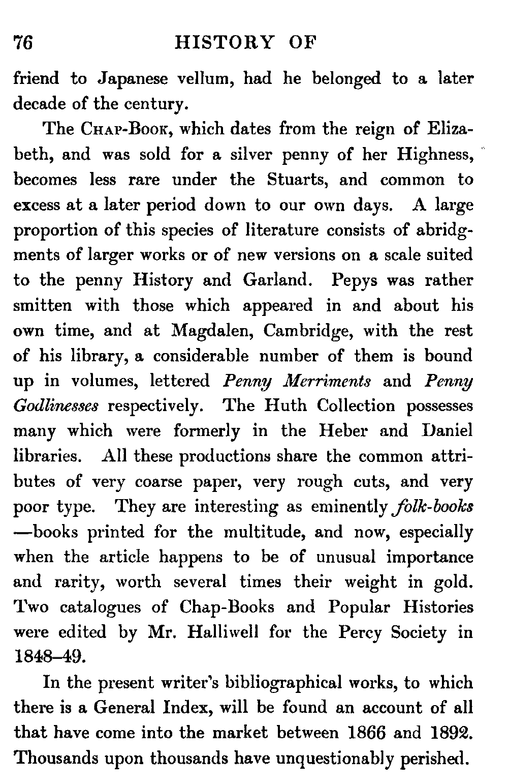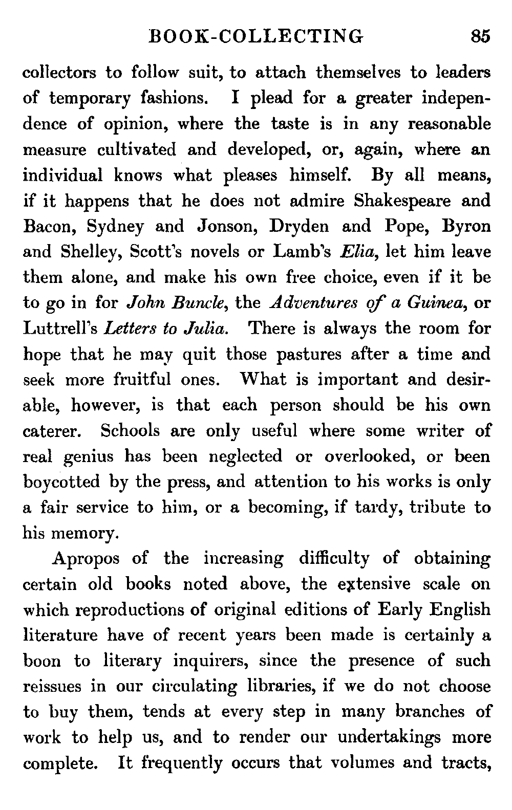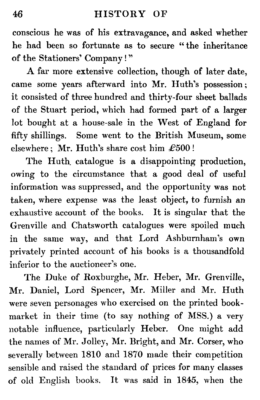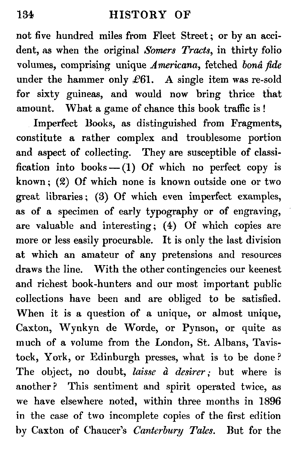 Low prices do not alone establish cheapness. Cheap books are those which are obtained by accident under the current value. In the time of the later Stuarts, Narcissus Luttrell found from one penny to sixpence sufficient to satisfy the shopkeepers with whom he dealt for some of the most precious volumes in our language; and a shilling commanded a Caxton. The Huths of those days could not lay out their money in these things; they had to take up the ancient typography in the form of the classics, or large-paper copies of contemporary historians, or the publications of Hearne.