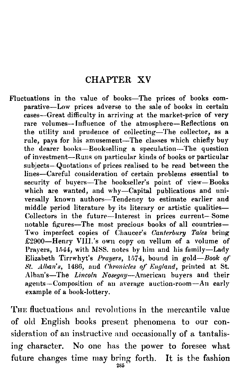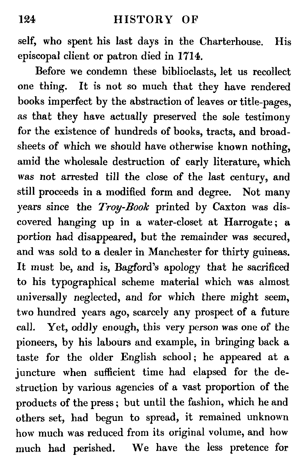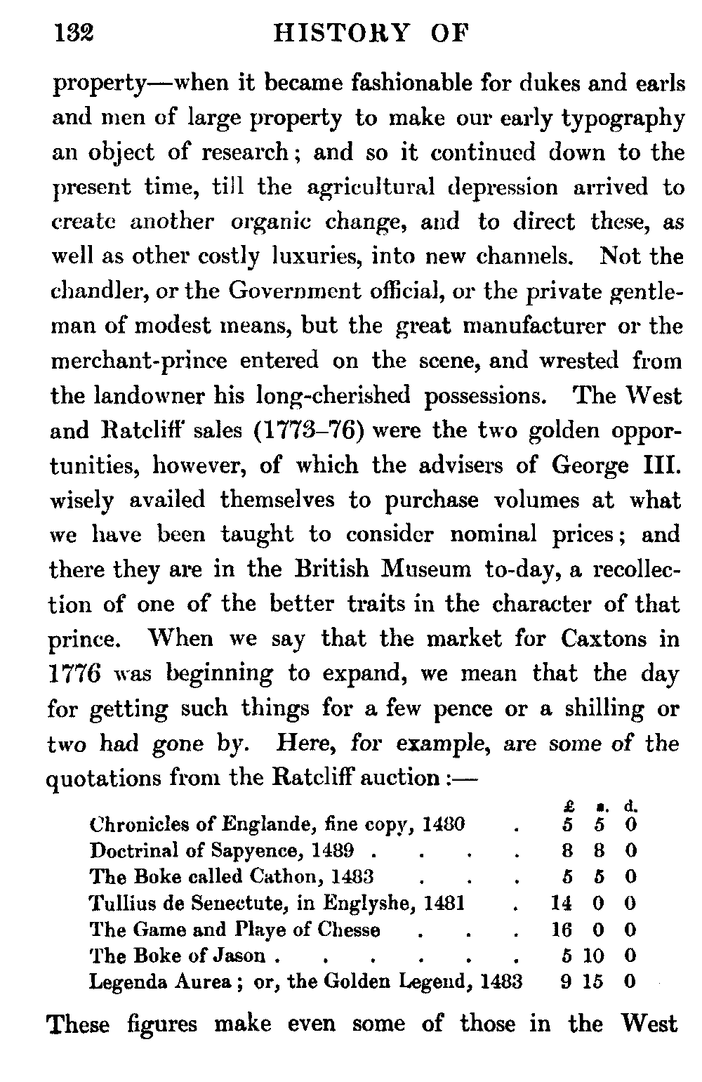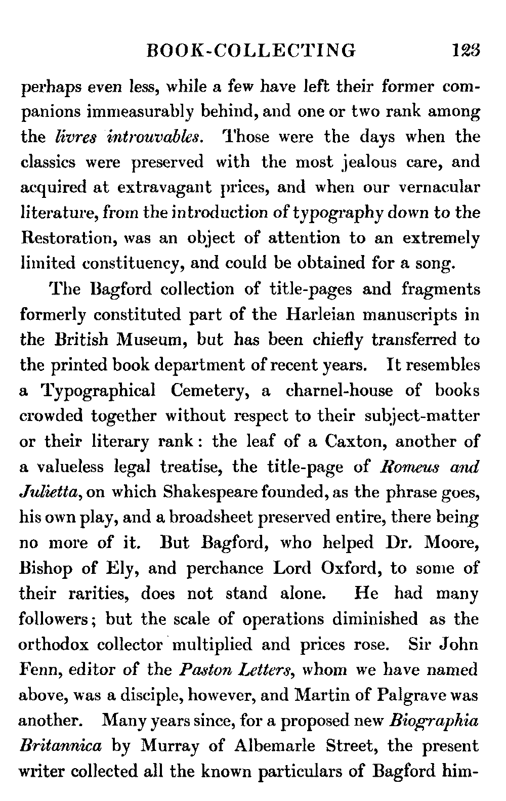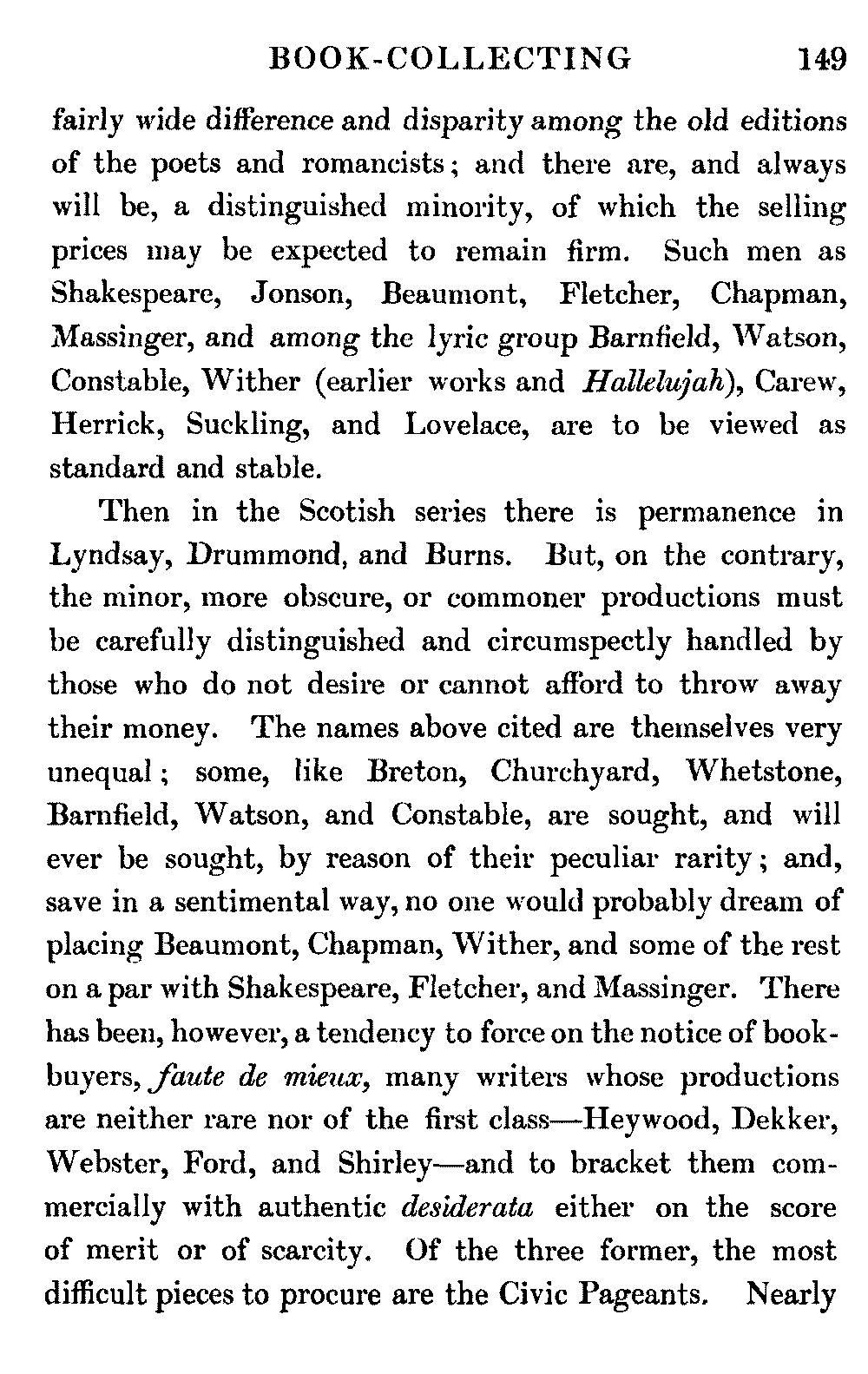 Low prices do not alone establish cheapness. Cheap books are those which are obtained by accident under the current value. In the time of the later Stuarts, Narcissus Luttrell found from one penny to sixpence sufficient to satisfy the shopkeepers with whom he dealt for some of the most precious volumes in our language; and a shilling commanded a Caxton. The Huths of those days could not lay out their money in these things; they had to take up the ancient typography in the form of the classics, or large-paper copies of contemporary historians, or the publications of Hearne.