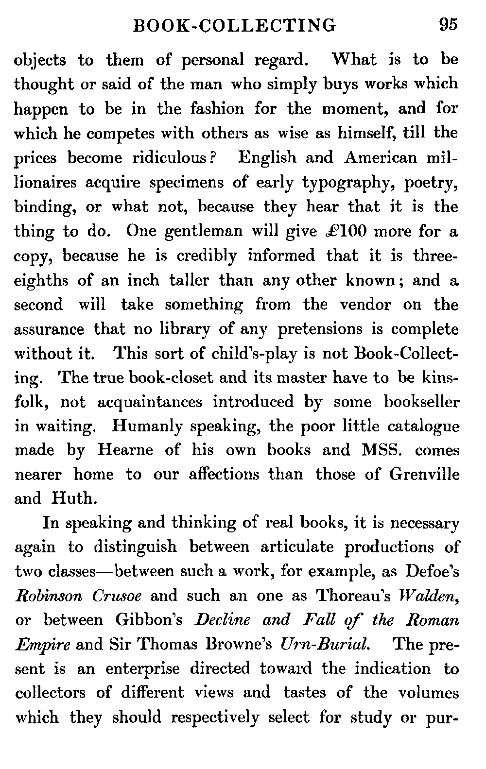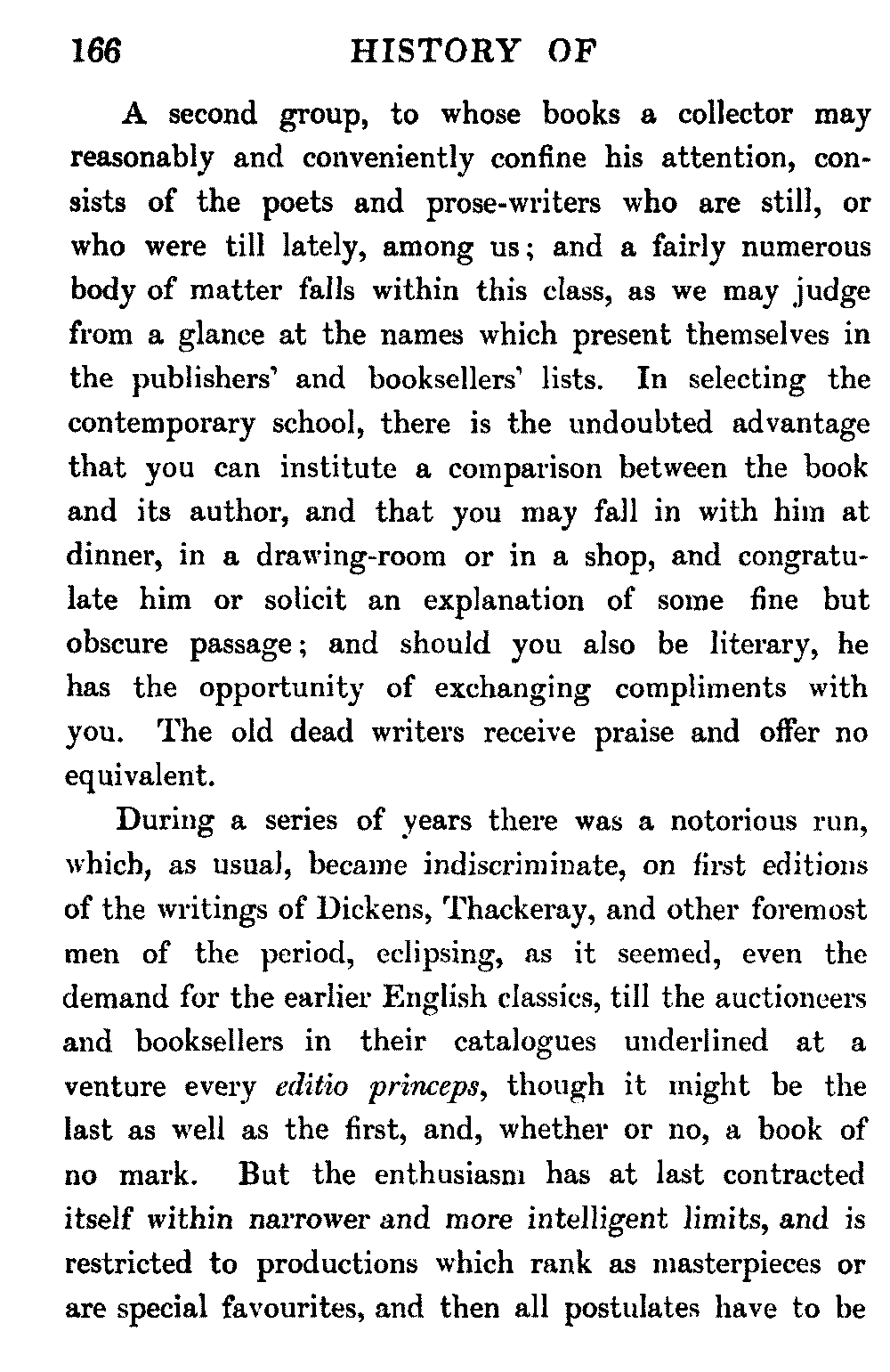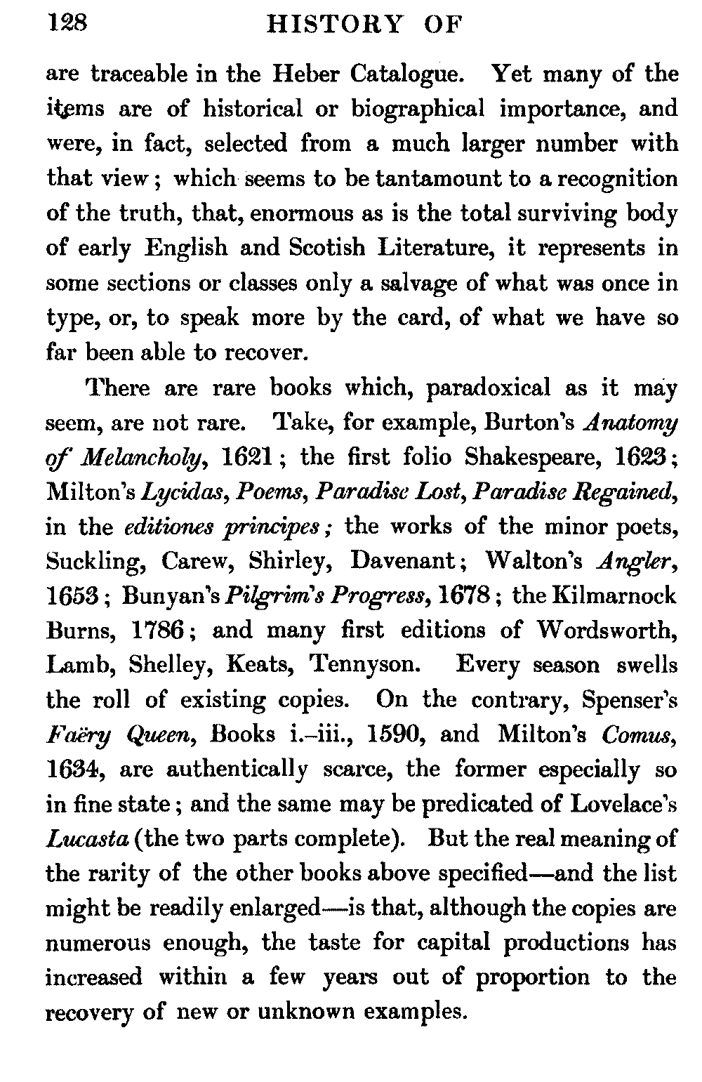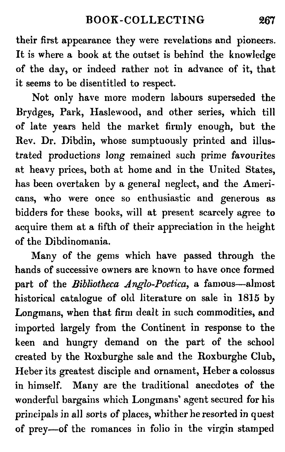 Low prices do not alone establish cheapness. Cheap books are those which are obtained by accident under the current value. In the time of the later Stuarts, Narcissus Luttrell found from one penny to sixpence sufficient to satisfy the shopkeepers with whom he dealt for some of the most precious volumes in our language; and a shilling commanded a Caxton. The Huths of those days could not lay out their money in these things; they had to take up the ancient typography in the form of the classics, or large-paper copies of contemporary historians, or the publications of Hearne.