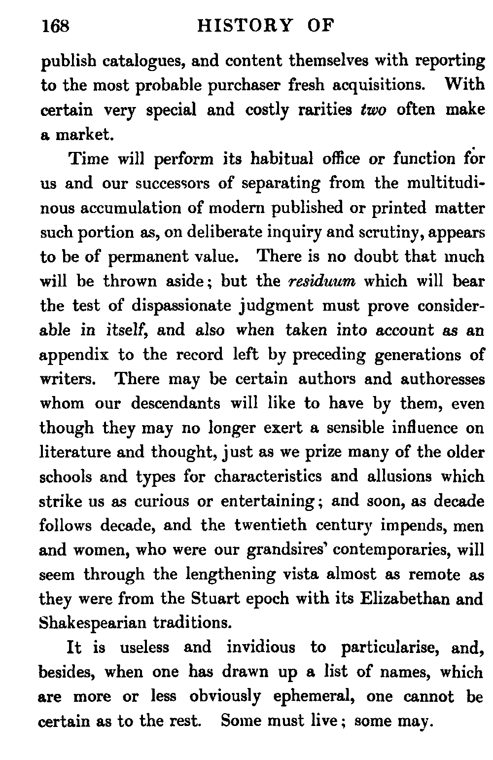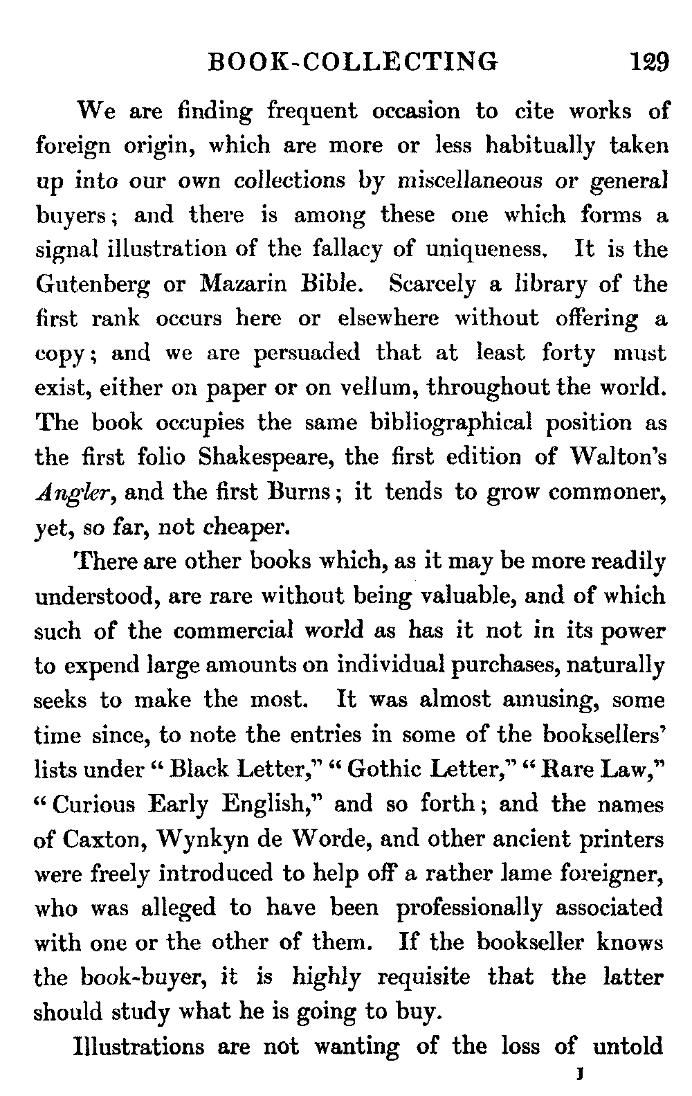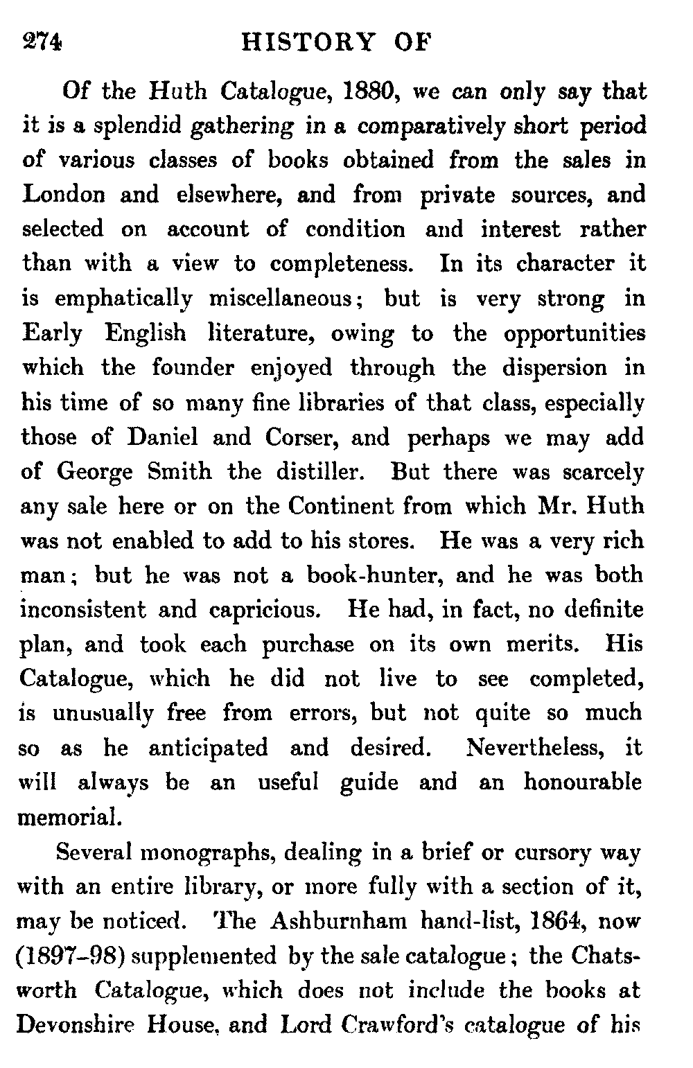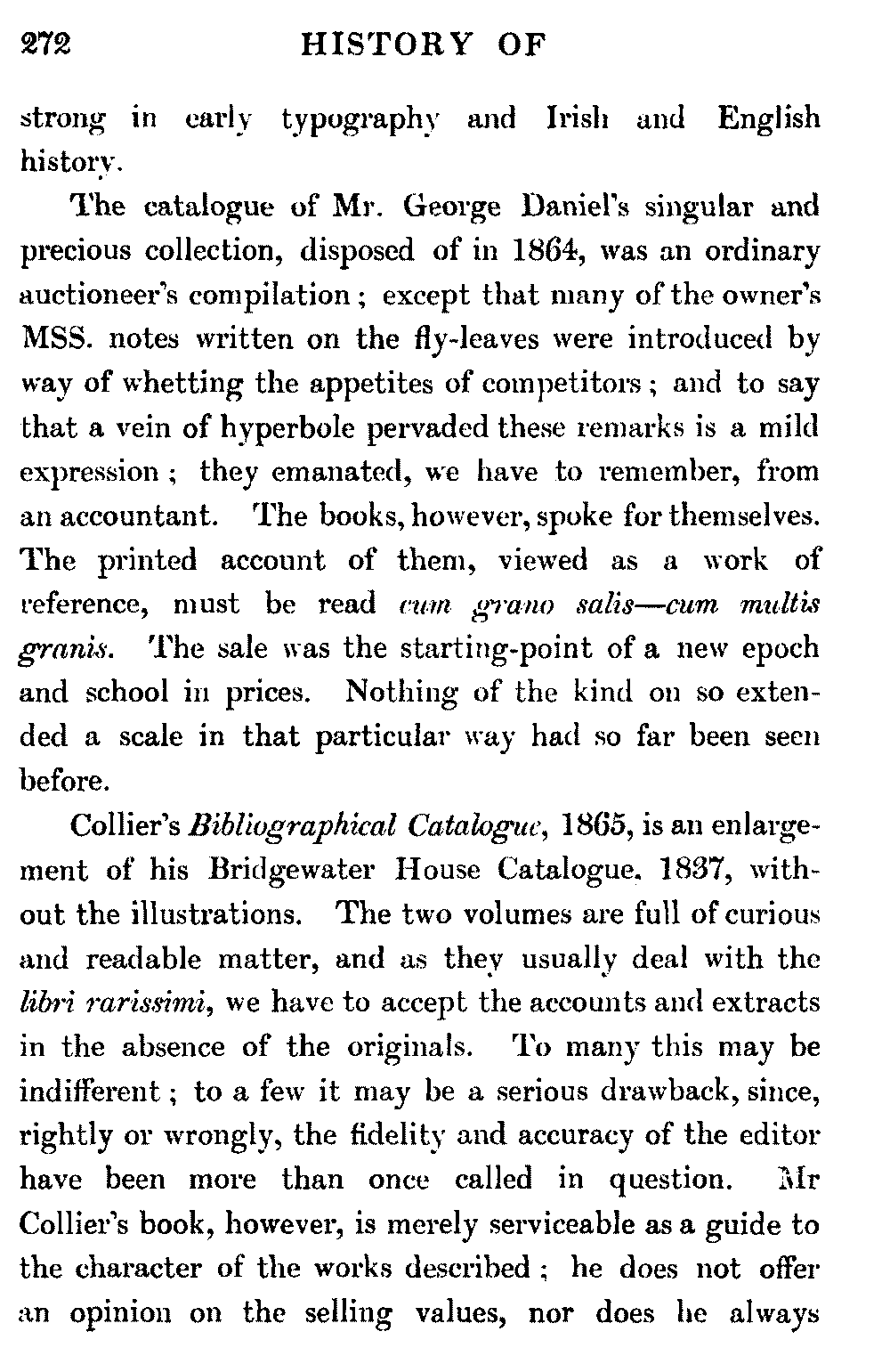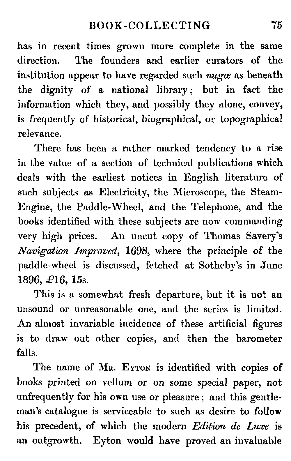 Low prices do not alone establish cheapness. Cheap books are those which are obtained by accident under the current value. In the time of the later Stuarts, Narcissus Luttrell found from one penny to sixpence sufficient to satisfy the shopkeepers with whom he dealt for some of the most precious volumes in our language; and a shilling commanded a Caxton. The Huths of those days could not lay out their money in these things; they had to take up the ancient typography in the form of the classics, or large-paper copies of contemporary historians, or the publications of Hearne.