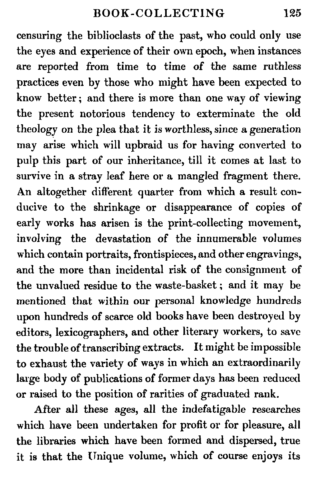 We do not always bear in mind that the rare books of to-day were the current literature not merely of, but long posterior to, the period of their appearance. They suffered two kinds and stages of deterioration and waste. While they remained in vogue among readers and students, they necessarily submitted to a succession of more or less indifferent owners, who regarded without much concern objects which it was in their power to replace without much difficulty. The worst day dawned, however, for our ancient literature, especially that of a fugitive or sentimental class, when it had ceased to be in demand for practical purposes, and was not yet ripe[18] for the men, in whose eyes it could only possess archæological attractions. Independently of destruction by accidental fires, a century or two of neglect proved fatal to millions of volumes or other literary records in pamphlet or broadsheet form; and as tastes changed, the mill and the fire successively consumed the discarded favourites of bygone generations, just as at the present moment we pulp or burn from day to day cartloads of old science, and theology, and law, and fiction, and ever so much more, preparing to grow unique.