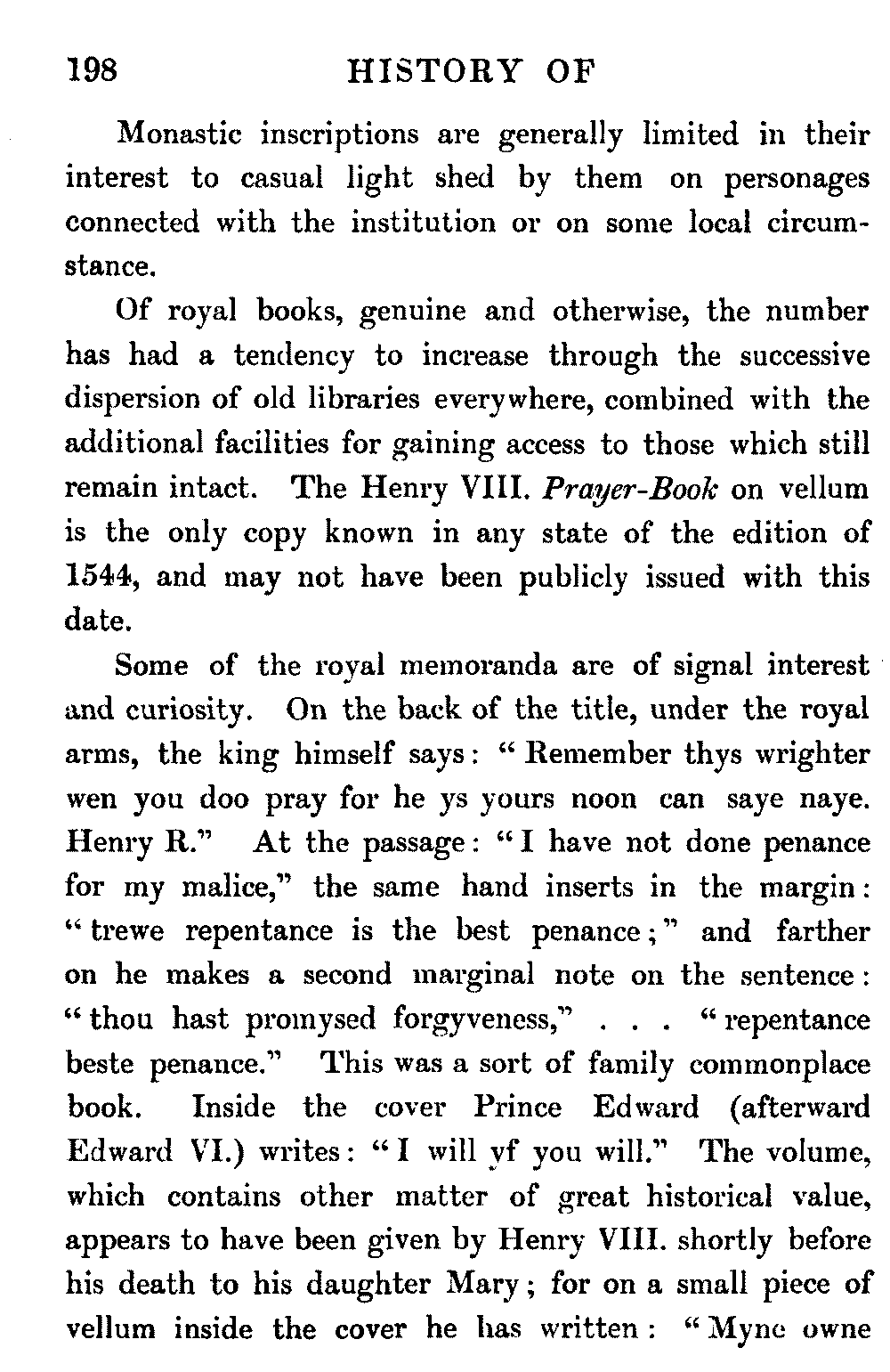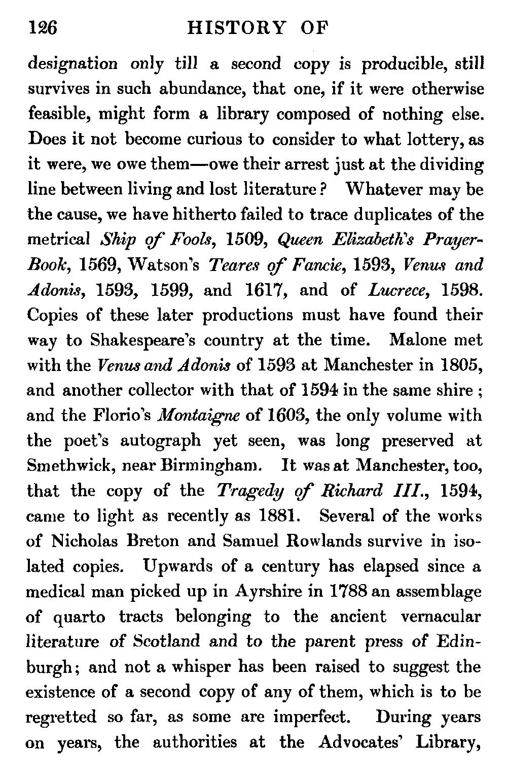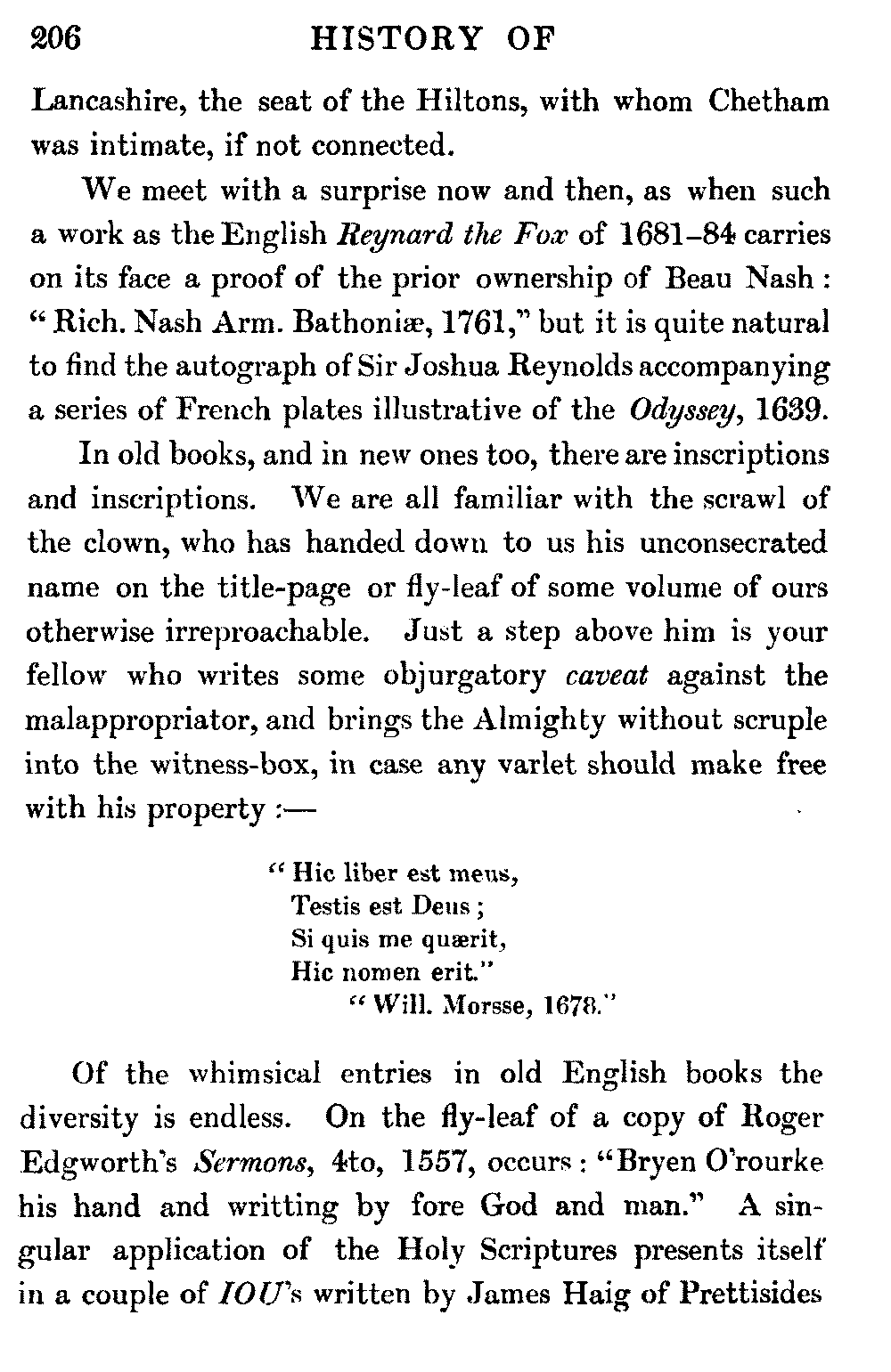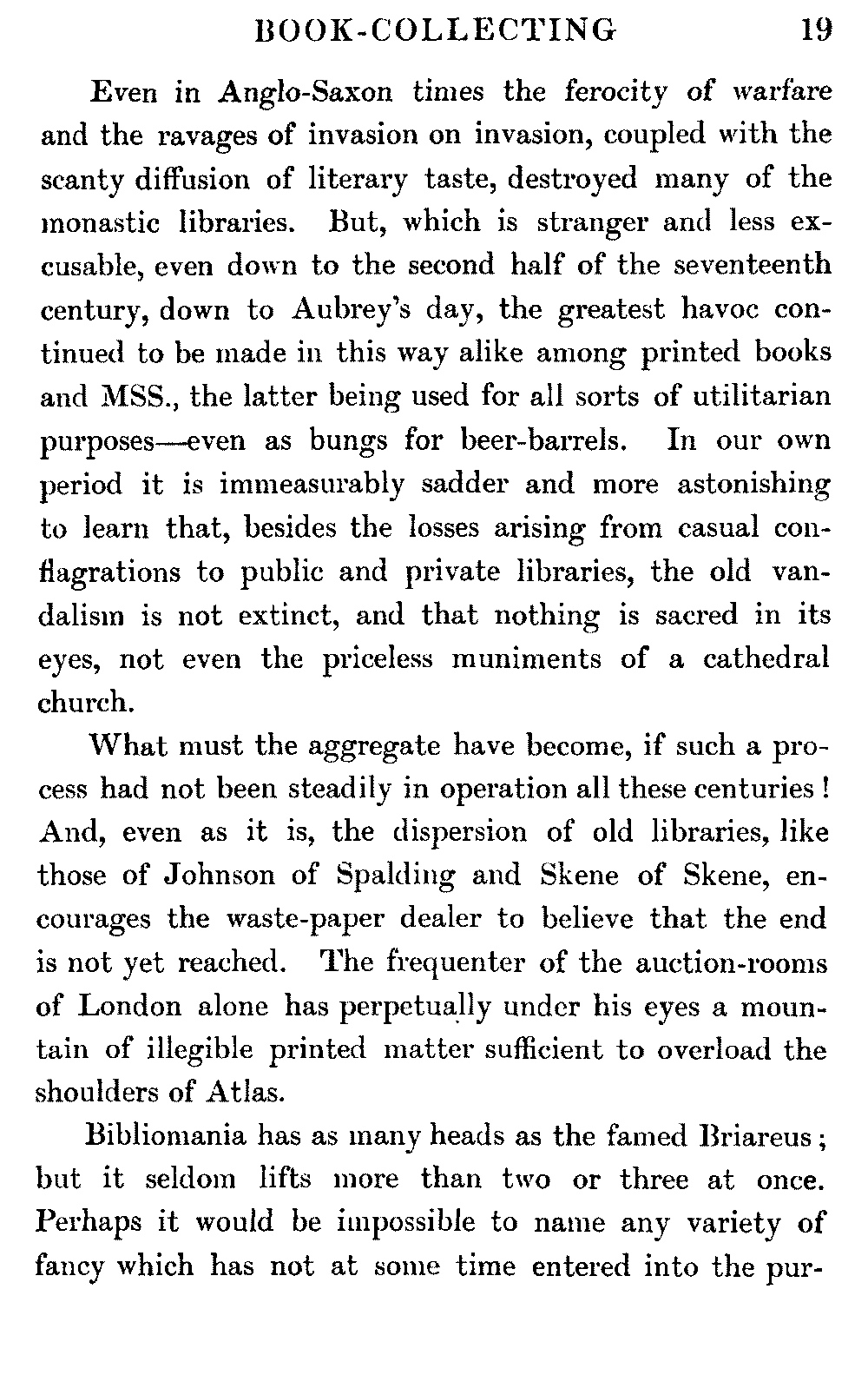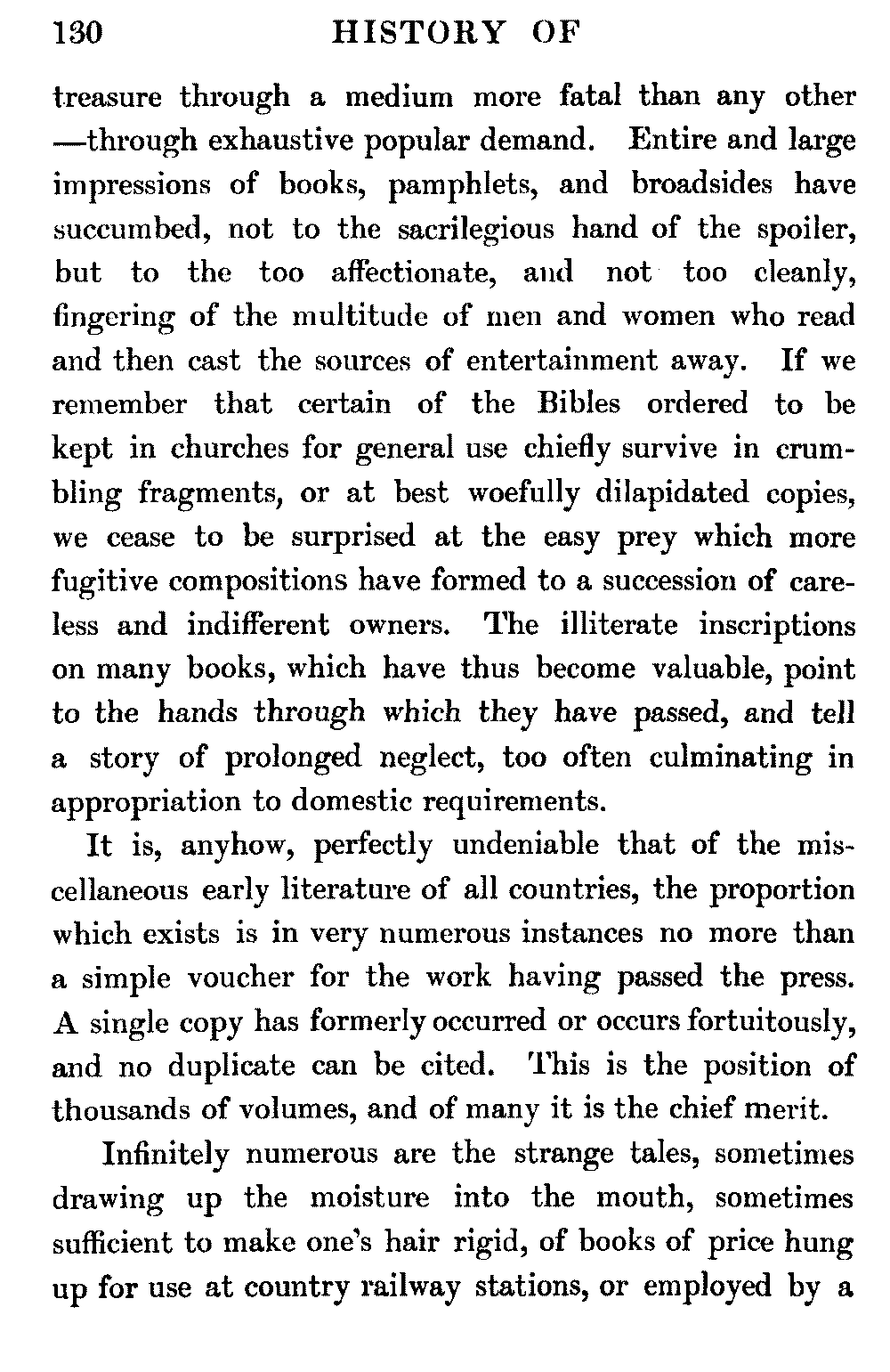 P. 18. Loss of Old Books.—The fate of a heavy percentage of our earlier books—of the earlier books of every people—is curiously and mournfully readable in the illiterate bucolic scrawls, doing duty for autographs and inscriptions, which tell, only too plainly, how such property slowly but surely passed out of sight and existence.