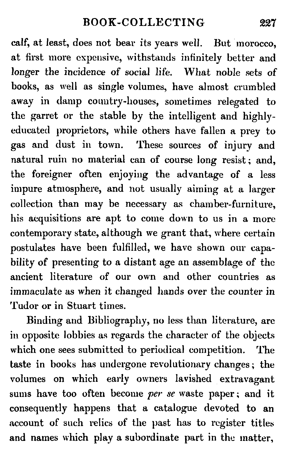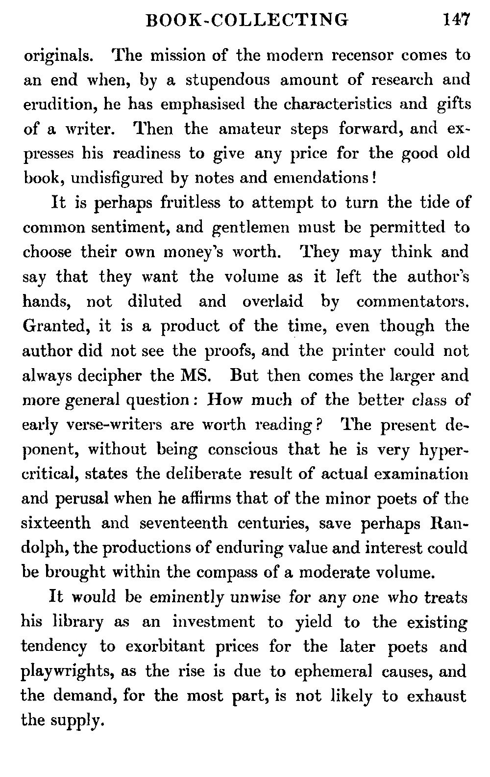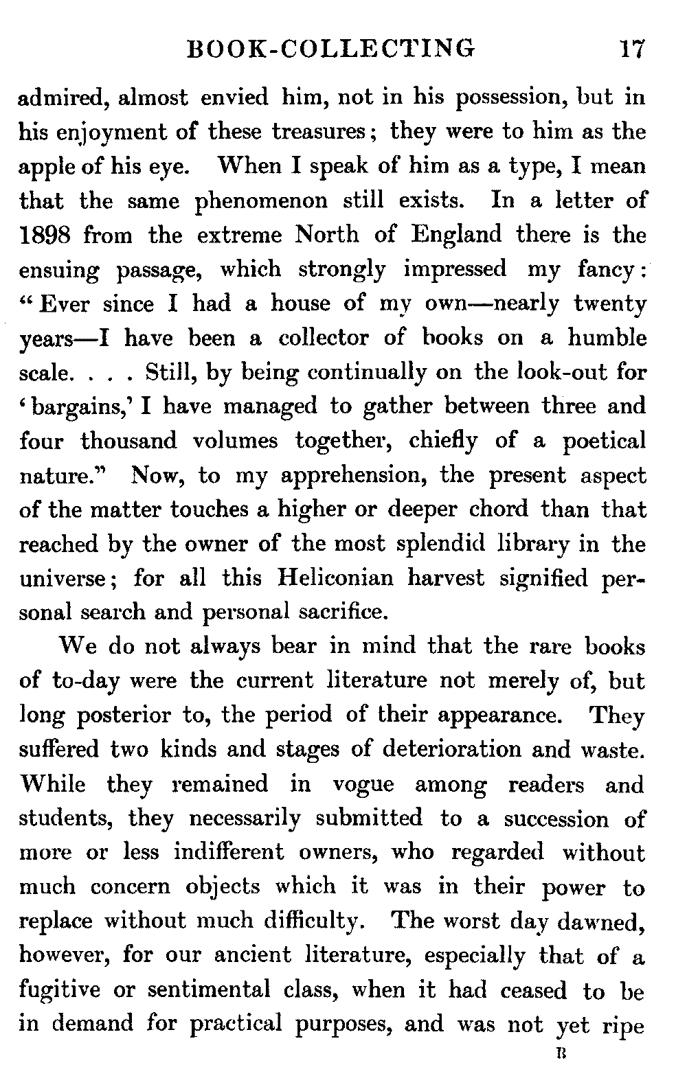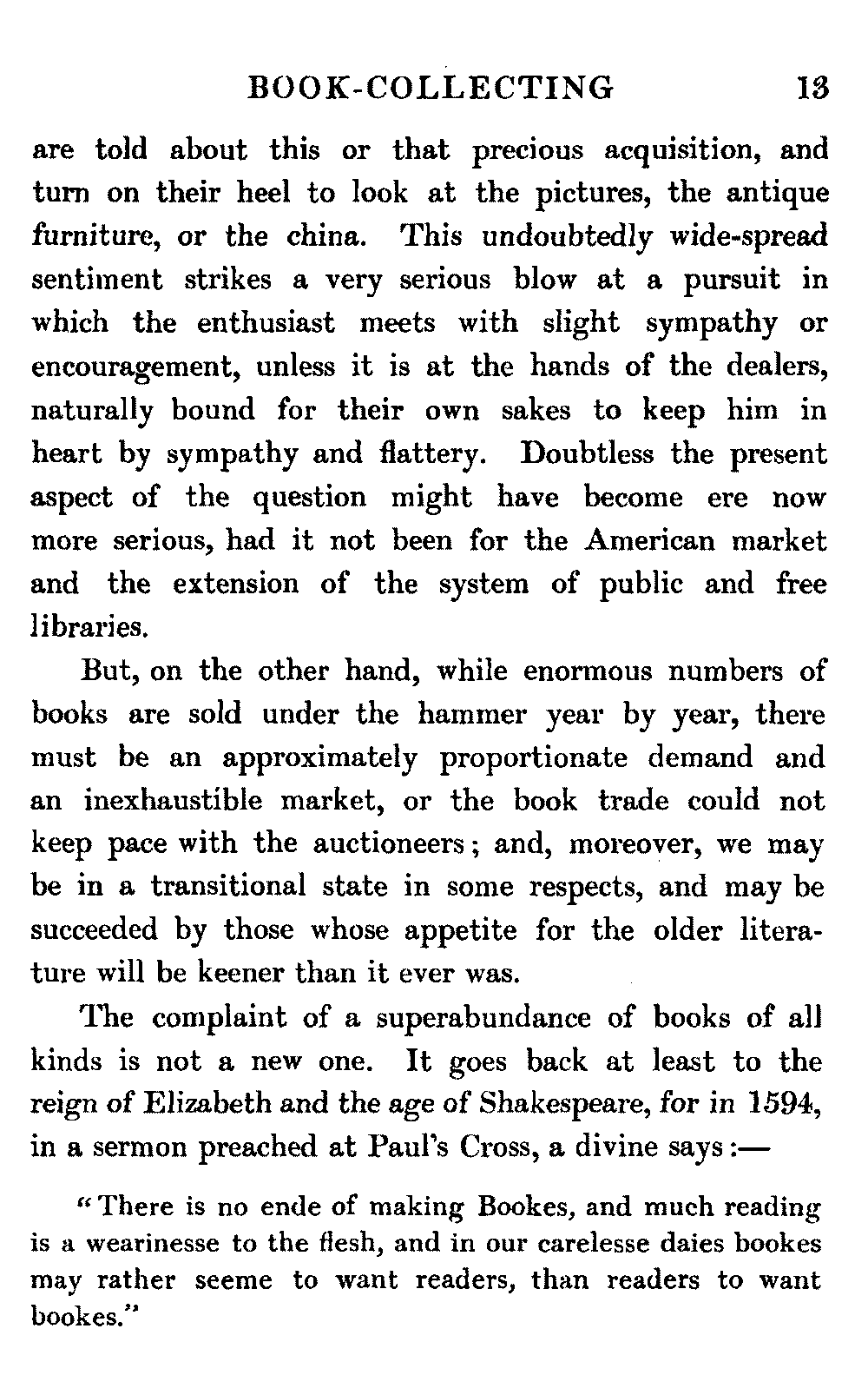 But, on the other hand, while enormous numbers of books are sold under the hammer year by year, there must be an approximately proportionate demand and an inexhaustible market, or the book trade could not keep pace with the auctioneers; and, moreover, we may be in a transitional state in some respects, and may be succeeded by those whose appetite for the older literature will be keener than it ever was.