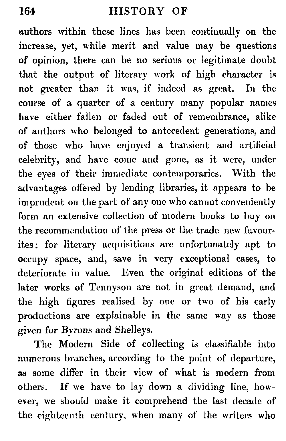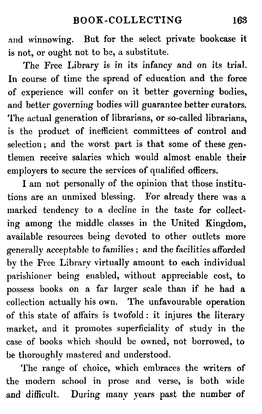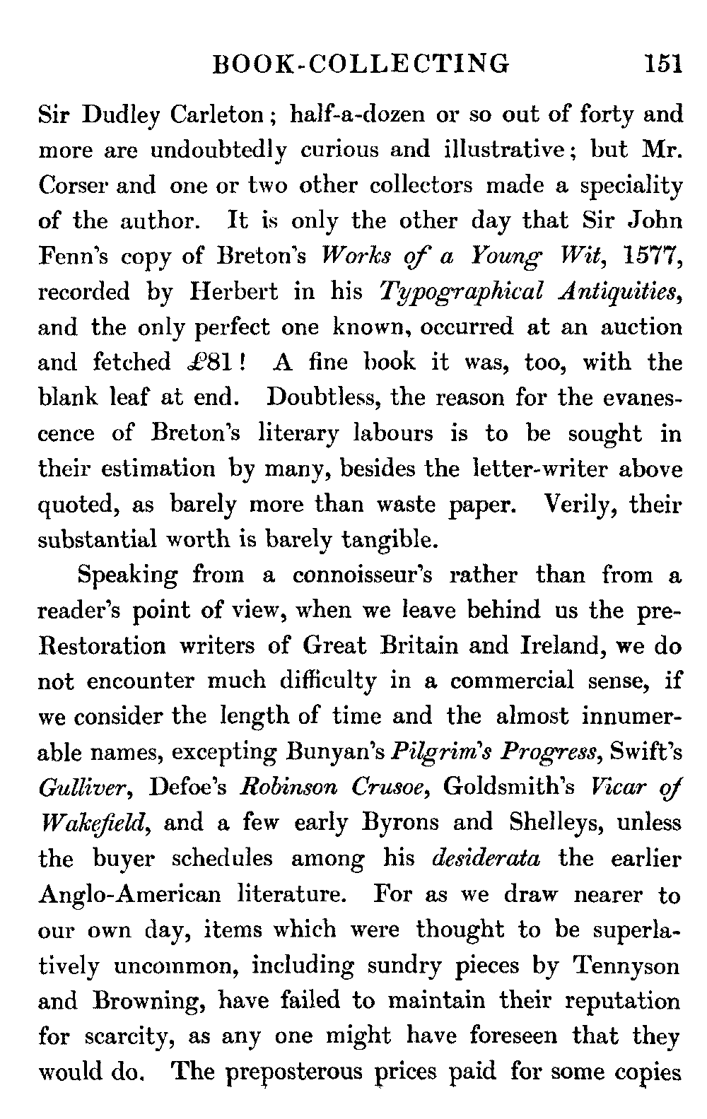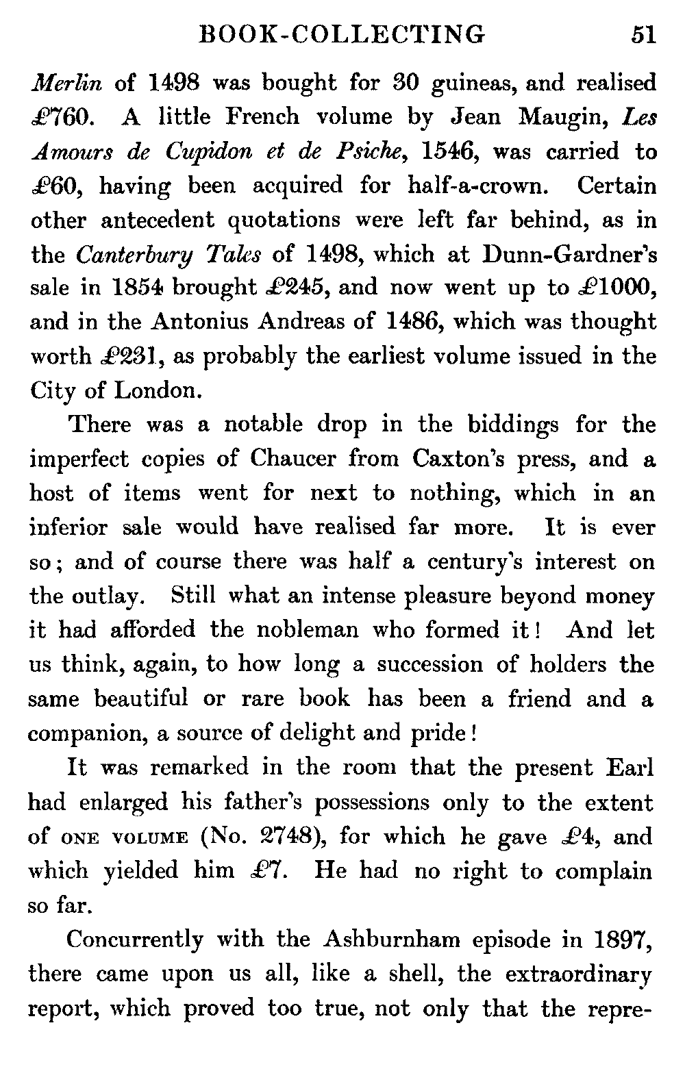 But, on the other hand, while enormous numbers of books are sold under the hammer year by year, there must be an approximately proportionate demand and an inexhaustible market, or the book trade could not keep pace with the auctioneers; and, moreover, we may be in a transitional state in some respects, and may be succeeded by those whose appetite for the older literature will be keener than it ever was.