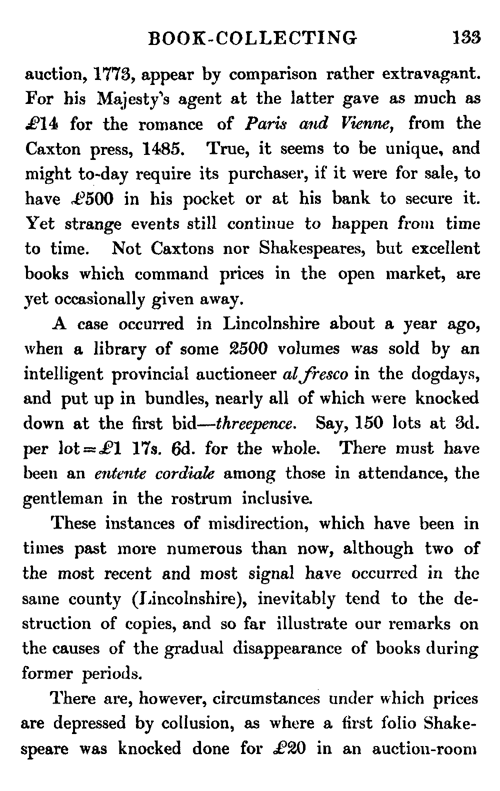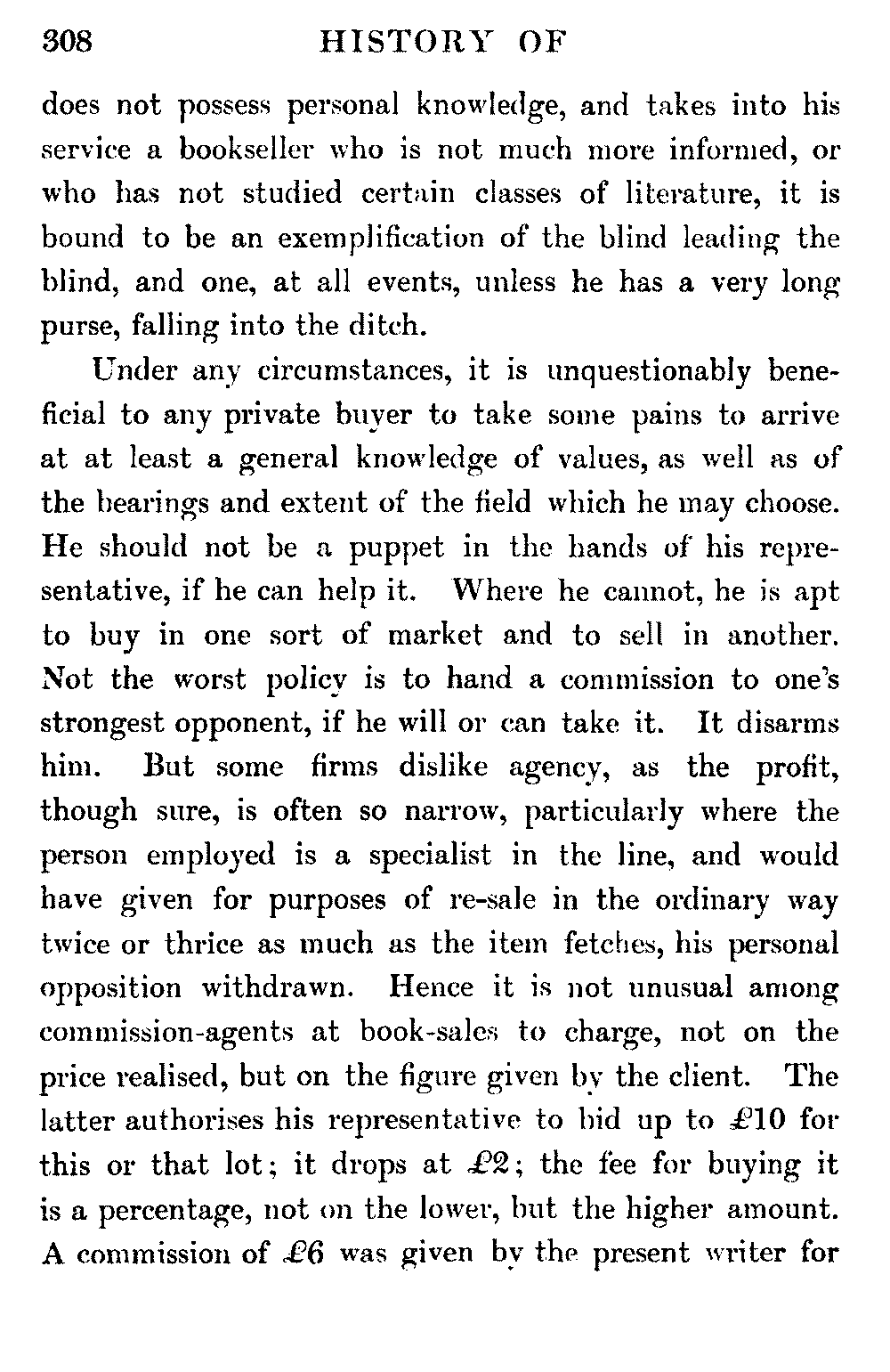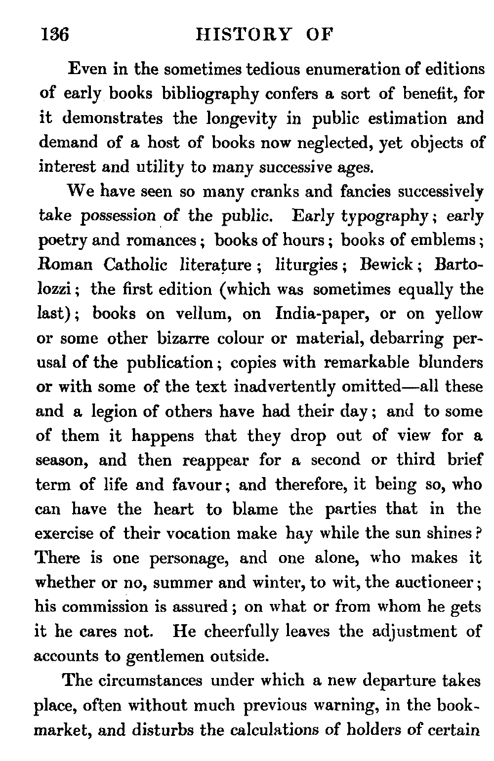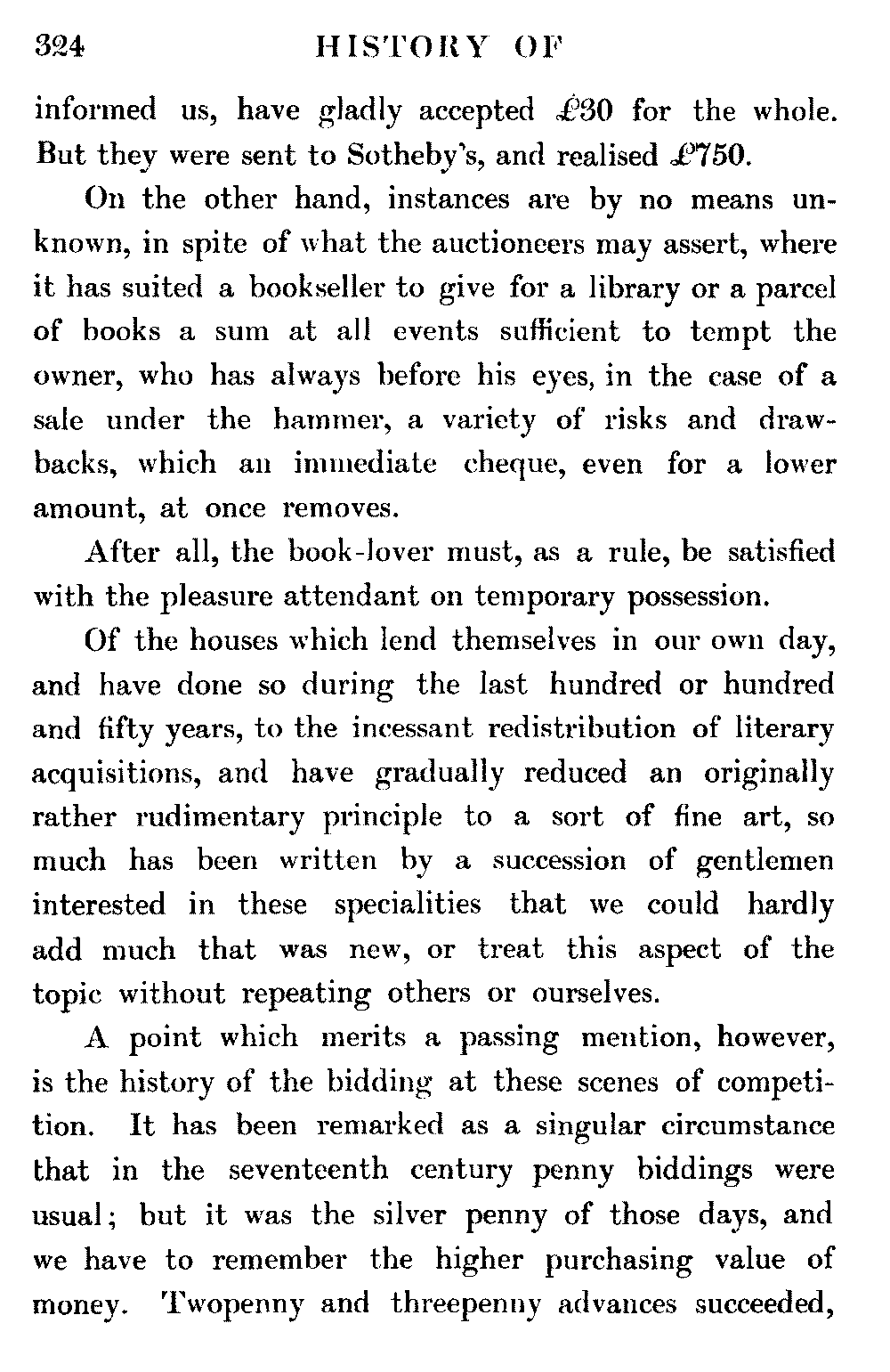 On the other hand, instances are by no means unknown, in spite of what the auctioneers may assert, where it has suited a bookseller to give for a library or a parcel of books a sum at all events sufficient to tempt the owner, who has always before his eyes, in the case of a sale under the hammer, a variety of risks and draw-backs, which an immediate cheque, even for a lower amount, at once removes.