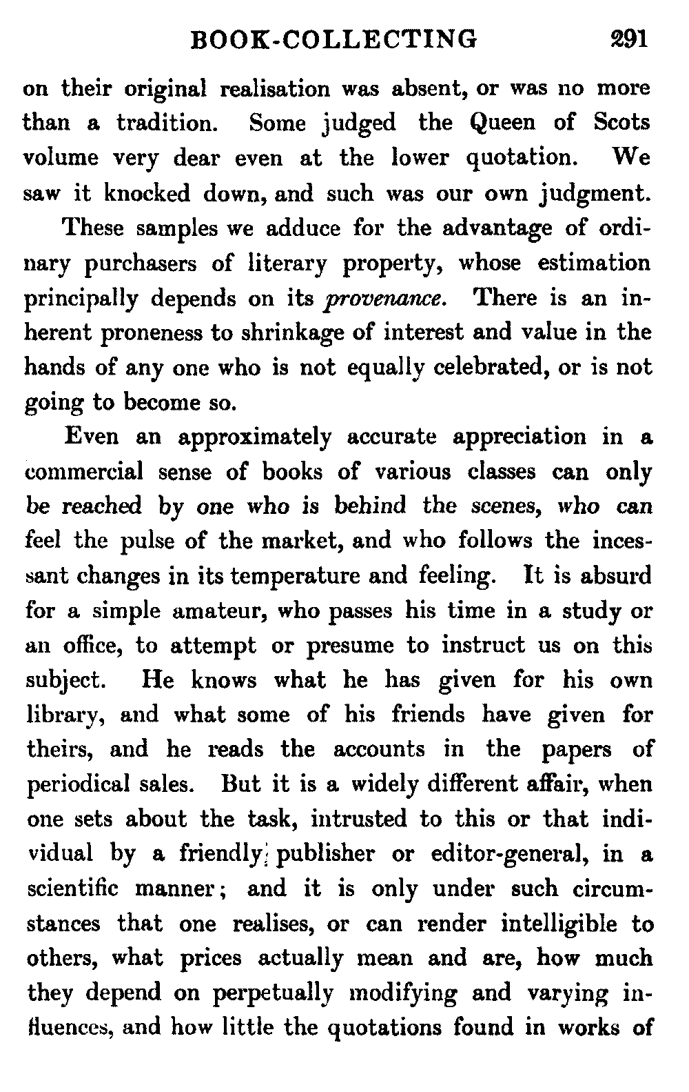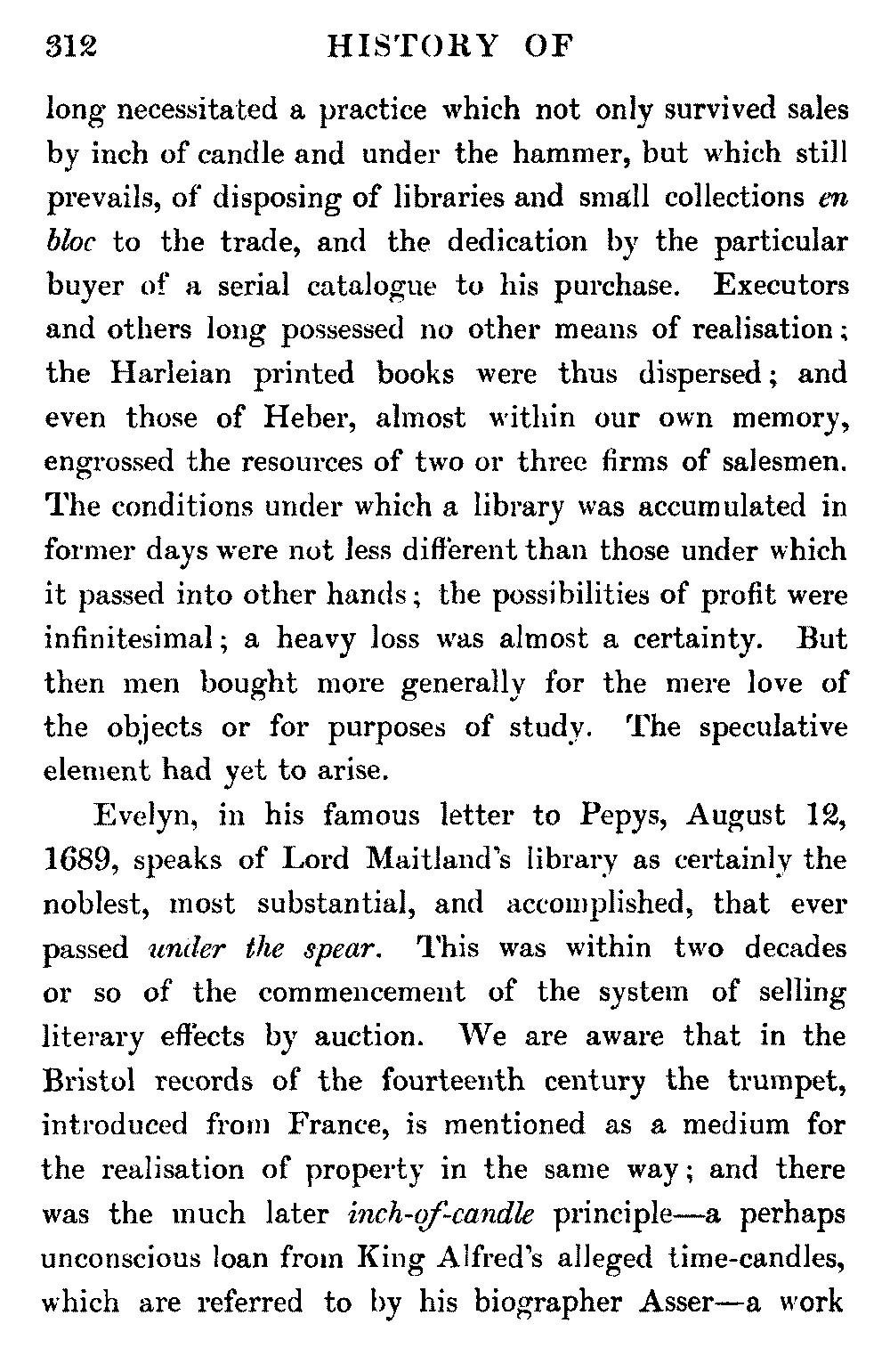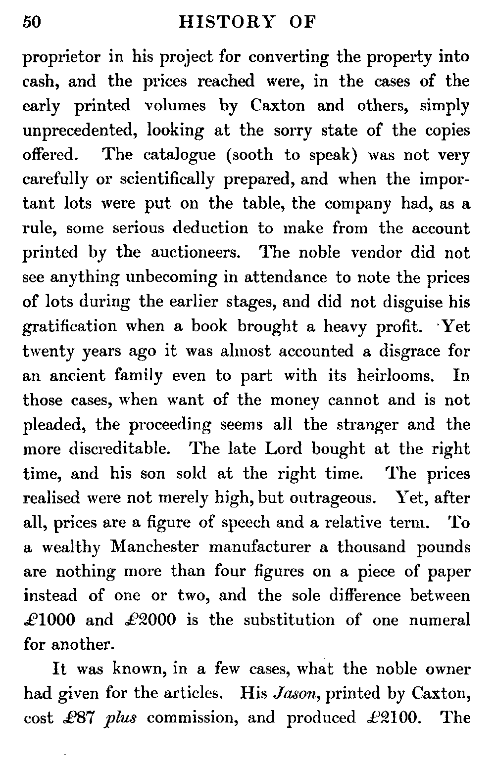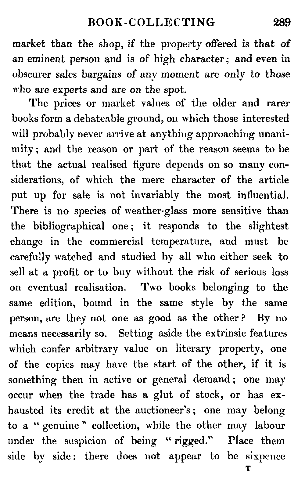 On the other hand, instances are by no means unknown, in spite of what the auctioneers may assert, where it has suited a bookseller to give for a library or a parcel of books a sum at all events sufficient to tempt the owner, who has always before his eyes, in the case of a sale under the hammer, a variety of risks and draw-backs, which an immediate cheque, even for a lower amount, at once removes.
