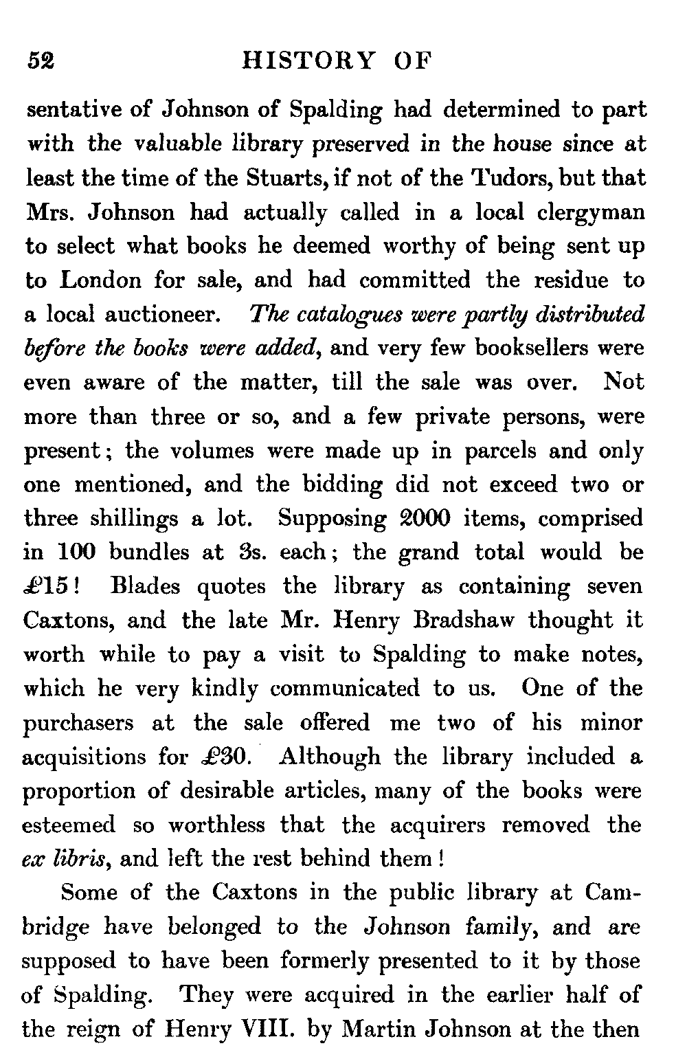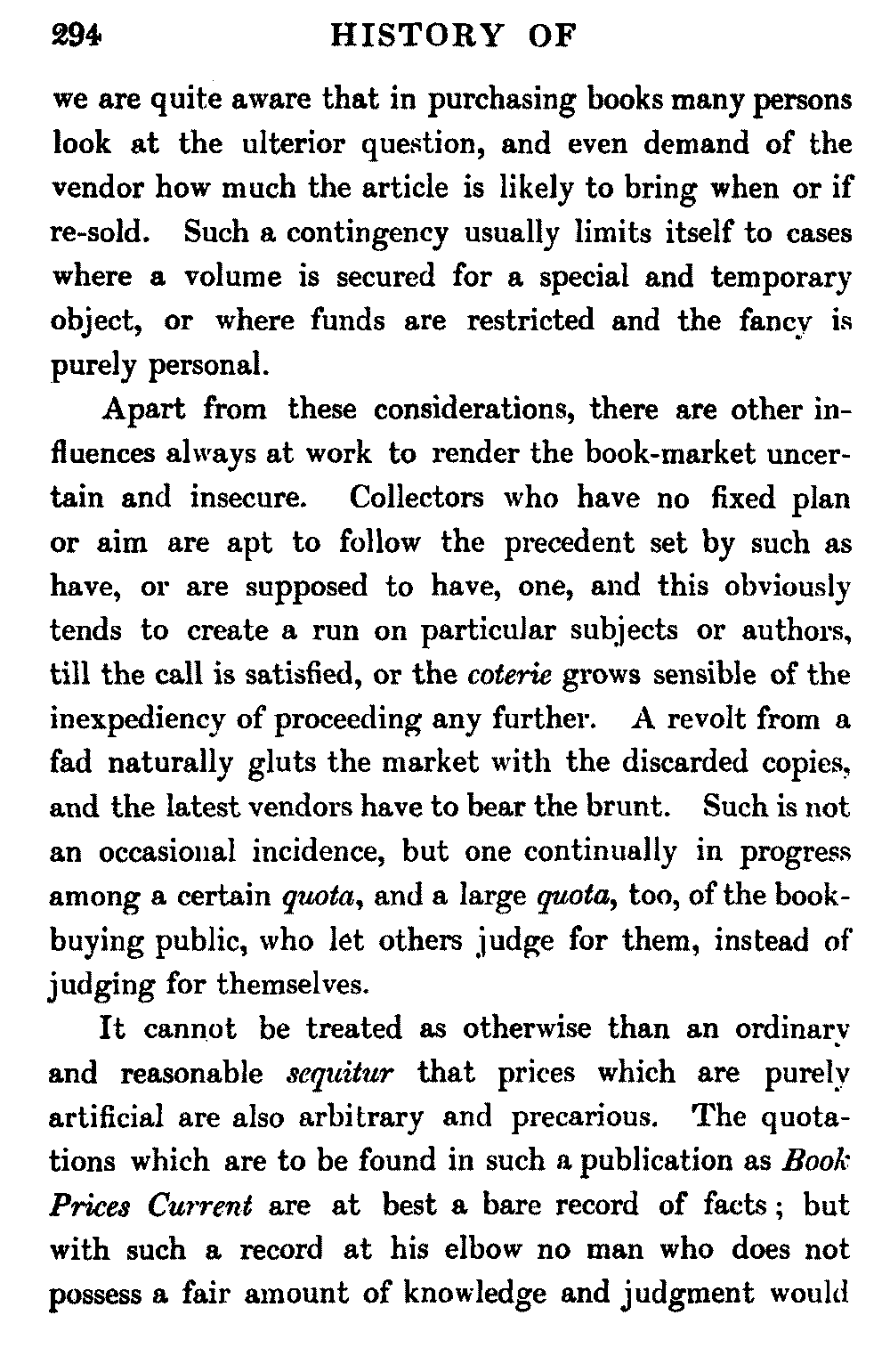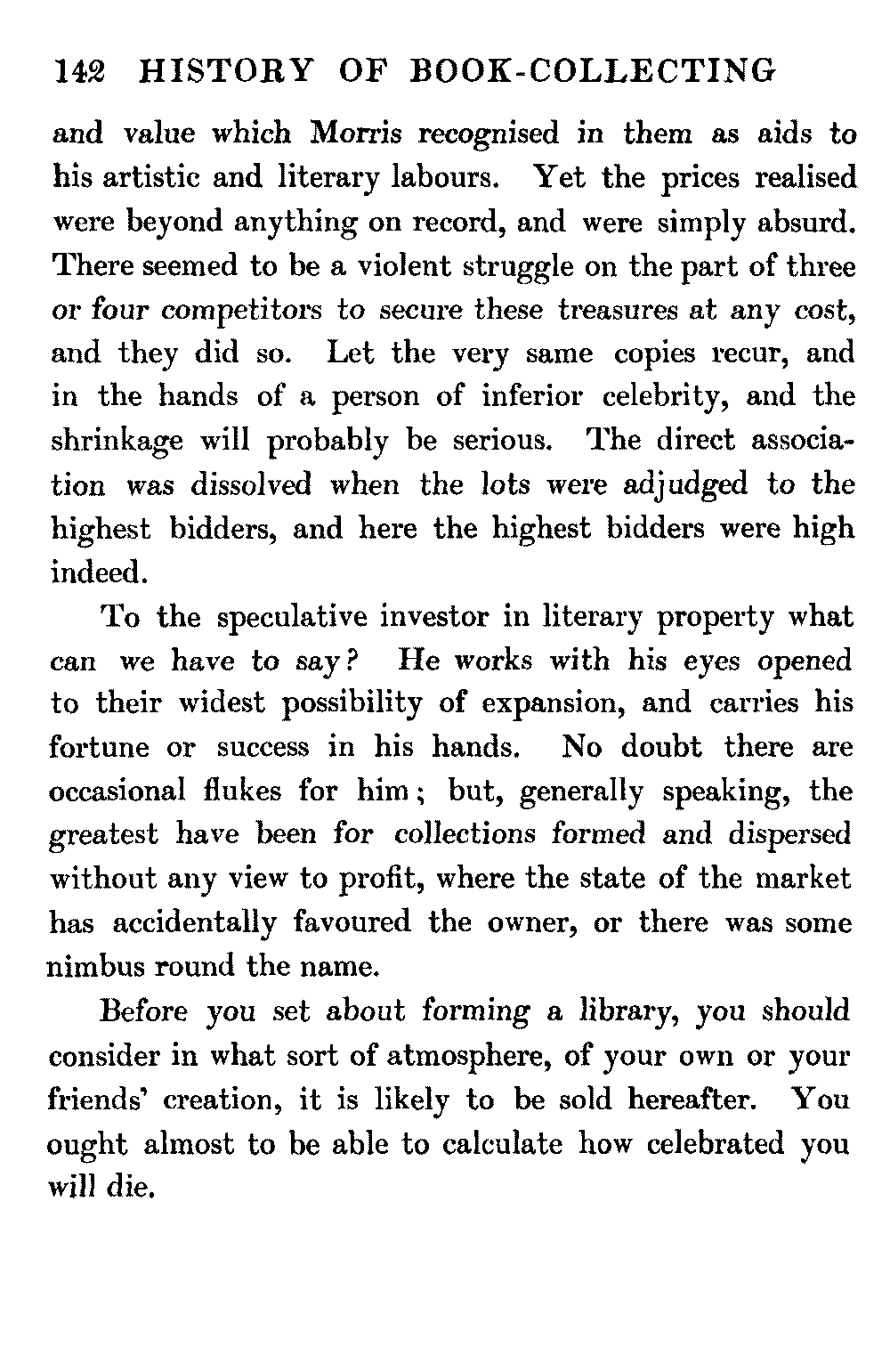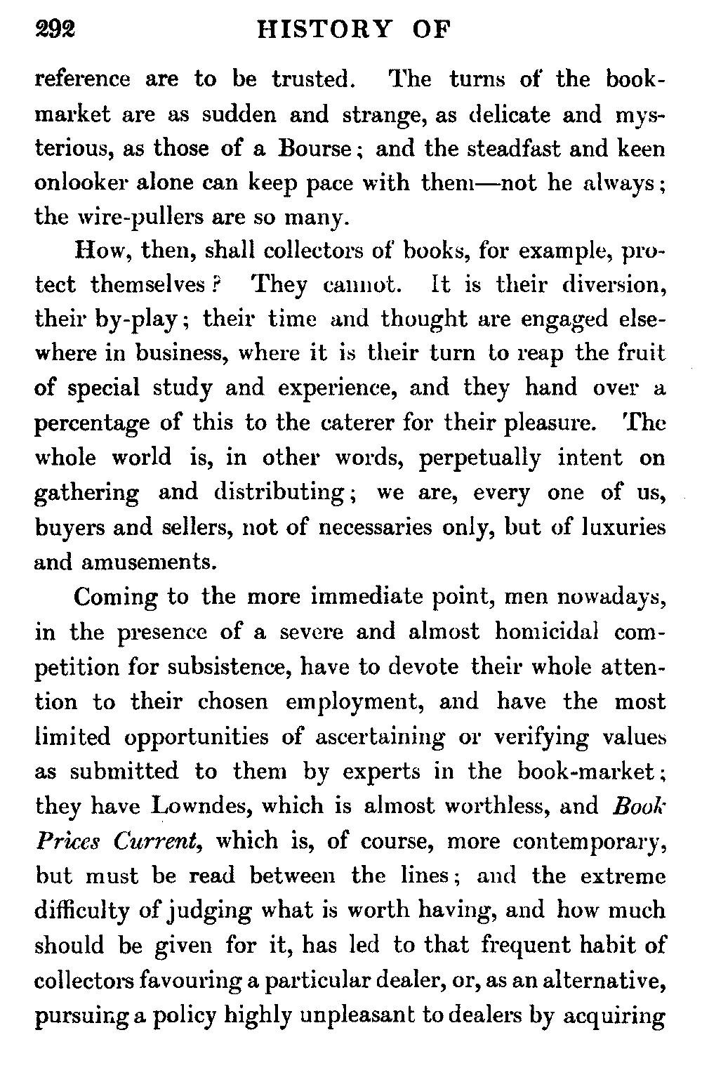 On the other hand, instances are by no means unknown, in spite of what the auctioneers may assert, where it has suited a bookseller to give for a library or a parcel of books a sum at all events sufficient to tempt the owner, who has always before his eyes, in the case of a sale under the hammer, a variety of risks and draw-backs, which an immediate cheque, even for a lower amount, at once removes.